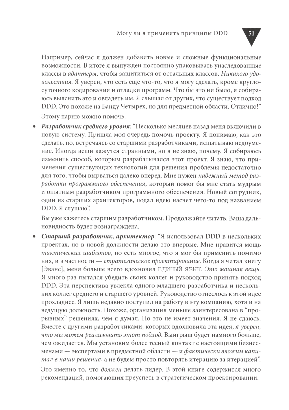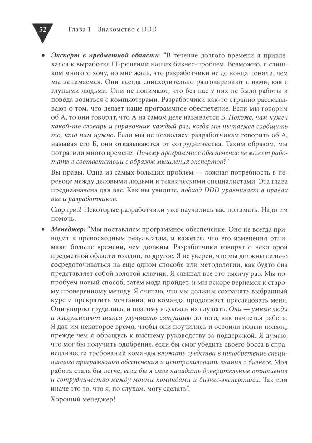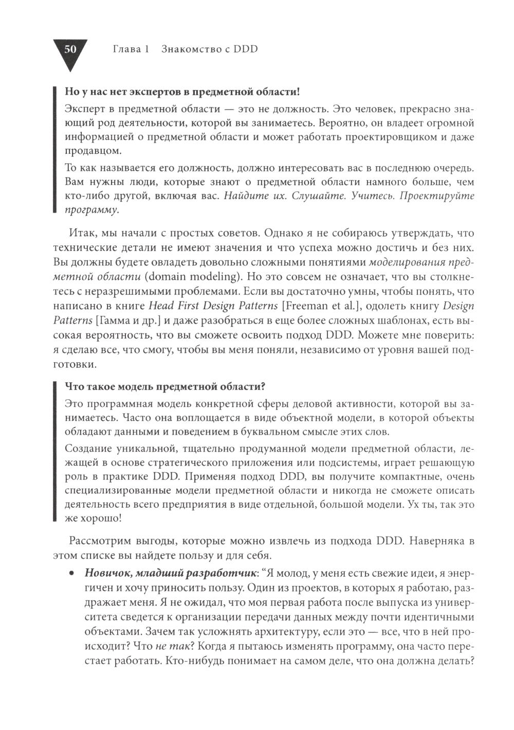 Книга посвящена методам предметно-ориентированного проектирования (DDD). Автор придерживается принципа «от общего к частному», плавно переходя от стратегических шаблонов к средствам тактического программирования. Вон Вернон описывает специализированные подходы к реализации систем на основе современной архитектуры, подчеркивая важность ориентации на предметную область с учетом технических ограничений. Опираясь на знаменитую книгу Эрика Эванса Предметно-ориентированное проектирование (DDD): структуризация сложных программных систем, автор описывает методы DDD на примерах известных предметных областей. Каждый принцип подкреплен реалистичными примерами на языке Java, которые представляют интерес и для программистов, работающих на языке C#. Все примеры объединены в рамках единого сценария разработки системы SaaS для многоарендной среды на основе методологии Scrum. Автор выходит далеко за пределы «облегченного подхода DDD», в котором принципы DDD рассматриваются только с технической точки зрения, и показывает, как извлечь максимальную пользу из стратегических шаблонов предметно-ориентированного проектирования с помощью ограниченных контекстов, карт контекстов и единого языка. Используя описанные методы и приведенные примеры, разработчики смогут сократить время выхода на рынок и повысить качество проектов, создавая более гибкое, масштабируемое и ориентированное на достижение бизнес-целей программное обеспечение.| Издательство | Диалектика |