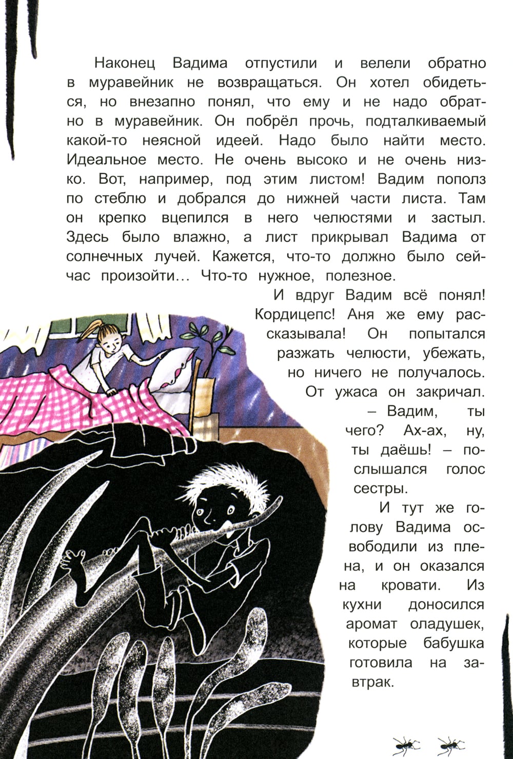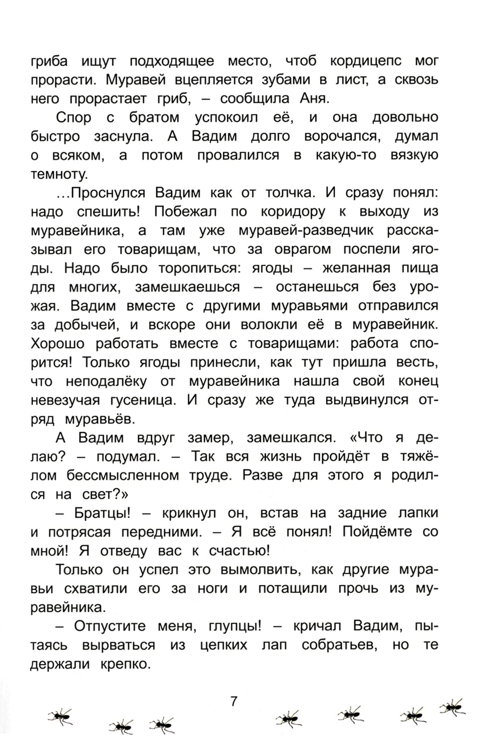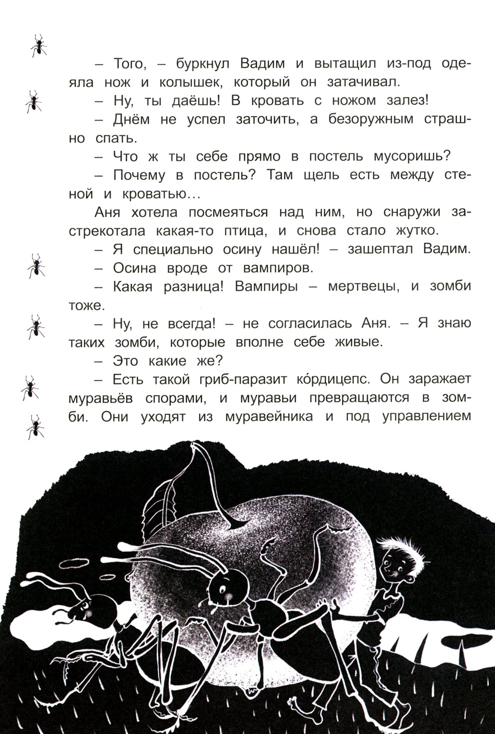 В летних приключения Ани и Вадима - ответы на самые разные вопросы: какой вирус делает носителя агрессивным и заставляет нападать на окружающих; куда водит тараканов изумрудная оса; зачем лягушке десять лап; что в таинственном мешочке на животе краба-долгожителя; зачем муравью встречаться с коровой; всякую ли медузу нужно освобождать из неволи; может ли кот съесть бабушку? И, самое главное, как понять, зомби ты сам или живой самостоятельный человек?