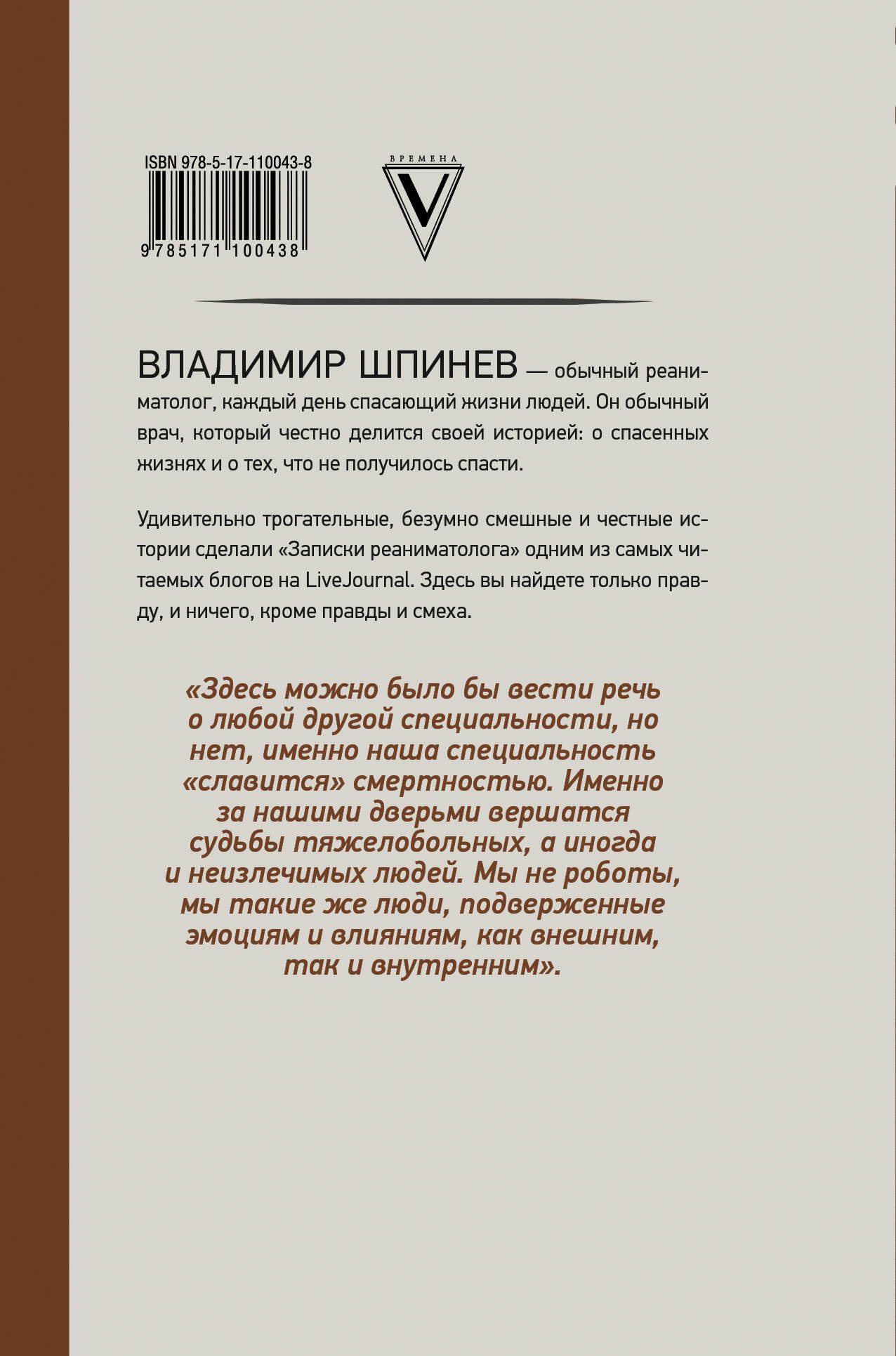 «Записки реаниматолога» - один из самых читаемых блогов на LiveJournal. Книга - собрание честных, удивительных, порой страшных и очень трогательных историй о самых обычных пациентах от лица их лечащего врача. Ангелы и демоны современной российской медицины, профессионализм и человеческие эмоции, пресловутая схватка жизни и смерти - под корешком книги Владимира Шпинева.