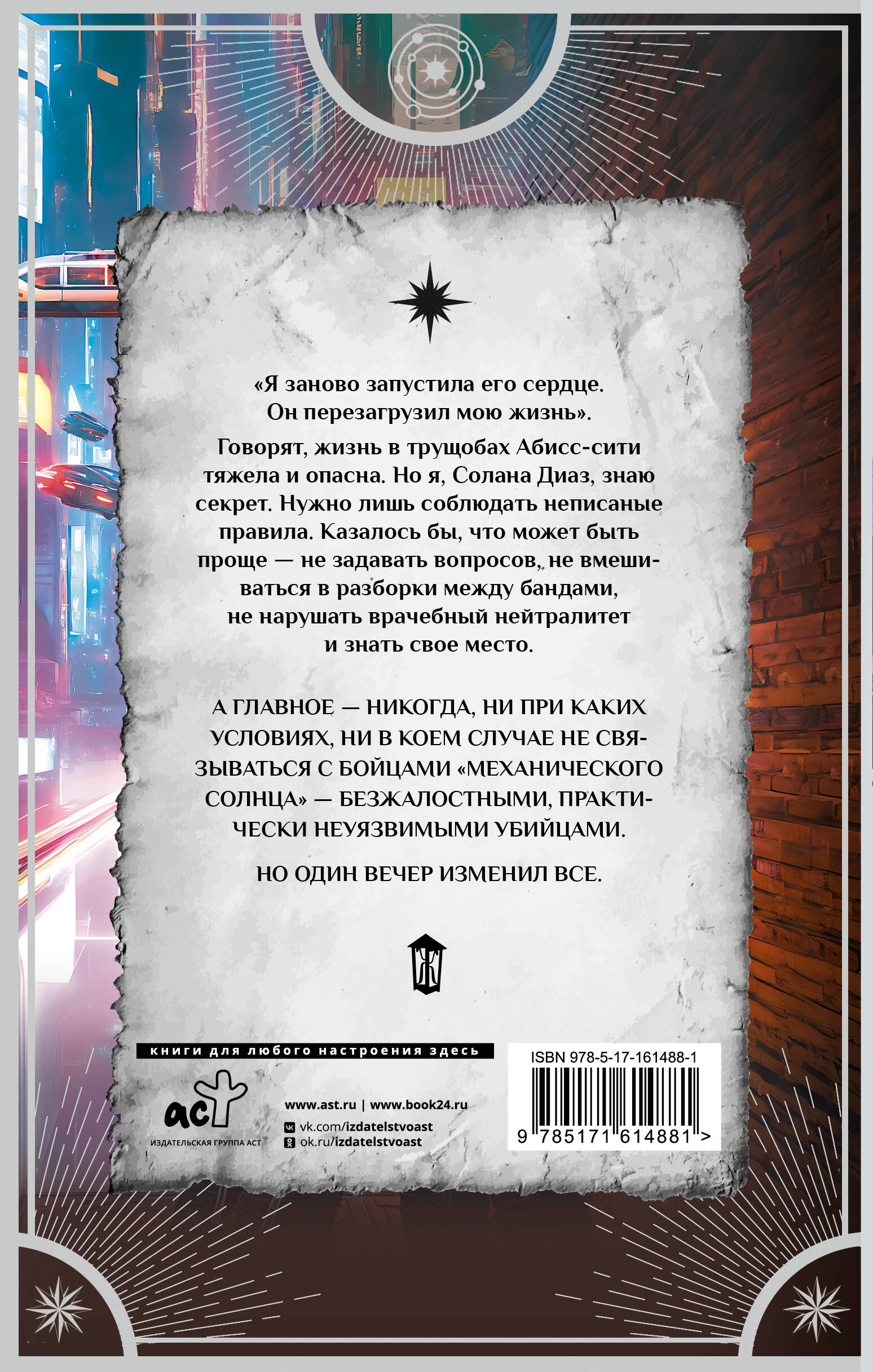 "Я заново запустила его сердце. Он перезагрузил мою жизнь". Говорят, жизнь в трущобах Абисс-сити тяжела и опасна. Но я, Солана Диаз, знаю секрет. Нужно лишь соблюдать неписаные правила. Казалось бы, что может быть проще - не задавать вопросов, не вмешиваться в разборки между бандами, не нарушать врачебный нейтралитет и знать свое место. А главное - никогда, ни при каких условиях, ни в коем случае не связываться с бойцами "Механического солнца" - безжалостными, практически неуязвимыми убийцами. Но один вечер изменил все.| Издательство | Издательство "АСТ" |
