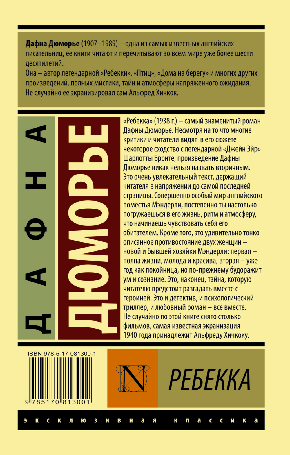 Это и детектив, и психологический триллер, и любовный роман. Не случайно по этой книге снято столько фильмов; самая известная экранизация 1940 года принадлежит Альфреду Хичкоку.
