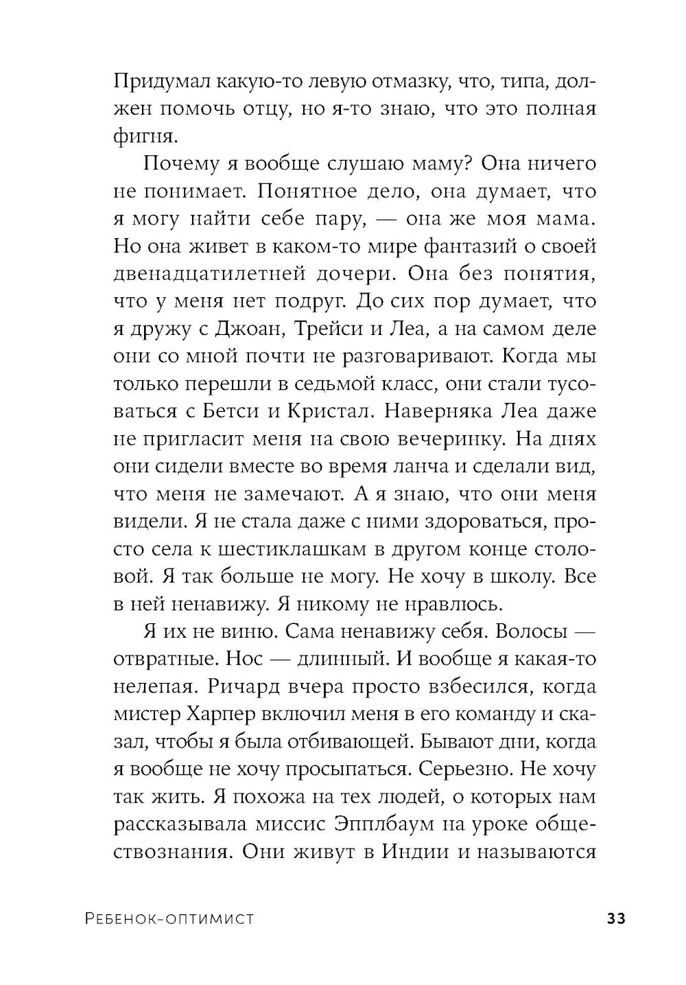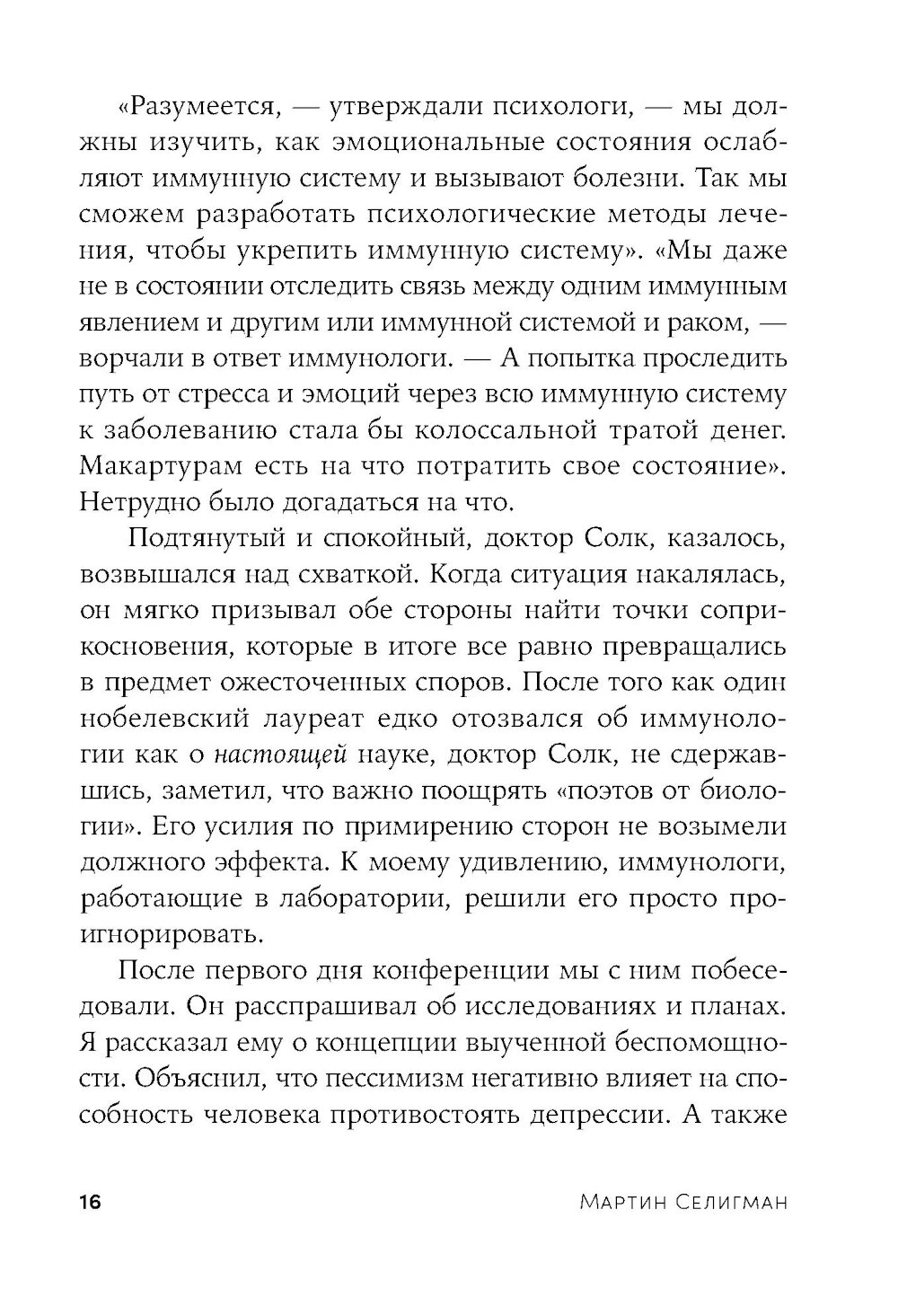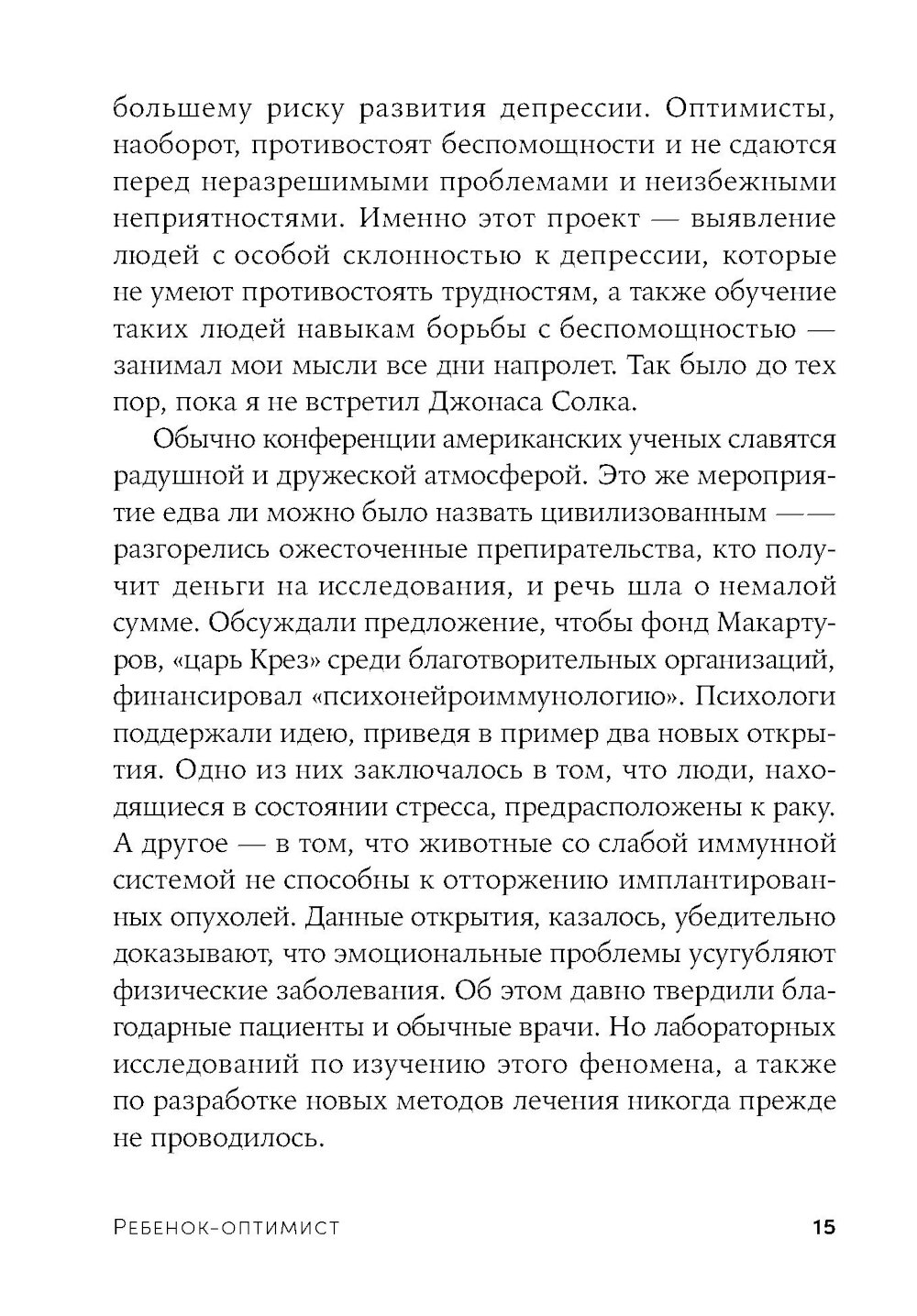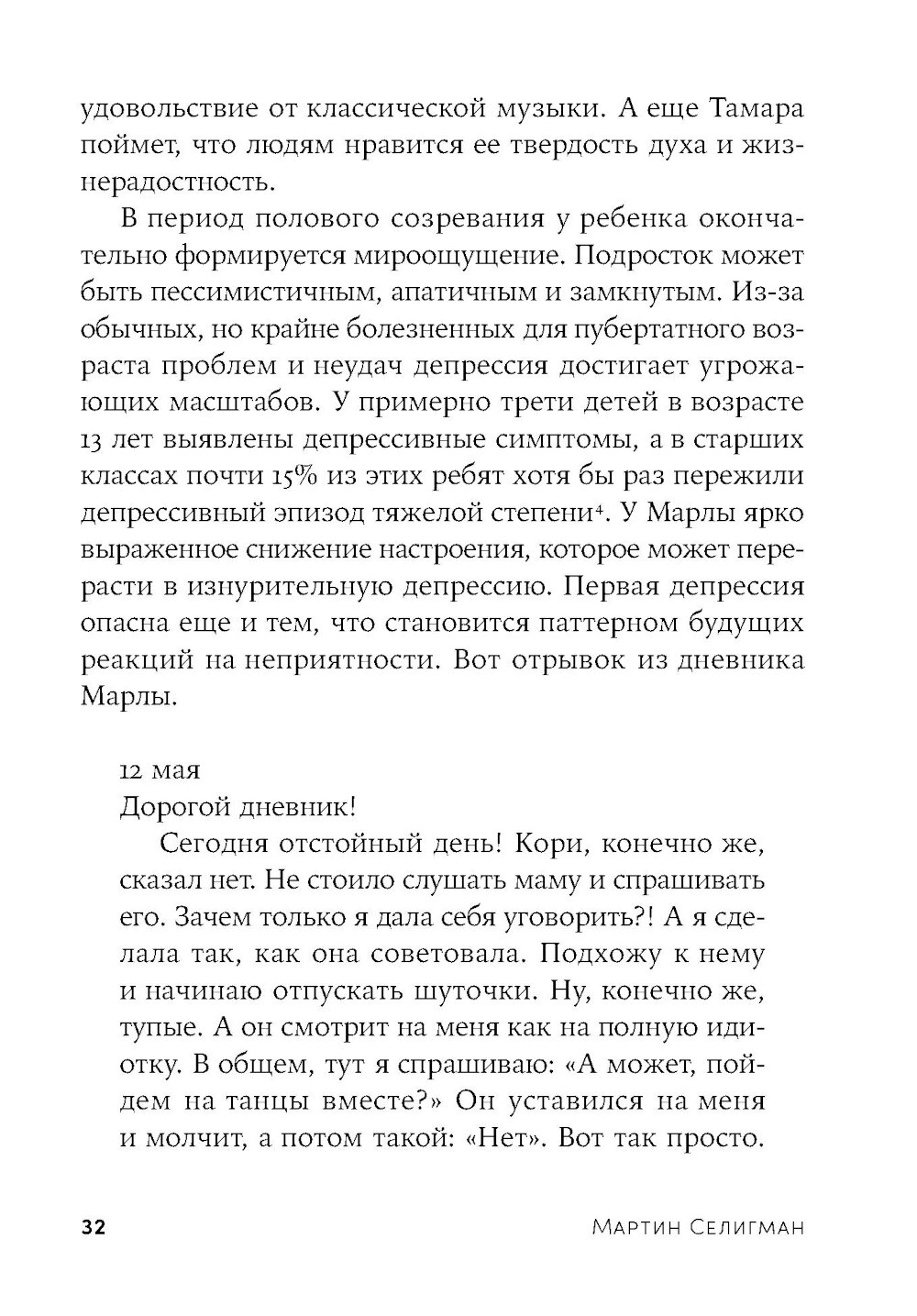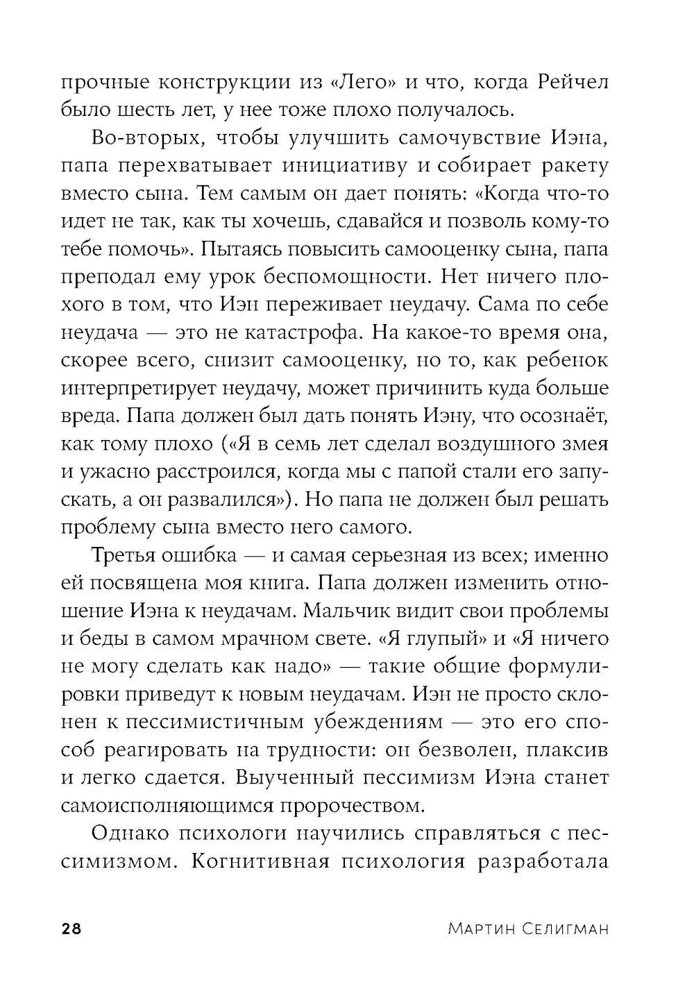 Задумывались ли вы, почему одни дети легко справляются с неудачами, а другие опускают руки при малейших трудностях? Мартин Селигман, всемирно известный психолог и основоположник позитивной психологии, утверждает, что правильные реакции ребенка на неудачи и его поддержка со стороны родителей становятся определяющими для его будущего становления. Автор утверждает, что родители способны научить детей применять навыки оптимизма, которые могут победить депрессию, повысить успеваемость в школе и улучшить физическое здоровье. Эти навыки дают детям необходимую им устойчивость, чтобы с уверенностью подойти к подростковому возрасту и взрослой жизни. В книге также представлены эффективные техники, приемы и упражнения, основанные на методах когнитивной терапии. С их помощью ребенок научится решать проблемы, противостоять стрессу и строить здоровые отношения с родными и друзьями.| Издательство | Альпина Паблишер |