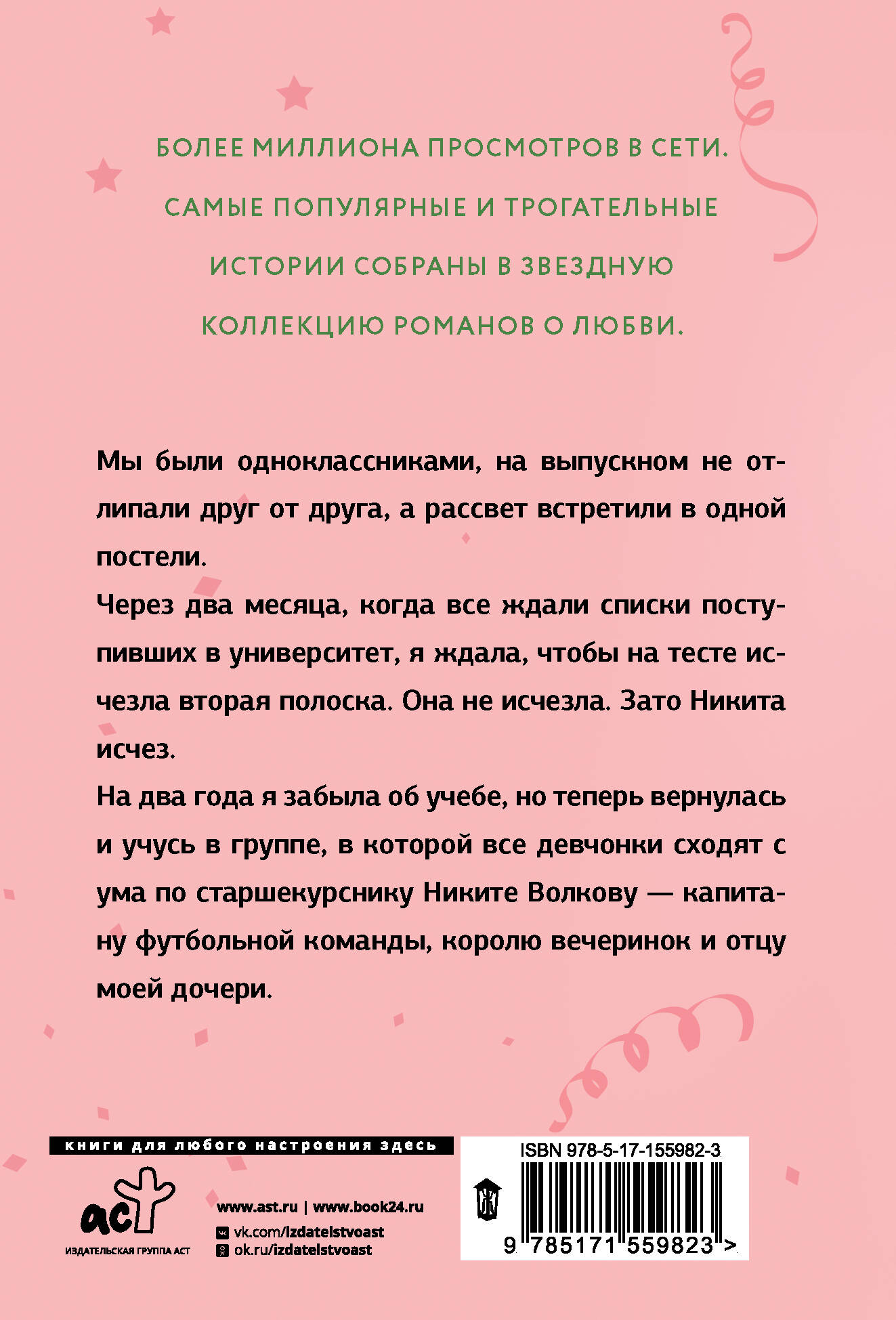 Мы были одноклассниками, на выпускном не отлипали друг от друга, а рассвет встретили в одной постели. Через два месяца, когда все ждали списки поступивших в университет, я ждала, чтобы на тесте исчезла вторая полоска. Она не исчезла. Зато Никита исчез. На два года я забыла об учебе, но теперь вернулась и учусь в группе, в которой все девчонки сходят с ума по старшекурснику Никите Волкову - капитану футбольной команды, королю вечеринок и отцу моей дочери.| Издательство | ИЗДАТЕЛЬСТВО "АСТ" |