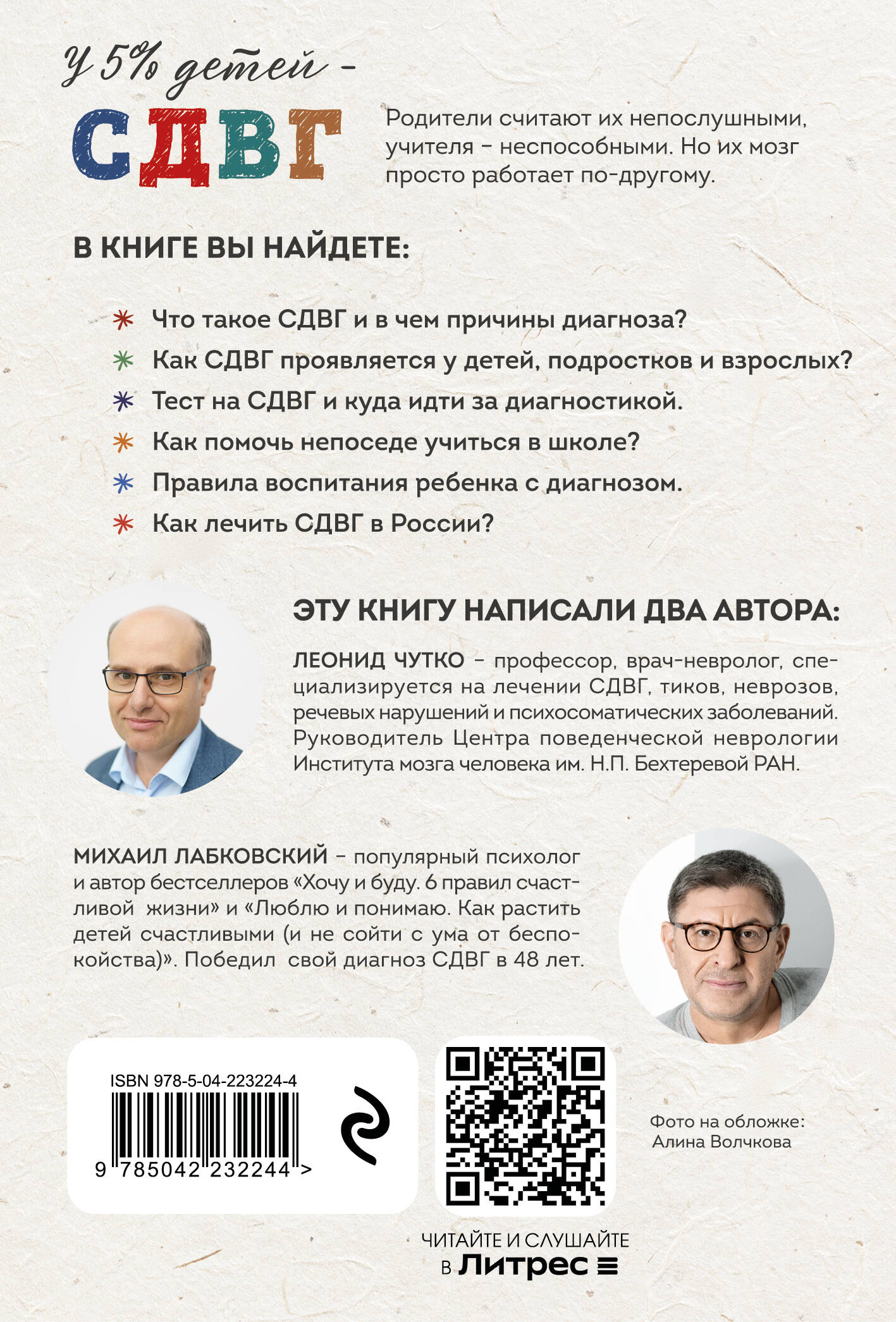 У 5% детей - СДВГ. Родители считают их непослушными, учителя - неспособными. Но их мозг просто работает по-другому. В КНИГЕ ВЫ НАЙДЕТЕ: Что такое СДВГ и в чем причины диагноза? Как СДВГ проявляется у детей, подростков и взрослых? Тест на СДВГ и куда идти за диагностикой? Как помочь непоседе учиться и в школе? Правила воспитания ребенка с диагнозом. Как лечить СДВГ в России? ЭТУ КНИГУ НАПИСАЛИ ДВА АВТОРА: Леонид Чутко - профессор, врач-невролог, специализируется на лечении СДВГ, тиков, неврозов, речевых нарушений и психосоматических заболеваний. Руководитель Центра поведенческой неврологии Института мозга человека им. Н.П. Бехтеровой РАН. Михаил Лабковский - популярный психолог и автор бестселлеров "Хочу и буду. 6 правил счастливой жизни" и "Люблю и понимаю. Как растить детей счастливыми (и не сойти с ума от беспокойства)". Победил свой диагноз СДВГ в 48 лет. Книга выходит в двух оформлениях: "Ребенок-ракета, ребенок-ураган" и "Моя жизнь с СДВГ".| Издательство | ООО "Издательство "Эксмо" |