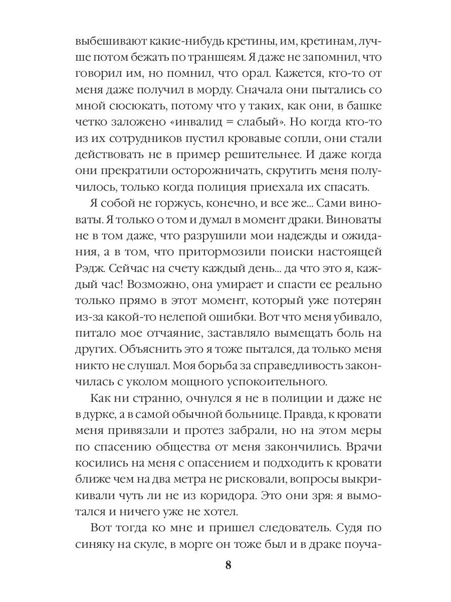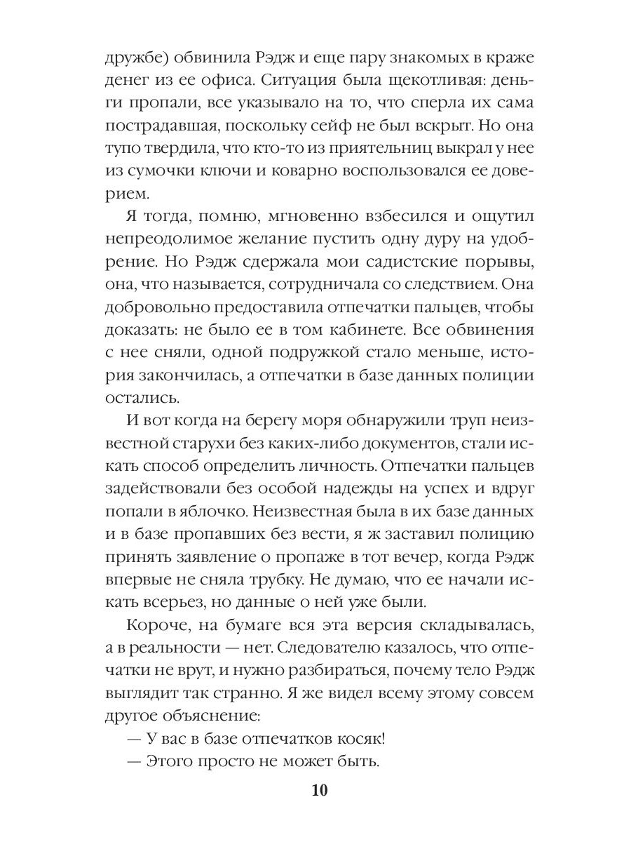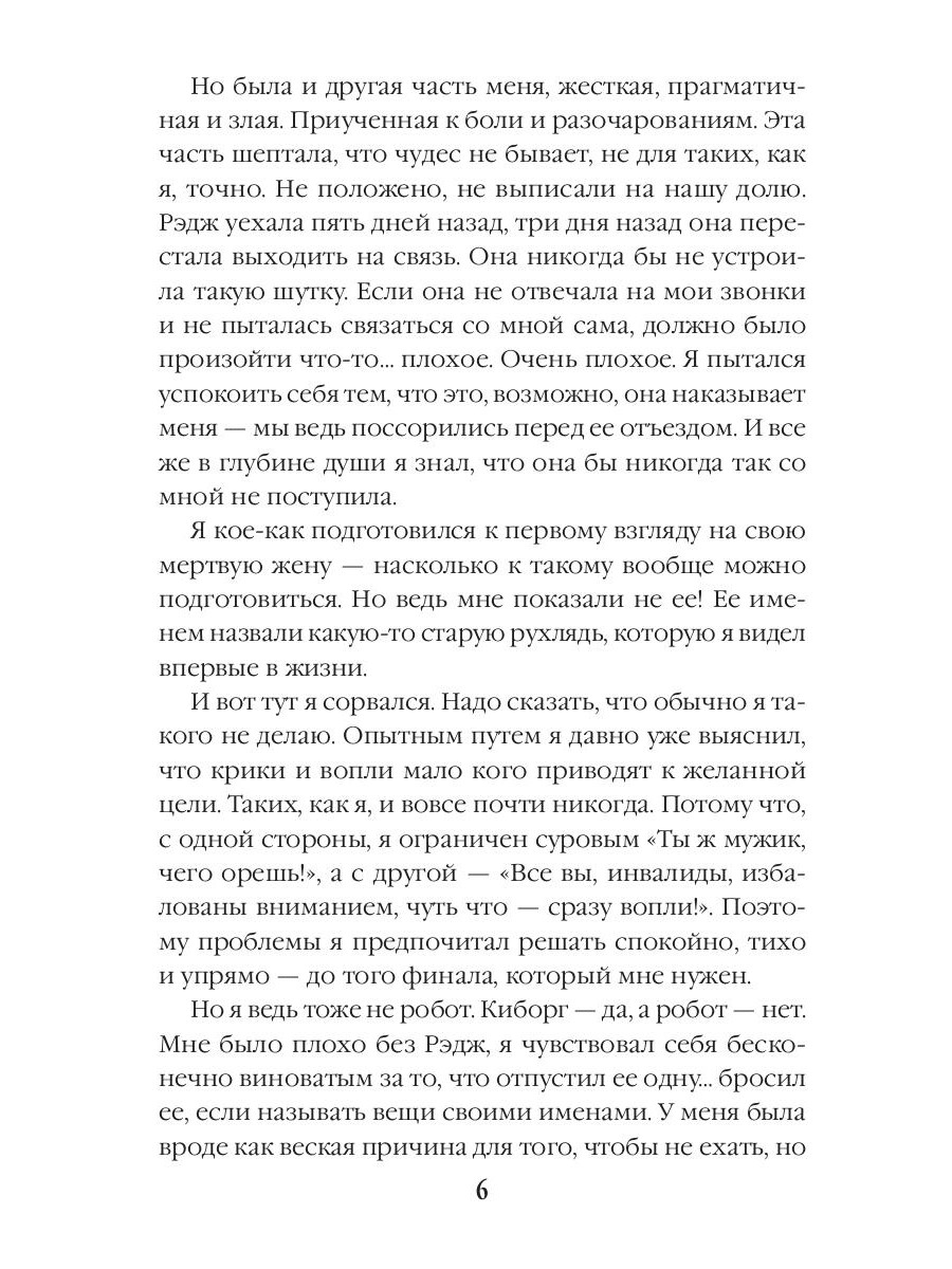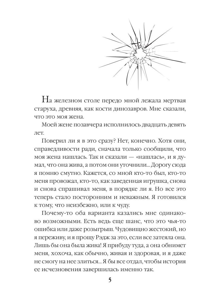 Неделю назад жена Ника отправилась на встречу с отцом, которого не видела много лет, и не вернулась - а теперь Ника вызывают на опознание тела. Справиться с такой новостью непросто, ведь получается, что его Рэдж, молодая, красивая, здоровая, вдруг умерла безо всякой причины! Однако в морге ожидает еще более шокирующее открытие. Ника заверяют, что его жена - это искалеченная старуха, которую обнаружили на морском берегу, хотя Рэдж пропала в горах. Естественно, Ник отказывается в это верить, он готов искать жену сам и непременно вернуть живой… Вот только может оказаться, что к правде он совсем не готов, потому что существуют знания, разрывающие реальность, переворачивающие мир и не оставляющие ни шанса на возврат к спокойному прошлому.| Издательство | Т8 RUGRAM |