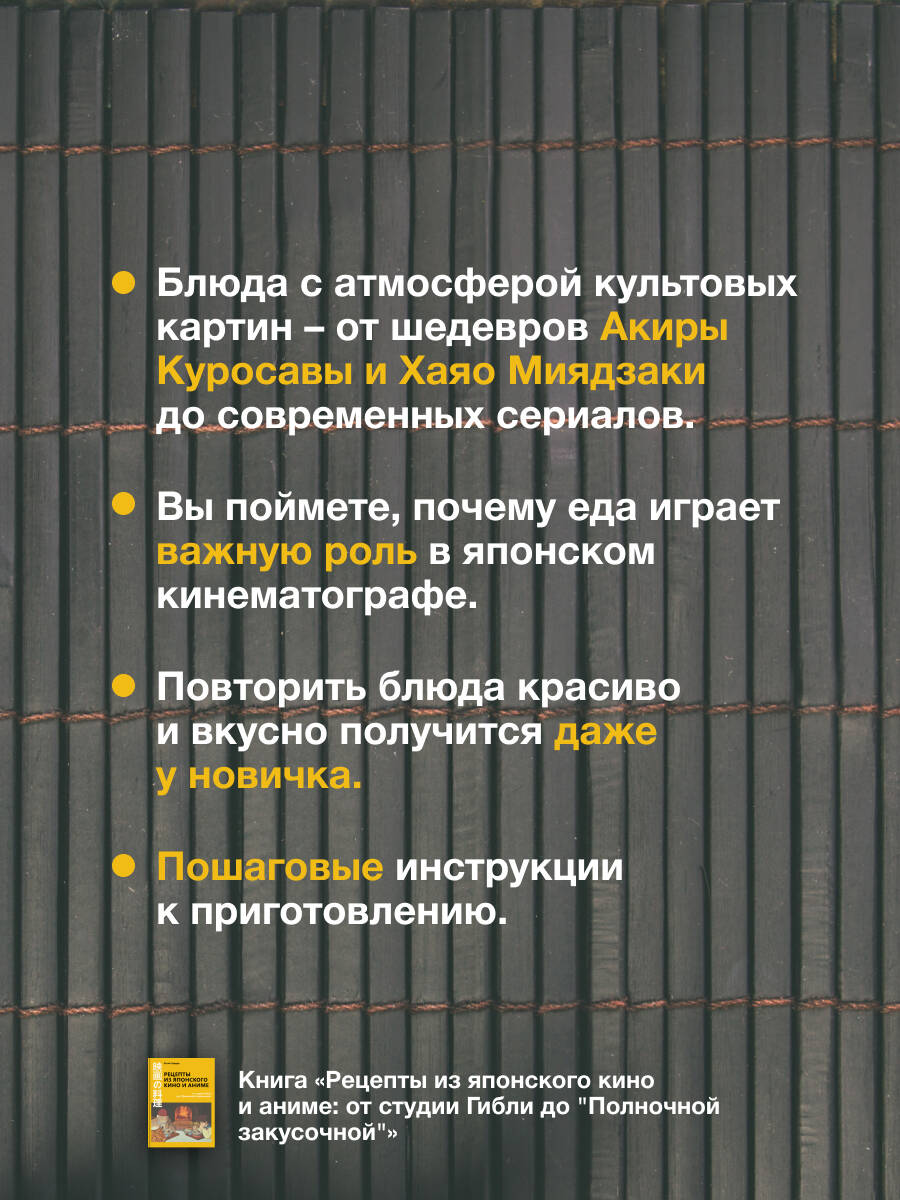 Аннотация: Рецепты из японского кино и аниме: от студии Гибли до «Полночной закусочной»