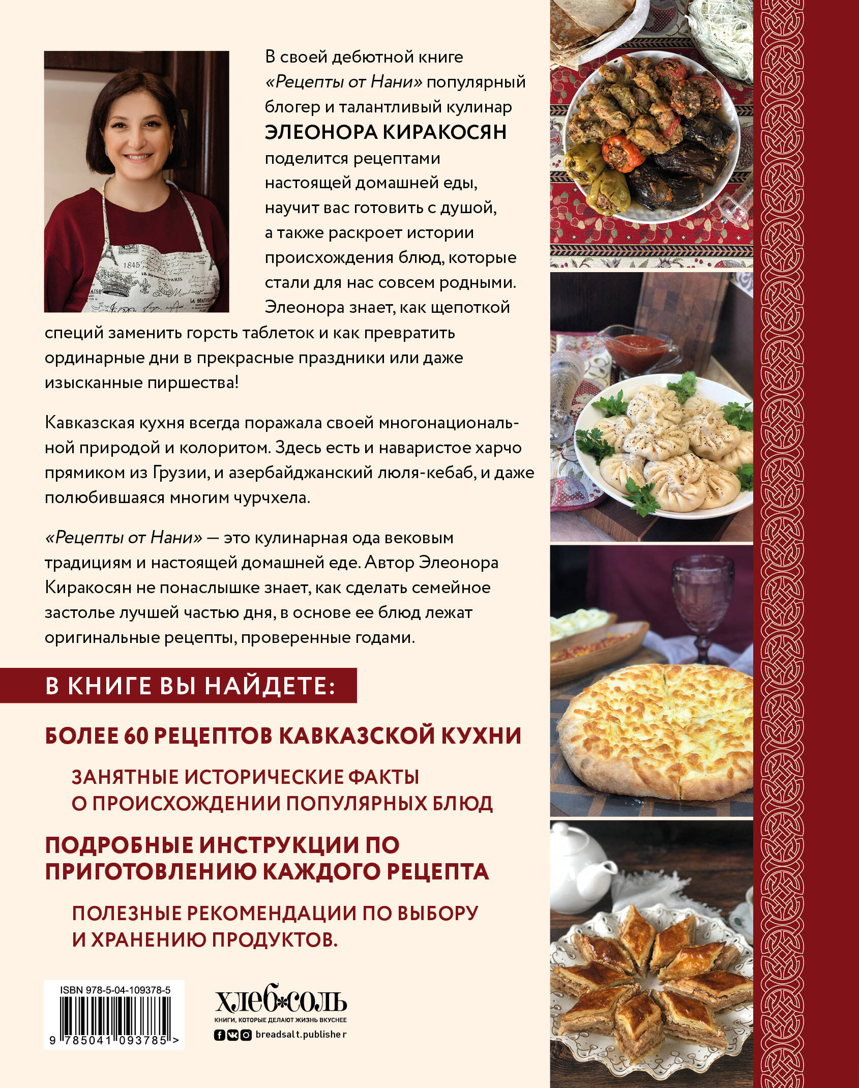 Кавказская кухня всегда поражала своей многонациональной природой и колоритом. Здесь есть и наваристый суп харчо прямиком из Грузии, и азербайджанский люля-кебаб, и даже полюбившаяся многим чурчхела. «Рецепты от Нани» - это кулинарная ода вековым традициям и настоящей домашней еде. Автор Элеонора Киракосян не понаслышке знает, как сделать семейное застолье лучшей частью дня, в основе ее блюд лежат оригинальные рецепты, проверенные годами. В книге вы найдете: - более 60 рецептов кавказской кухни; - занятные исторические факты о происхождении популярных блюд; - подробные инструкции по приготовлению каждого рецепта; - полезные рекомендации по выбору и хранению продуктов.