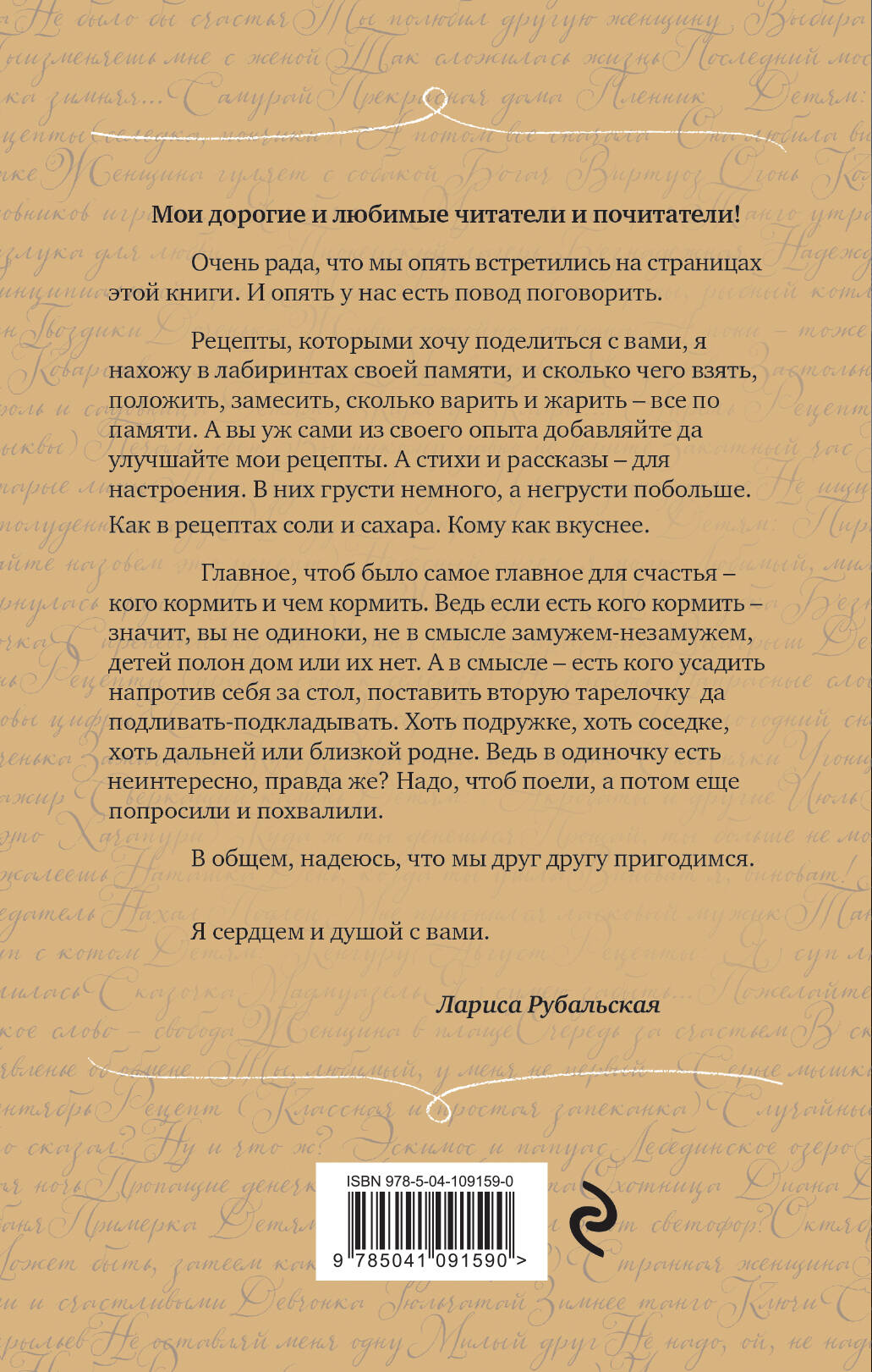 Сердечность и теплота Ларисы Рубальской помогли уже многим ее поклонникам. Ее стихи, наполненные любовью и нежностью, близки и понятны каждому слушателю. Когда она рассказывает непридуманные истории о жизни в своих стихах и рассказах, создается впечатление, что она обращается к каждому из нас. В этом сборнике собраны любимые автором рецепты, стихи и рассказы, которые помогают выйти из сложных ситуаций и стать счастливыми.| Издательство | ООО "Издательство "Эксмо" |