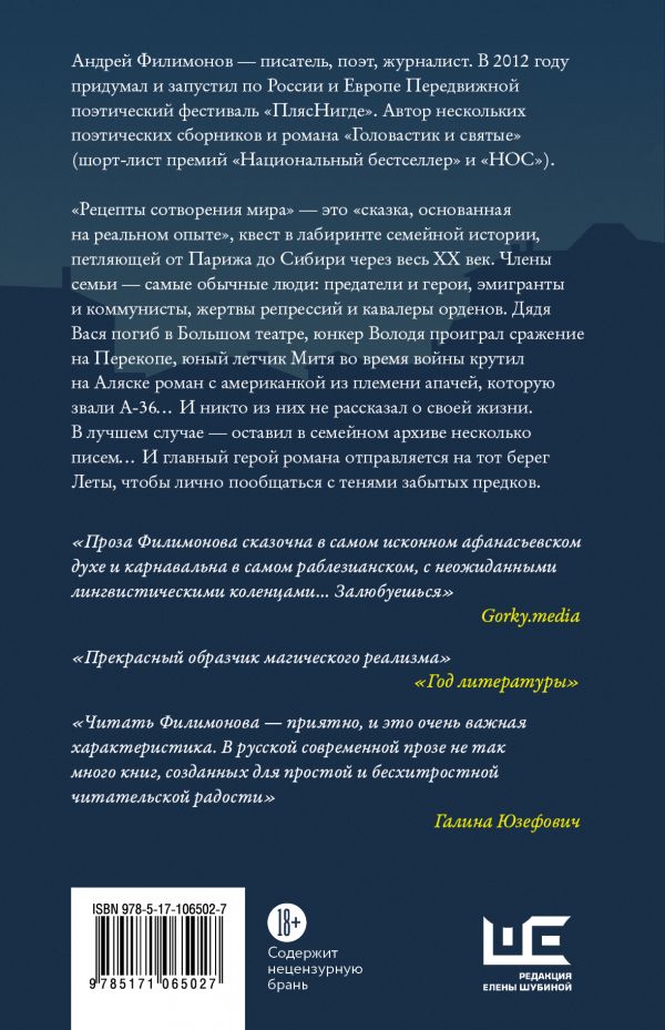 «Рецепты сотворения мира! - это «сказка, основанная на реальном опыте», квест в лабиринте семейной истории, петляющей от Парижа до Сибири через весь XX век. Члены семьи - самые обычные люди: предатели и герои, эмигранты и коммунисты, жертвы репрессий и кавалеры орденов. Дядя Вася погиб в Большом театре, юнкер Володя проиграл сражение на Перекопе, юный летчик Митя во время войны крутил на Аляске роман с американкой из племени апачей, которую звали А-36… И никто из них не рассказал о своей жизни. В лучшем случае - оставил в семейном архиве несколько писем… И главный герой романа отправляется на тот берег Леты, чтобы лично пообщаться с тенями забытых предков.
