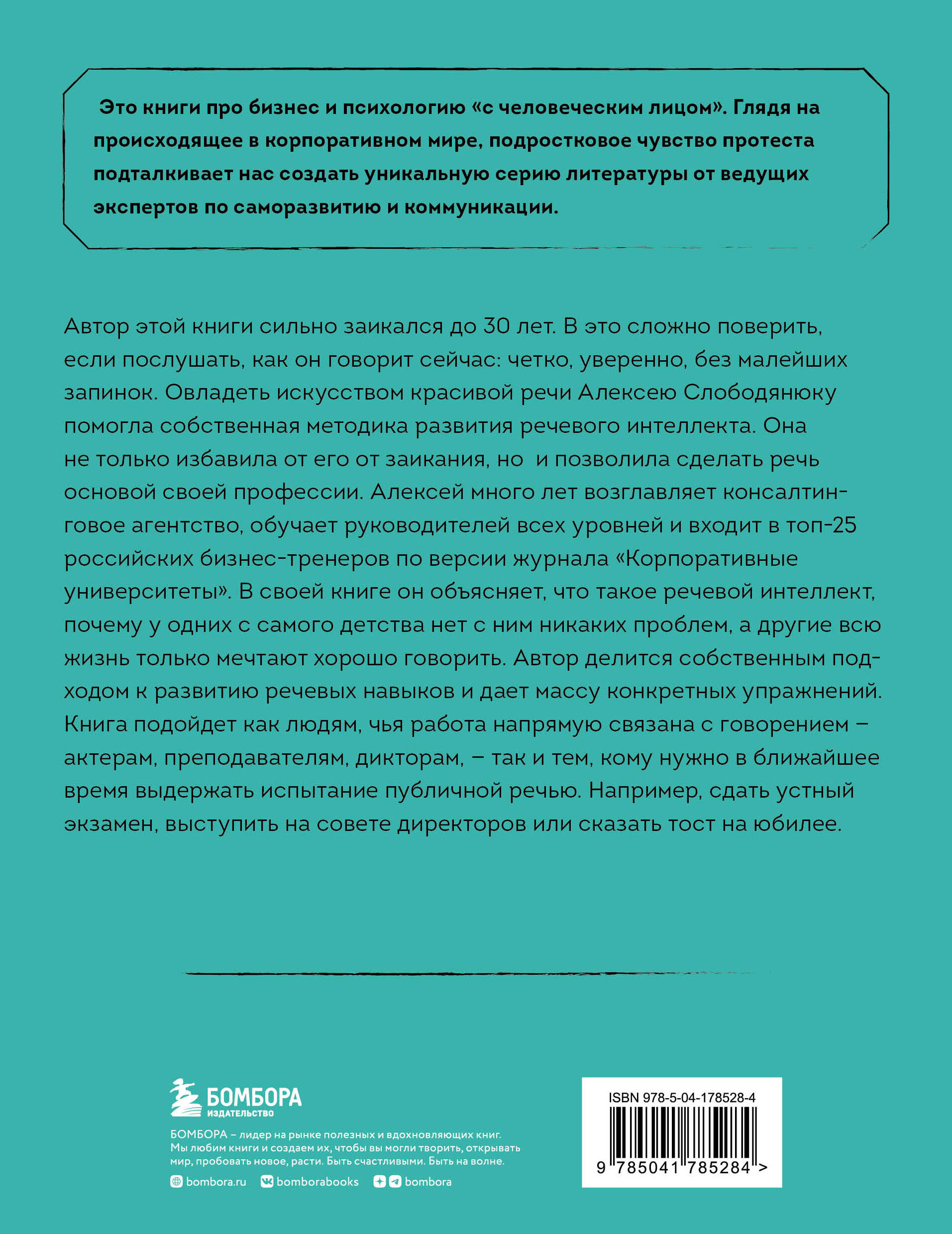 Автор этой книги сильно заикался до 30 лет. В это сложно поверить, если послушать, как он говорит сейчас: четко, уверенно, без малейших запинок. Овладеть искусством красивой речи Алексею Слободянюку помогла собственная методика развития речевого интеллекта. Она не только избавила от его от заикания, но и позволила сделать речь - основой своей профессии. Алексей много лет возглавляет консалтинговое агентство, обучает руководителей всех уровней и входит в Топ-25 российских бизнес-тренеров, по версии журнала «Корпоративные университеты». В своей книге он объясняет, что такое речевой интеллект, почему у одних с самого детства нет с ним никаких проблем, а другие всю жизнь только мечтают хорошо говорить. Автор делится собственным подходом к развитию речевых навыков и дает массу конкретных упражнений. Книга подойдет как людям, чья работа напрямую связана с говорением - актерам, преподавателям, дикторам, - так и тем, кому нужно ближайшее время выдержать испытание публичной речью. Например, сдать устный экзамен, выступить на совете директоров или сказать тост на юбилее.| Издательство | ООО "Издательство "Эксмо" |