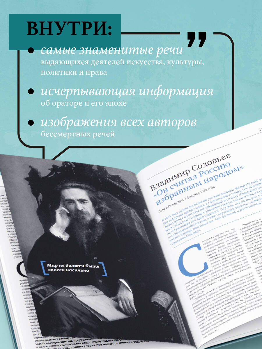 О чем книга В этой книге собраны самые знаменитые речи, произнесенные выдающимися деятелями искусства, культуры, политики и права. Гениальные ученые и полководцы, бизнесмены и революционеры, художники и политики - все они выступили в роли великих ораторов и в свое время произнесли слова, которые до сих пор звучат сквозь века. Это подарочное издание представляет бессмертные слова Сократа, Достоевского, Черчилля, Гагарина и многих других, включая наших современников, например, Барака Обамы и Ангелы Меркель. Эти люди меняли мир своими выступлениями, создавали новые страны, религии, целые философские школы. Книга выходит в двух оформлениях. «Фишки» книги • Более пятидесяти важнейших выступлений в истории человечества. • Каждая речь сопровождается исчерпывающей информацией об ораторе и эпохе. • Изображения всех авторов бессмертных речей. Для кого эта книга Эта книга будет интересна всем, кто неравнодушен к истории развития человечества, всем, чья жизнь связана с выступлениями на публике, всем, кто хотел бы научиться произносить запоминающиеся и воодушевляющие речи! Подарок солидным партнерам по бизнесу и руководителям всех уровней.| Издательство | ООО "Издательство "Эксмо" |