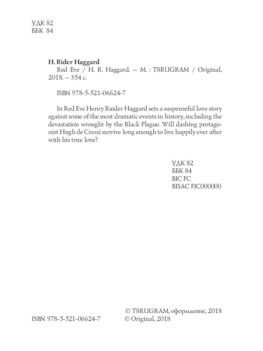 In Red Eve Henry Raider Haggard sets a suspenseful love story against some of the most dramatic events in history, including the devastation wrought by the Black Plague. Will dashing protagonist Hugh de Cressi survive long enough to live happily ever after with his true love?| Издательство | Т8 RUGRAM |