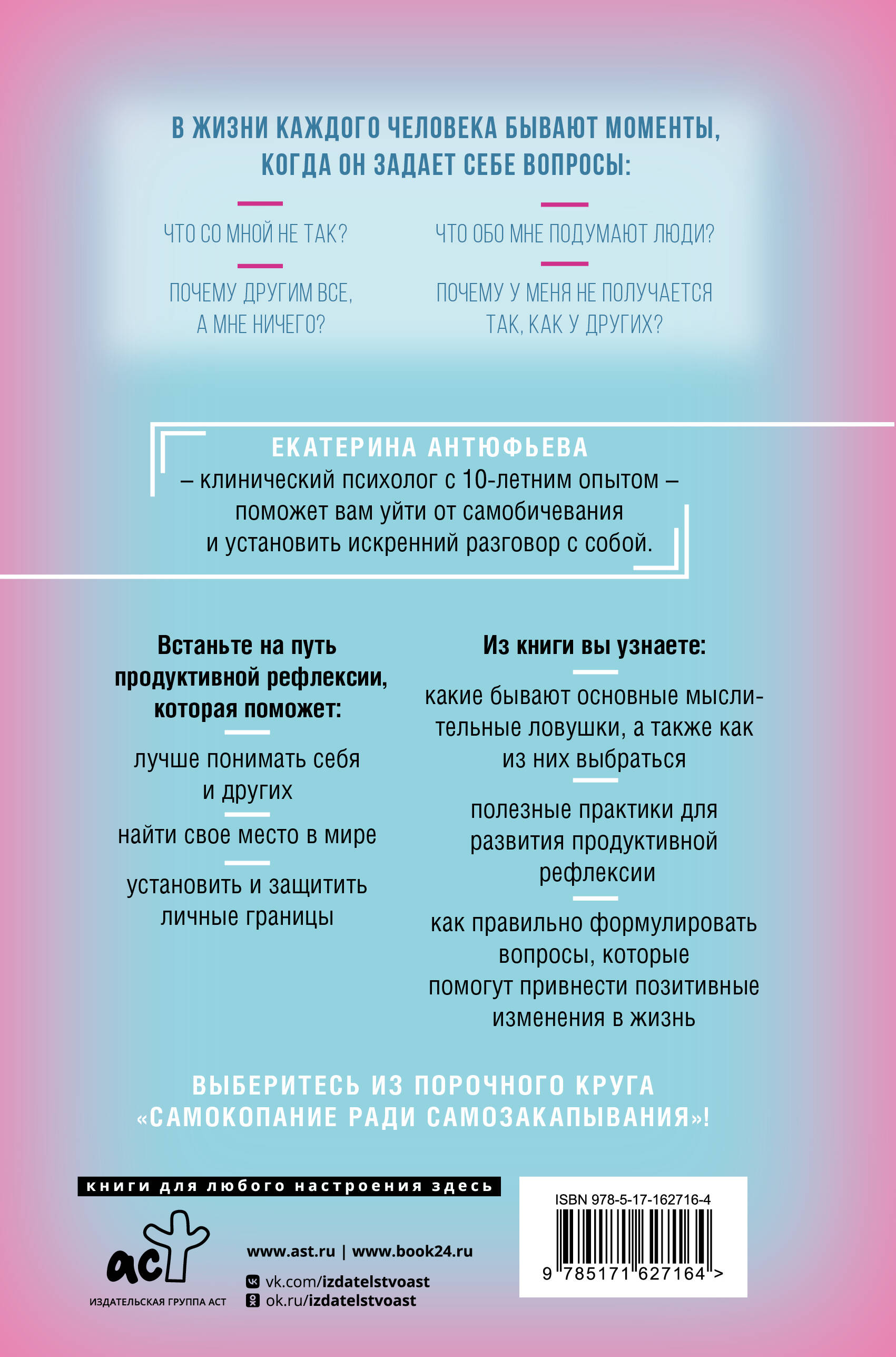 В жизни каждого человека бывают моменты, когда он задает себе вопросы: Что со мной не так? Что обо мне подумают люди? Почему у меня не получается так, как у других? Почему другим все, а мне ничего? Екатерина Антюфьева - клинический психолог с 10-летним опытом - поможет вам уйти от самобичевания и установить искренний разговор с собой. Встаньте на путь продуктивной рефлексии, которая поможет: - лучше понимать себя и других - найти свое место в мире - установить и защитить личные границы Из книги вы узнаете: - какие бывают основные мыслительные ловушки, а также как из них выбраться - полезные практики для развития продуктивной рефлексии - как правильно формулировать вопросы, которые помогут привнести позитивные изменения в жизнь Выберитесь из порочного круга "самокопание ради самозакапывания"!| Издательство | Издательство "АСТ" |