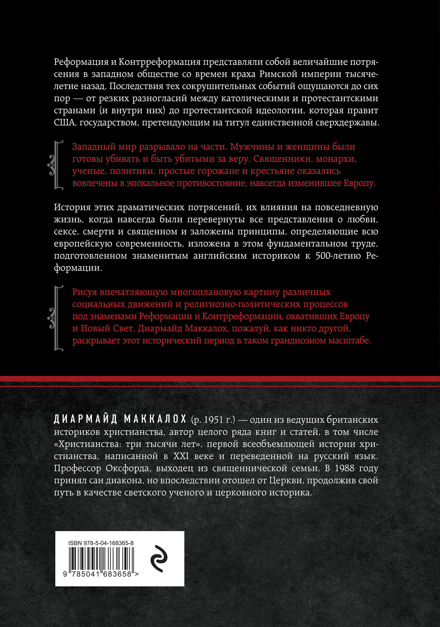 «Эта книга посвящена истории европейской религии в начале современной эпохи и ее наследию - и достойна звания классического труда. В ней обобщены и оценены исследования, длившиеся на протяжении четверти века по всему миру… Подобно лучшим историкам, автор помогает нам понять, почему мы такие, какие мы есть, - и почему нам необязательно быть такими». - Рональд Хаттон, The Independent «История подобного рода, в данном случае рассказанная с блеском, приводит в головокружительный восторг даже академиков». - The Economist «Всеохватная, многогранная, очаровательная… Эта поразительная история, созданная истинным мыслителем, напоминает нам, что истоки Реформации восходят к эпохе Ренессанса, и раскрывает перед нами увлекательную панораму культурных течений, сформировавших основу для реформ. Книгу Маккаллоха непременно должны признать самой точной и полной историей Реформации». - Publishers Weekly «Шедевр удобочитаемой научной работы... В своей области это лучшая книга из когда-либо написанных». - The Guardian «От политики к колдовству, от литургии к сексу; размах европейской истории, охваченный здесь, захватывает дух. Это образец истории». - Sunday Telegraph Диармайд Маккалох (р. 1951 г.) - один из ведущих британских историков христианства, автор целого ряда книг и статей, в том числе «Христианство: три тысячи лет», первой всеобъемлющей истории христианства, написанной в XXI веке и переведенной на русский язык. Профессор Оксфорда, выходец из семьи священника. В 1988 году принял сан диакона, но впоследствии отошел от Церкви, продолжив свой путь в качестве светского ученого и церковного историка.| Издательство | ООО "Издательство "Эксмо" |