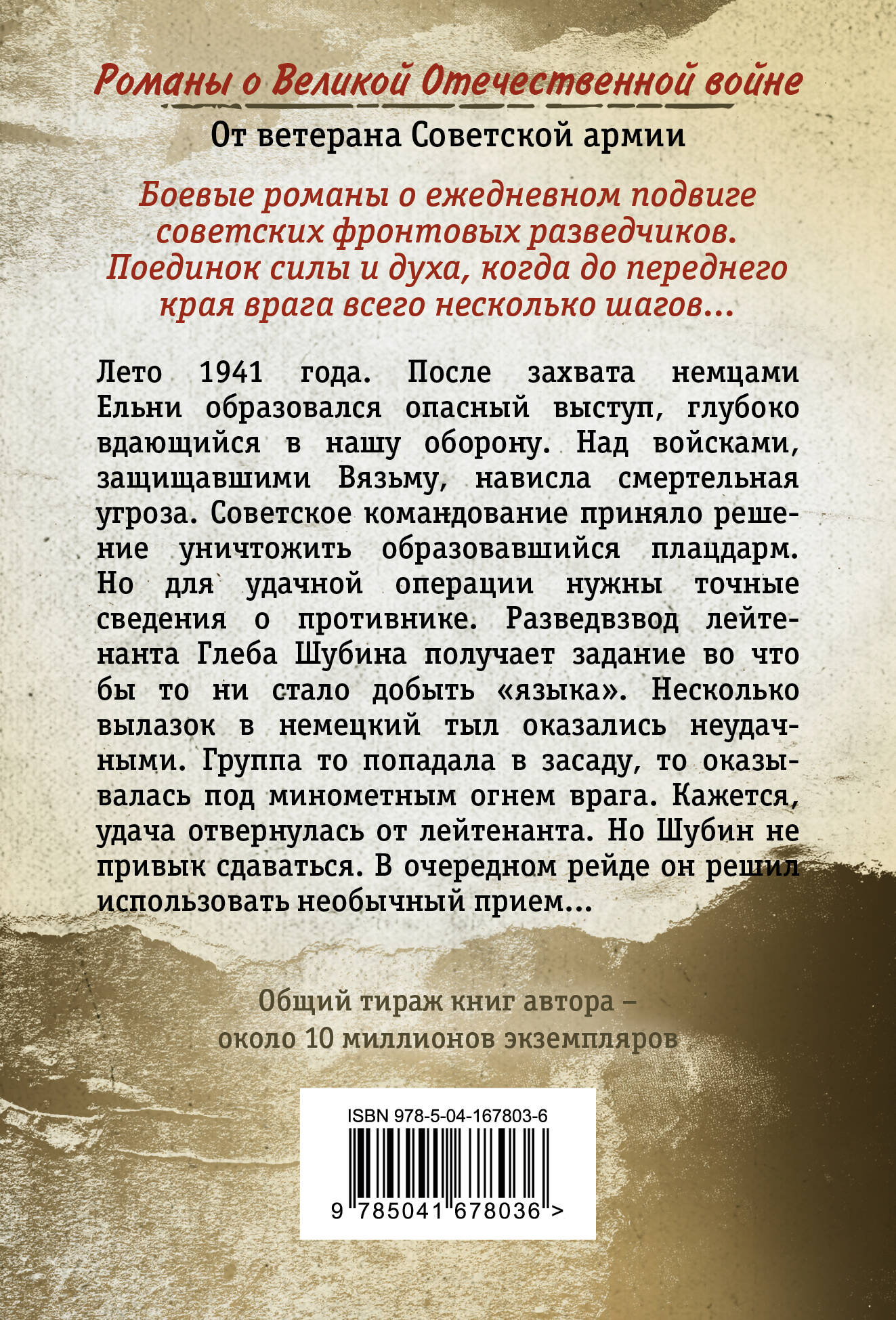 От их смекалки и отваги зависела судьба фронтовых операций. Боевые романы о ежедневном подвиге советских фронтовых разведчиков. Поединок силы и духа, когда до переднего края врага всего несколько шагов… Общий тираж книг автора - около 10 миллионов экземпляров. Лето 1941 года. После захвата немцами Ельни образовался опасный выступ, глубоко вдающийся в нашу оборону. Над войсками, защищавшими Вязьму, нависла смертельная угроза. Советское командование приняло решение уничтожить образовавшийся плацдарм. Но для удачной операции нужны точные сведения о противнике. Разведвзвод лейтенанта Глеба Шубина получает задание во что бы то ни стало добыть «языка». Несколько вылазок в немецкий тыл оказались неудачными. Группа то попадала в засаду, то оказывалась под минометным огнем врага. Кажется, удача отвернулась от лейтенанта. Но Шубин не привык сдаваться. В очередном рейде он решил использовать необычный прием…| Издательство | Эксмо |