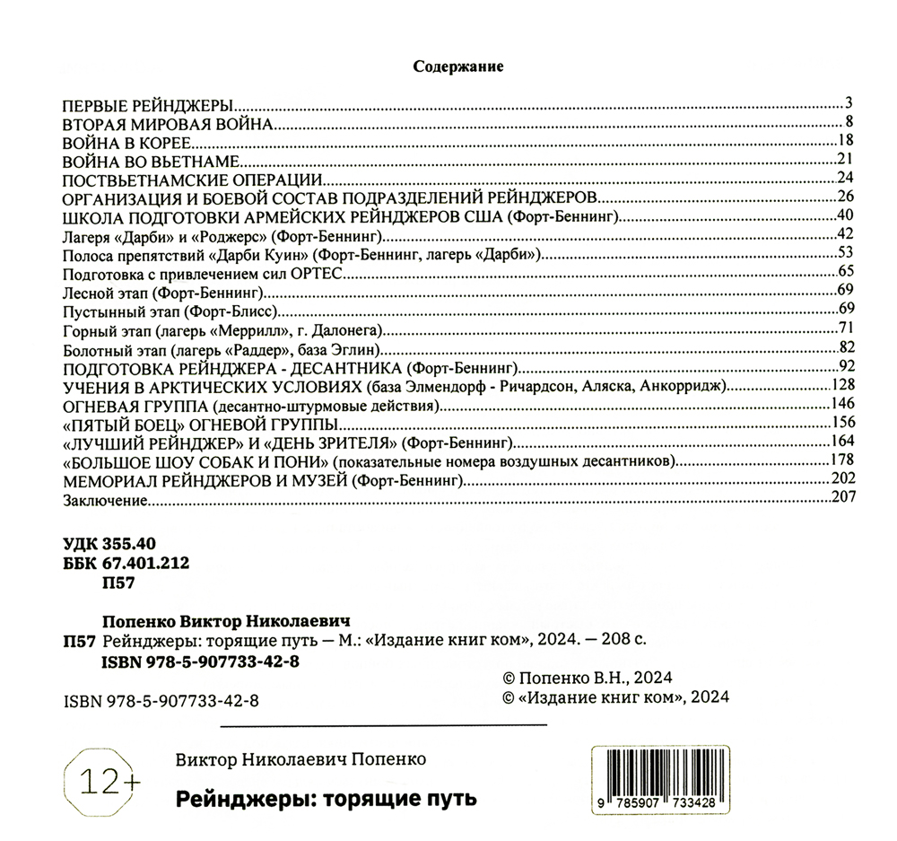 В книге (включающей материал из наставления «Ranger Handbook» и мемуары американских рейнджеров - ветеранов) рассказывается об армейских рейнджерах США (англ. United States Army Rangers) - элитном военном подразделении быстрого реагирования. Это - специально организованные, хорошо снаряженные и всесторонне подготовленные бойцы, окончившие Школу армейских рейнджеров (о подготовке в которой также говорится в книге), и обеспечивающие высшему военному командованию Соединенных Штатов возможность быстрого развертывания их, как эффективной военной силы, в любой точке мира. На уровне полка рейнджеры осуществляют планирование и проведение специальных военных операций для максимально эффективного достижения целей, поставленных командованием. Армейские рейнджеры являются одним из главных мобильных формирований армии США, на которое возложены следующие задачи: - захват аэродромов противника (для последующей их передачи идущим следом своим регулярным войскам); - глубокая разведка в тылу противника (включая тайные операции); - борьба с террористами (захват их или ликвидация); - проведение рейдов к ключевым целям оперативного и стратегического значения; - засадные действия; - воздушно-штурмовые операции.| Издательство | Издание книг ком |