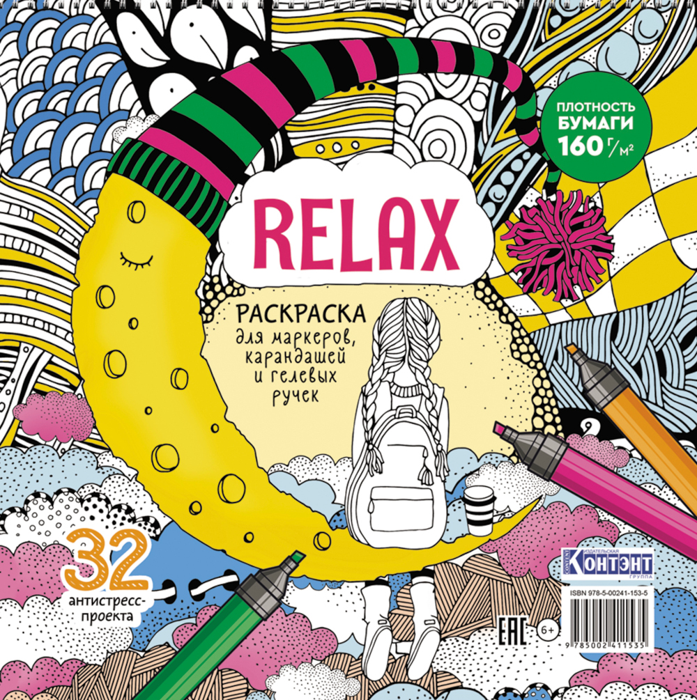 Аннотация: Relax: Раскраска для маркеров, карандашей и гелевых ручек: 32 антистресс-проекта (девочка и месяц из сыра)