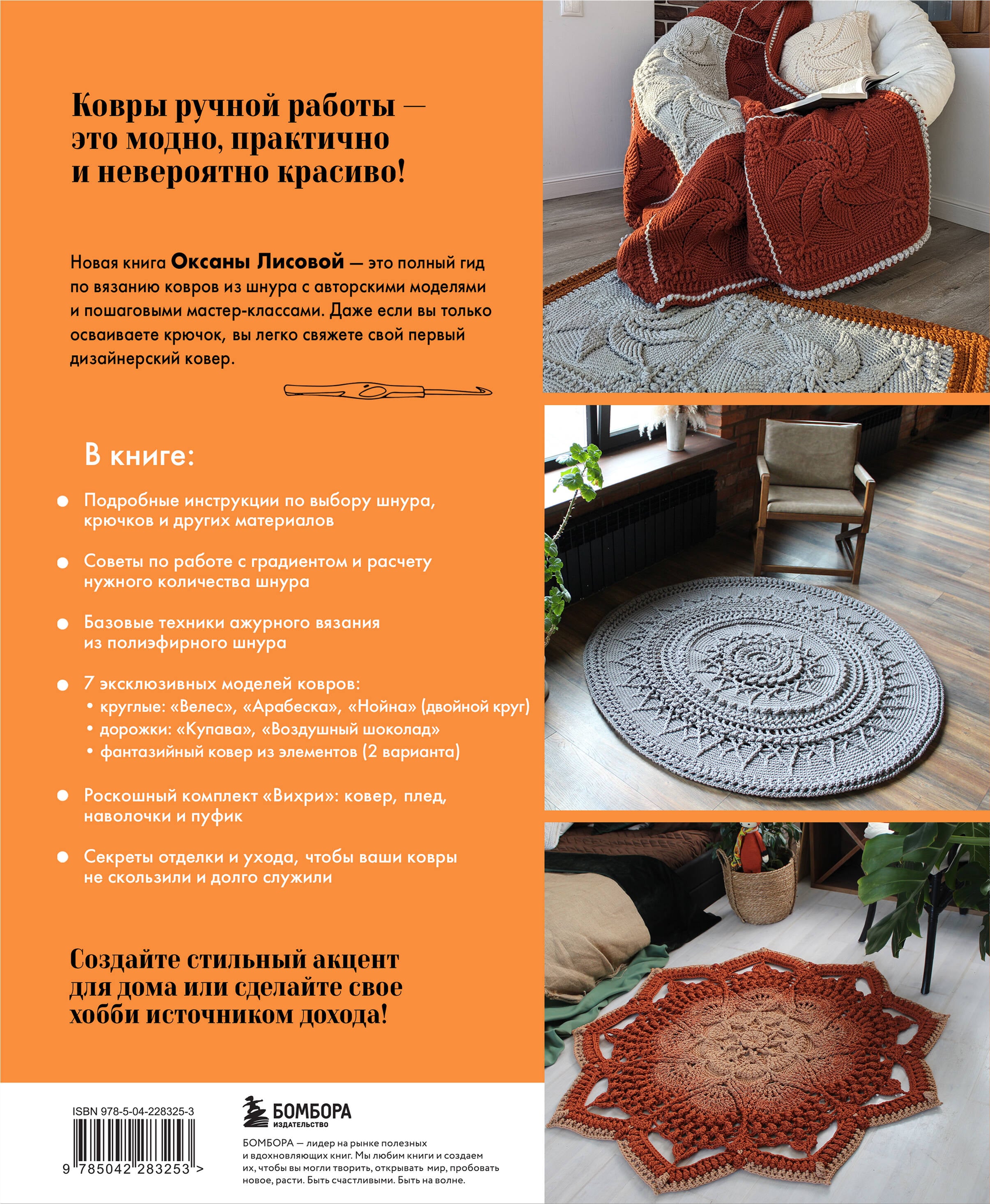 Ковры ручной работы, связанные крючком из обычного шнура, продолжают свое победное шествие по рукодельному миру! Прокачайте свои навыки вязания и украсьте свой интерьер неповторимым, стильным и роскошным ковром! Автор бестселлера «Современное ажурное вязание. Рельефные ковры», проданного в России рекордным тиражом, Оксана Лисова предлагает новую коллекцию авторских разработок, которые вы свяжете сами под чутким руководством автора. Справится даже тот, кто освоил только самые основы вязания крючком! Вы узнаете, как выбрать шнур и подобрать к нему крючок, тонкости работы с градиентным шнуром, освоите азы вязания из шнура, научитесь их финальной отделке и вариантам использования. В книге представлены 7 уникальных ковров ручной работы: круглые, дорожки, фантазийные, а еще роскошный интерьерный набор в едином стиле: ковер, наволочка и пуфик. Все мастер-классы подробны и понятны каждому, сопровождаются схемами и видеоуроками, на которые можно перейти прямо со страниц книги. Сделайте новый шаг на пути к вязальному мастерству! Уникальные преимущества книги: - Автор - лидер рынка, чей бестселлер «Рельефные ковры» продан в России рекордным тиражом. - QR-коды на страницах для мгновенного доступа к видеоурокам. - Пошаговые схемы и понятные фотоинструкции - связать любую модель сможет даже новичок. - Авторские дизайны, которых не найти в свободном доступе.| Издательство | ООО "Издательство "Эксмо" |