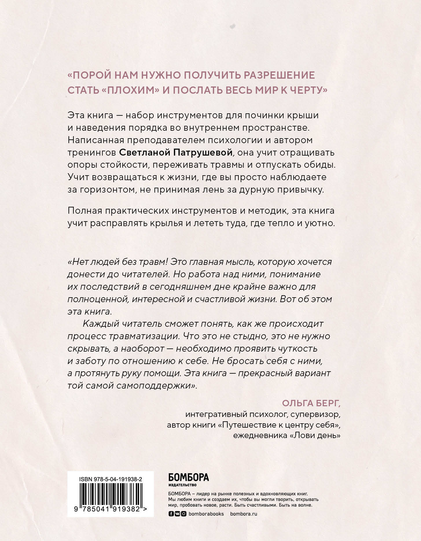 Порой нам нужно получить разрешение стать «плохим» и послать весь мир к черту! Эта книга - набор инструментов для починки крыши и наведению порядка во внутренней «детской». Написанная опытным психологом и преподавателем тренингов Светланой Патрушевой, она учит отращивать опоры стойкости, переживать травмы и отпускать обиды. Учит возвращаться к жизни, где вы просто наблюдаете за горизонтом, не принимая лень за дурную привычку. Полная практических инструментов и методик, эта книга учит расправлять крылья и лететь туда, где тепло и уютно.| Издательство | ООО "Издательство "Эксмо" |