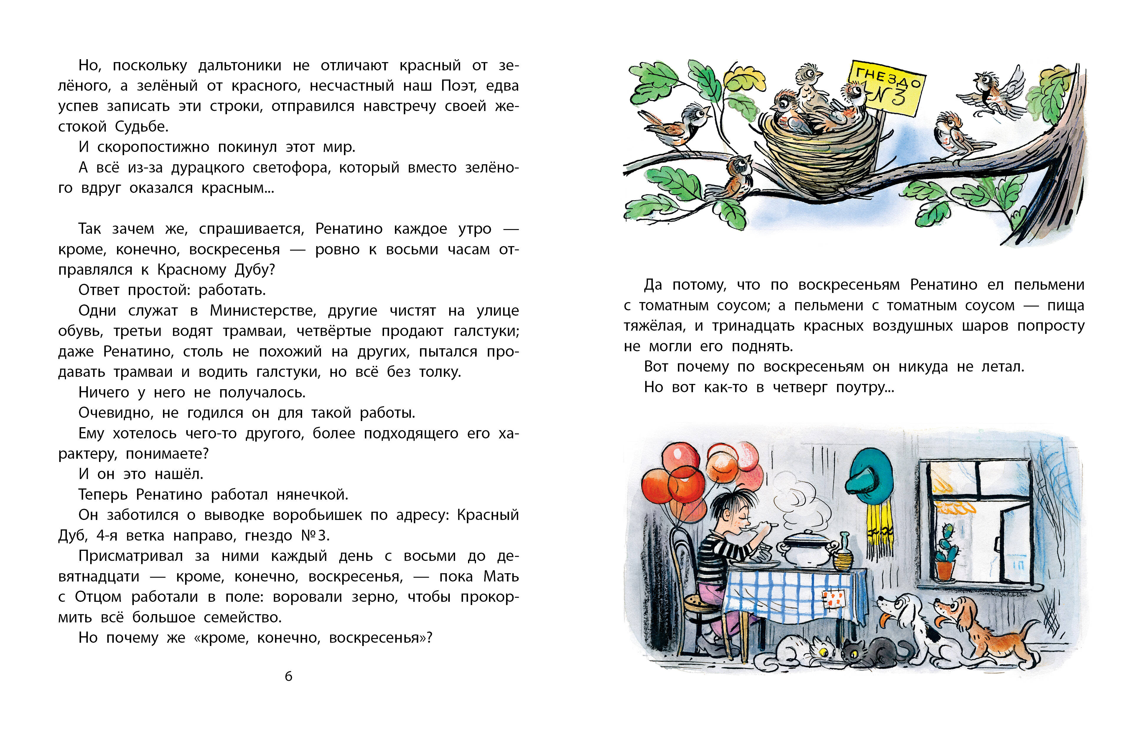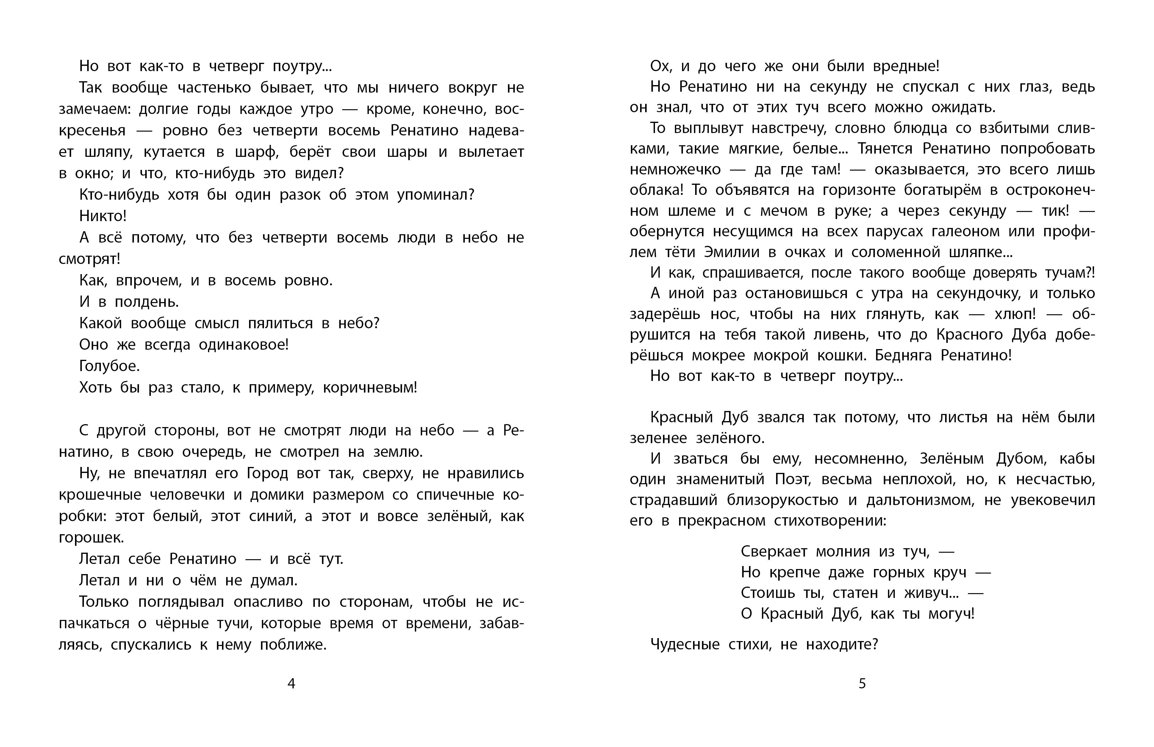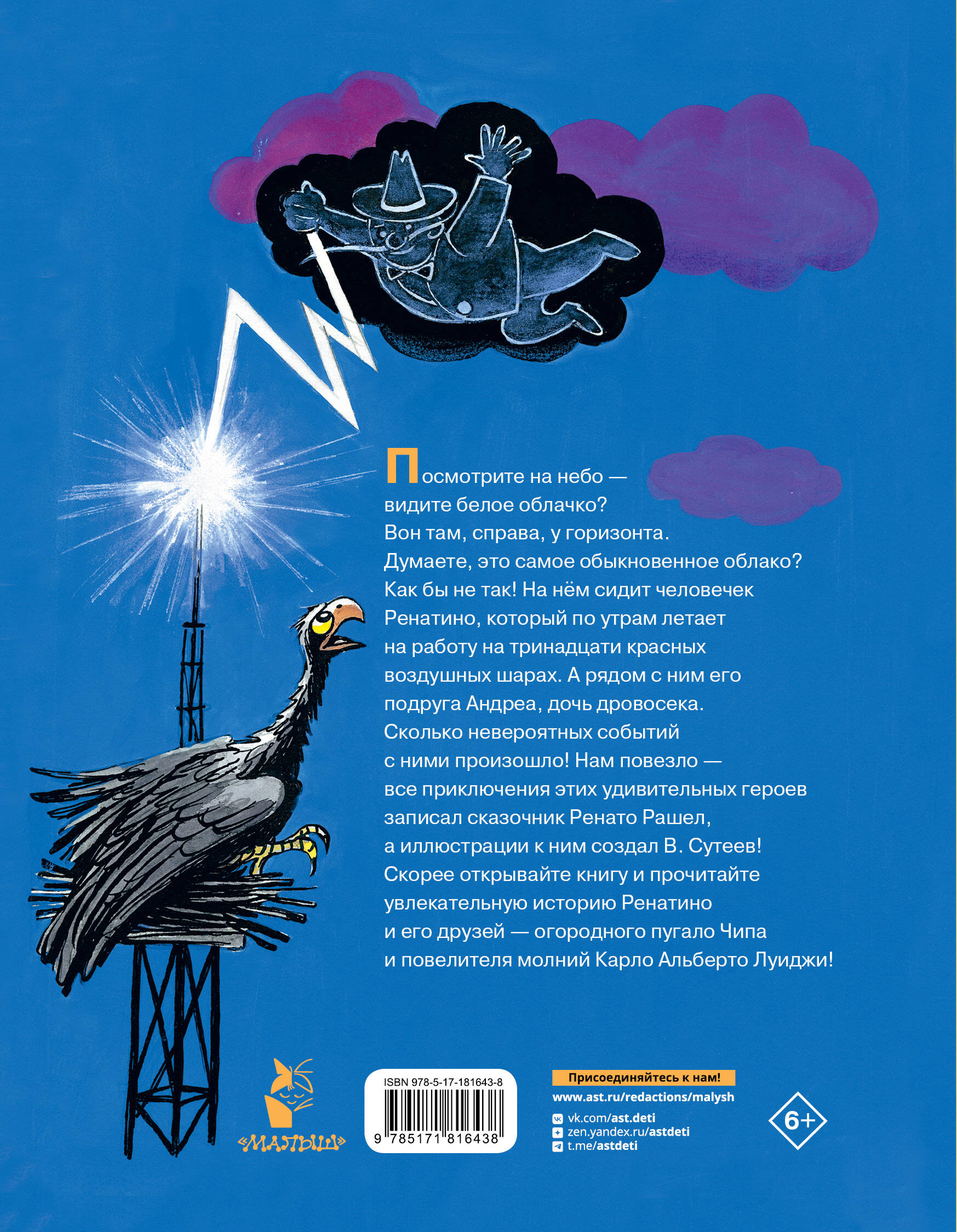 Посмотрите на небо - видите белое облачко? Вон там, справа, у горизонта. Думаете, это самое обыкновенное облако? Как бы не так! На нём сидит человечек Ренатино, который по утрам летает на работу на тринадцати красных воздушных шарах. А рядом с ним его подруга Андреа, дочь дровосека. Сколько невероятных событий с ними произошло! Нам повезло - все приключения этих удивительных героев записал сказочник Ренато Рашел, а иллюстрации к ним создал В. Сутеев! Скорее открывайте книгу и прочитайте увлекательную историю Ренатино и его друзей - огородного пугало Чипа и повелителя молний Карло Альберто Луиджи!| Издательство | Издательство "АСТ" |