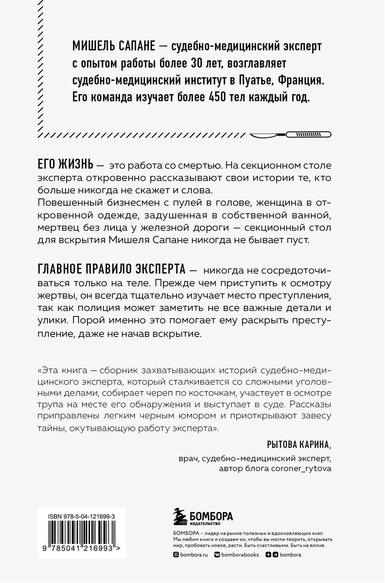 Что общего у повешенного бизнесмена с пулей в голове и обескровленного мужчины со снятым скальпом на железнодорожных путях? И того, и другого будет вскрывать Мишель Сапане в своем секционном зале в Пуатье на западе Франции. Этот неординарный судмедэксперт работает в своей профессии с 1987 года и повидал уже многое. Каждое свое дело он описывает с изящным темным юмором, погружая читателя в рутинные для судмедэксперта приключения. Главный принцип его книги - любопытство должно быть удовлетворено. И почти каждое дело, упомянутое в книге, находит свое логическое завершение в зале суда, где страсти разгораются только сильнее. Команда Мишеля Сапане изучает более 450 тел каждый год, и поверьте: среди них есть невероятно любопытные экземпляры.| Издательство | ООО "Издательство "Эксмо" |