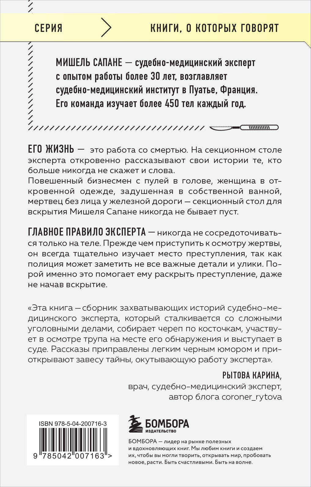 Что общего у повешенного бизнесмена с пулей в голове и обескровленного мужчины со снятым скальпом на железнодорожных путях? И того, и другого будет вскрывать Мишель Сапане в своем секционном зале в Пуатье на западе Франции. Этот неординарный судмедэксперт работает в своей профессии с 1987 года и повидал уже многое. Каждое свое дело он описывает с изящным темным юмором, погружая читателя в рутинные для судмедэксперта приключения. Главный принцип его книги - любопытство должно быть удовлетворено. И почти каждое дело, упомянутое в книге, находит свое логическое завершение в зале суда, где страсти разгораются только сильнее. Команда Мишеля Сапане изучает более 450 тел каждый год, и поверьте: среди них есть невероятно любопытные экземпляры.| Издательство | ООО "Издательство "Эксмо" |