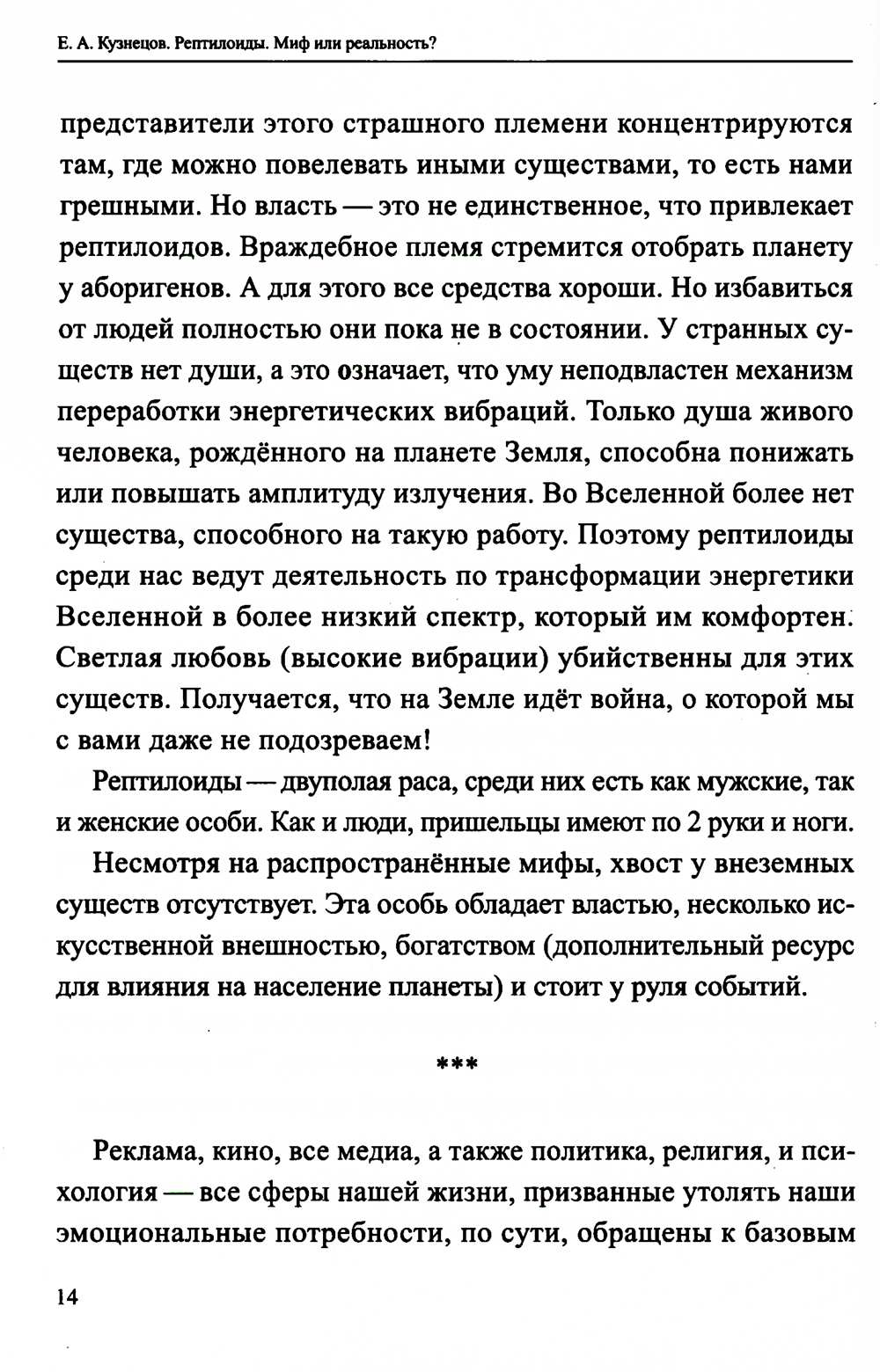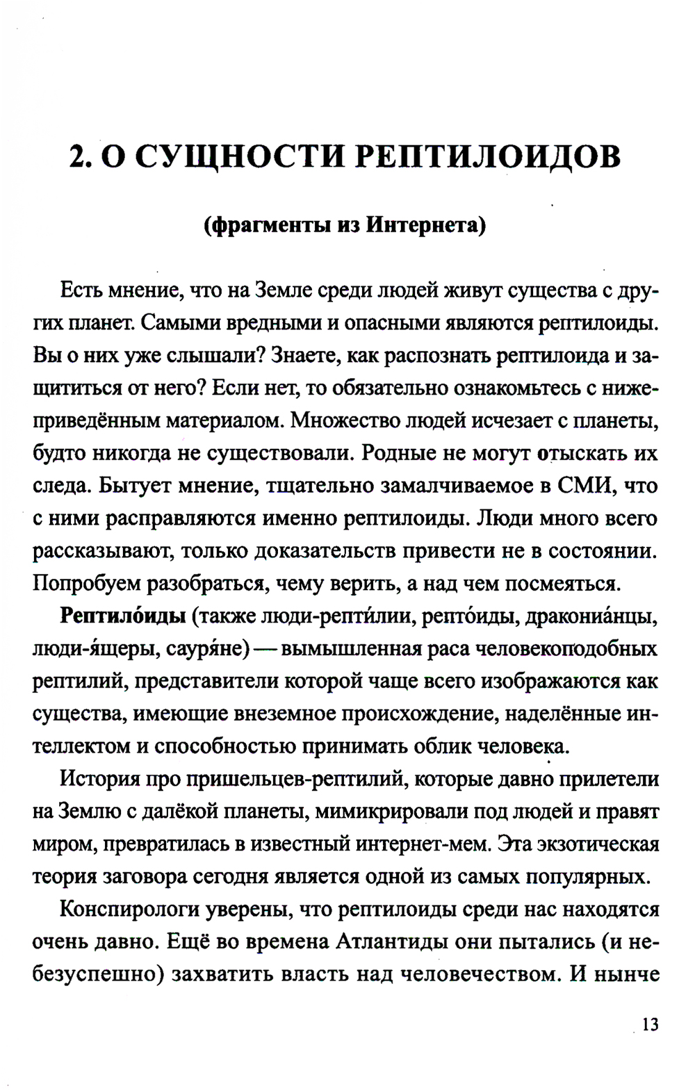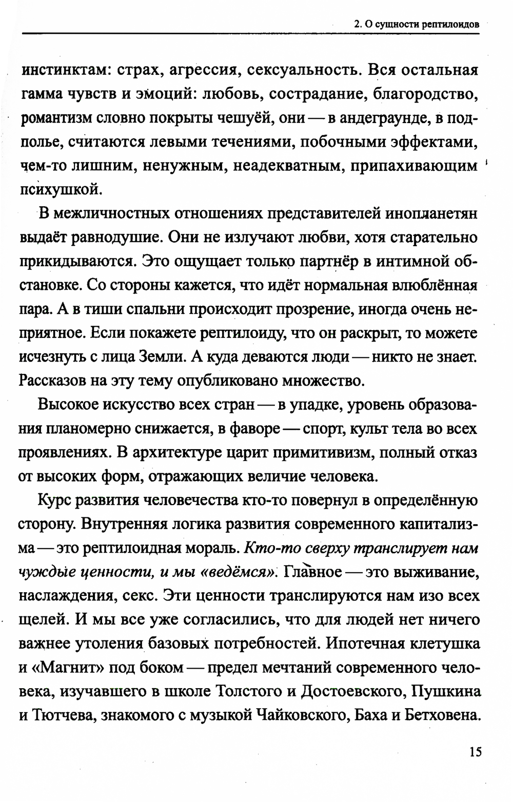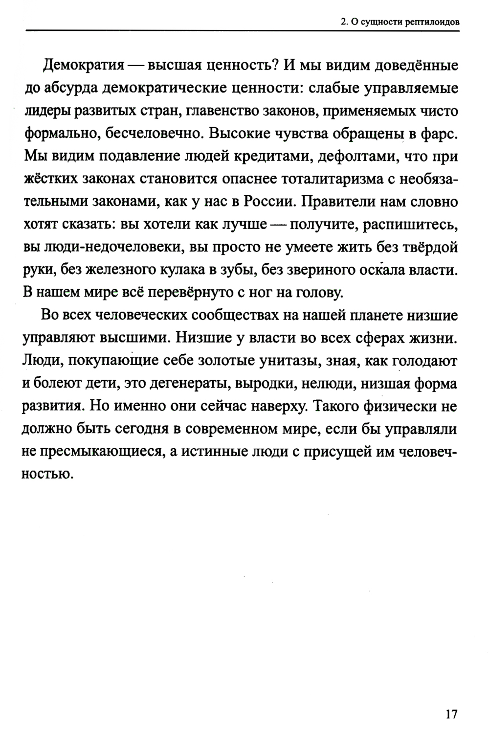 В книге на основании литературных источников и эниологических исследований автора рассматривается версия возможного присутствия рептилоидов на Земле. Показана возможность эниологической экспресс-диагностики рептилоидов различных категорий среди известных людей прошлого и настоящего времени и исследованы их духовные, психические и ментальные параметры. Приводятся данные процентного состава рептилоидов и их резонанс с эгрегорами Добра и Зла в ведущих странах мира и их властных структурах. Предложены методики коррекции рептилоидов, представляющих основную угрозу земной цивилизации. В приложении представлены основные теоретические положения практической эниологии.