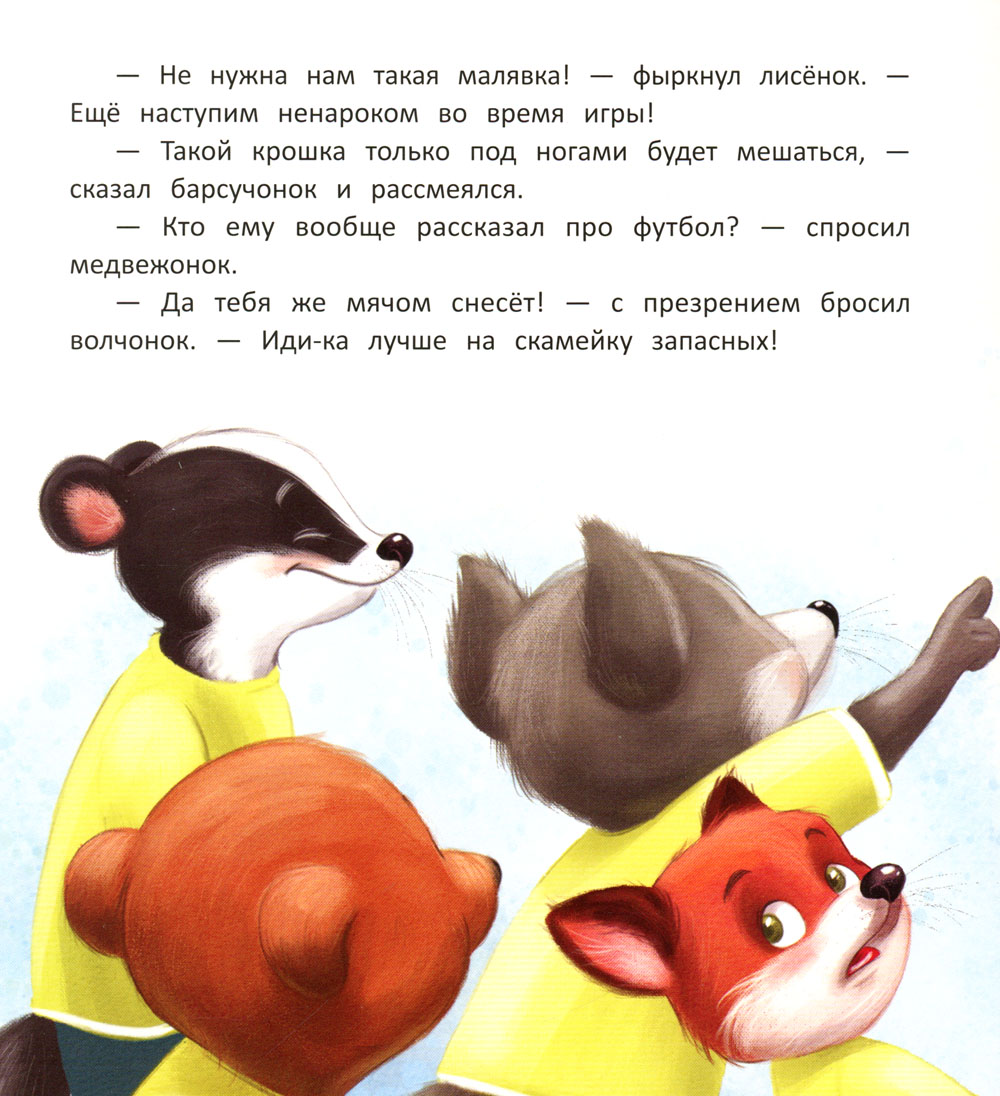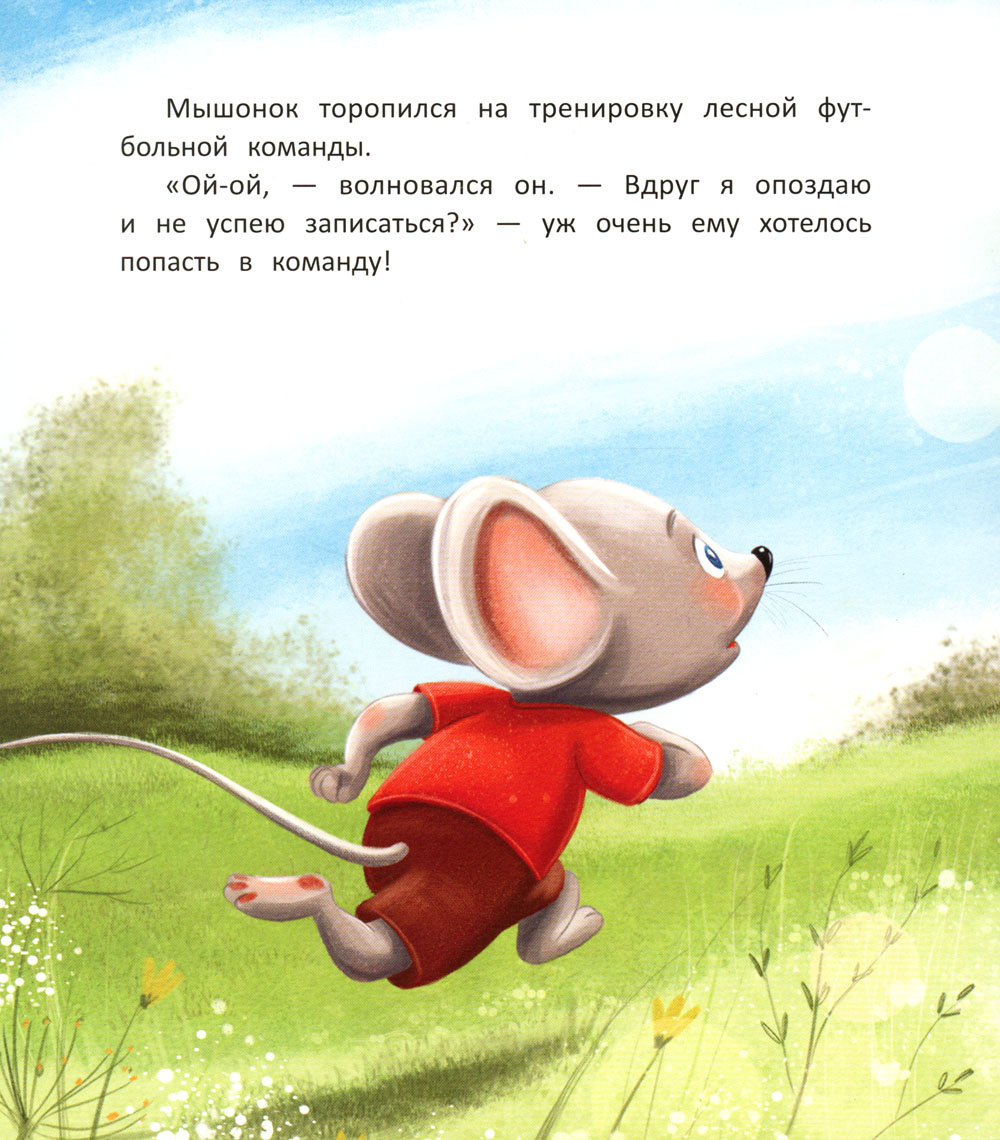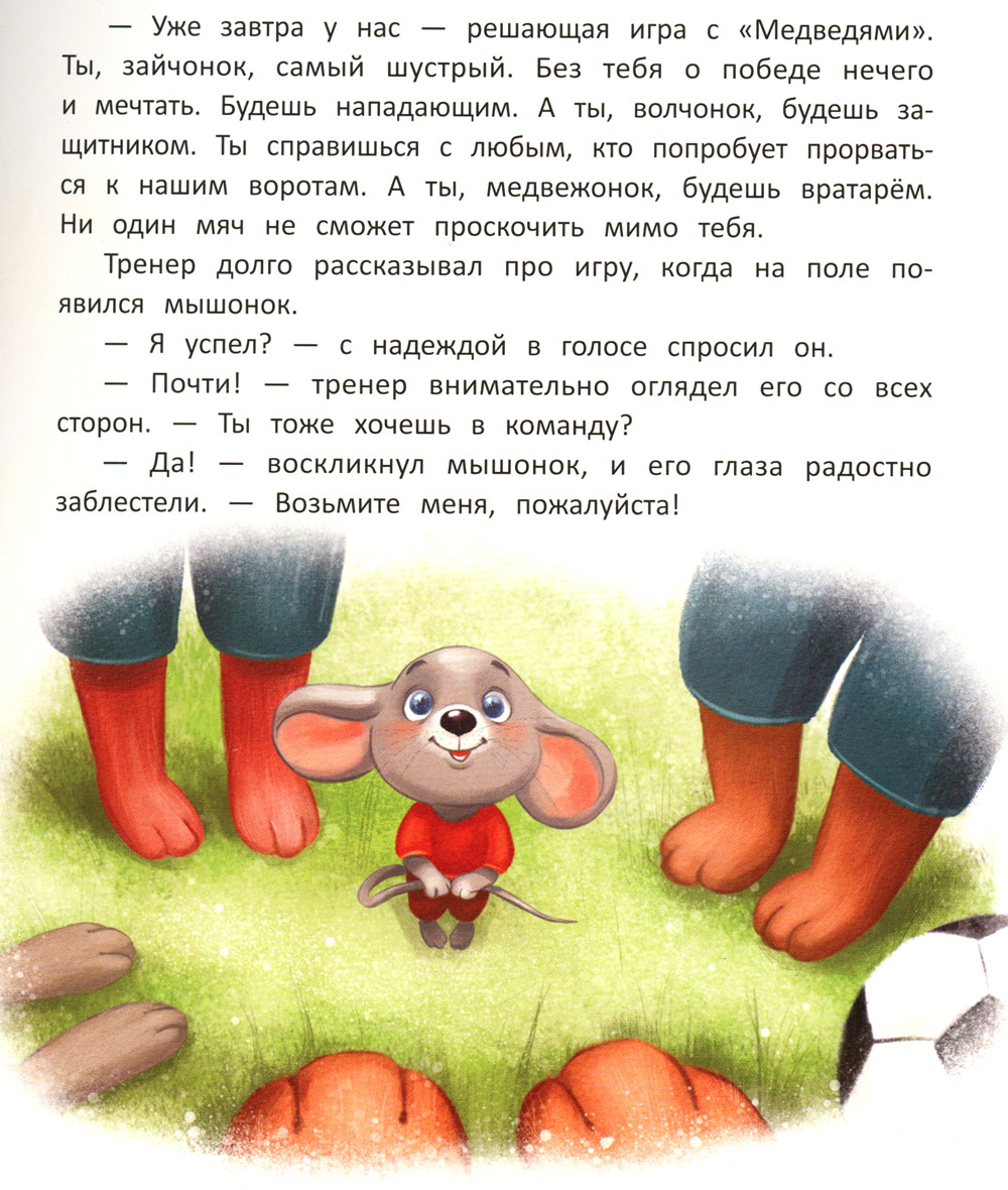 Мечта мышонка исполнилась - его взяли в футбольную команду. Однако на первой тренировке мышонок начал сомневаться в себе. Ведь он не умел бегать так же быстро, как заяц, и, в отличие от медвежонка, был очень маленьким и не мог защитить ворота. Только забив гол в решающем матче, мышонок понял, что у каждого есть свой талант и важно лишь то, сумеешь ли ты им воспользоваться!| Издательство | Феникс |