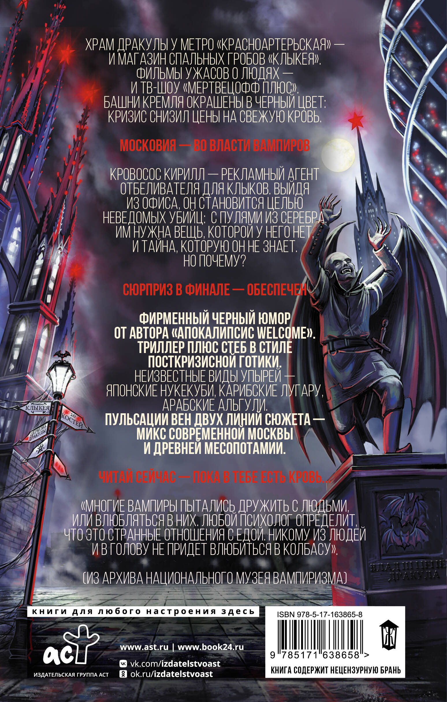 Храм Дракулы у метро "Красноартерьская" - и магазины спальных гробов "Клыкея". Фильмы ужасов о людях - и ТВ-шоу "Мертвецофф плюс". Башни Кремля окрашены в черный цвет: кризис снизил цены на свежую кровь. МОСКОВИЯ - ВО ВЛАСТИ ВАМПИРОВ. Кровосос Кирилл - рекламный агент отбеливателя для клыков. Выйдя из офиса, он становится целью неведомых убийц с пулями из серебра. Им нужна вещь, которой у него нет, - и тайна, которую он не знает. Но почему? СЮРПРИЗ В ФИНАЛЕ - ОБЕСПЕЧЕН. Фирменный черный юмор от автора "Апокалипсис Welkome". Триллер плюс стёб в стиле посткризисной готики. Неизвестные виды упырей - японские нукекуби, карибские лугару, арабские алыули. Пульсация вен двух линий сюжета - микс современной Москвы и Древней Месопотамии. ЧИТАЙ СЕЙЧАС - ПОКА В ТЕБЕ ЕСТЬ КРОВЬ…| Издательство | Издательство "АСТ" |