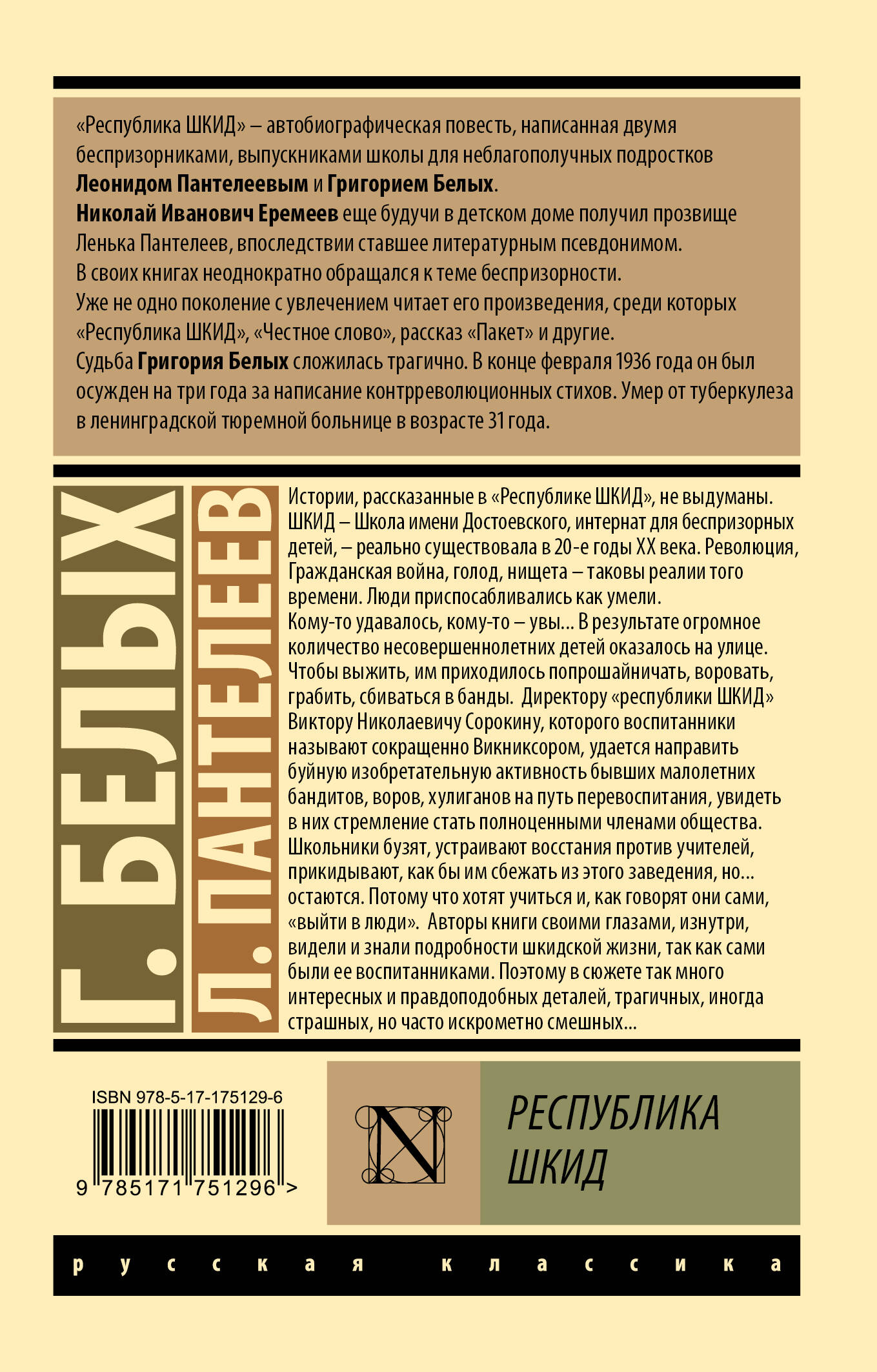 - Классика советской молодежной литературы. - Автобиографическая история взросления - авторы и сами провели несколько лет в Школе-интернате имени Достоевского, поэтому многие характеры и эпизоды, можно сказать, списаны с натуры. - В 1966 году на студии «Ленфильм» вышел одноименный фильм, главную роль в котором сыграл Сергей Юрский. - В 2013 году Министерство образования и науки Российской Федерации включило «Республику ШКИД» в список литературы, рекомендованной для самостоятельного изучения. - Издание в серии «Эксклюзив: Русская классика» - в удобном карманном формате и узнаваемом оформлении.| Издательство | Издательство "АСТ" |