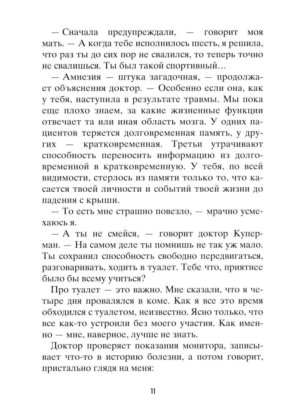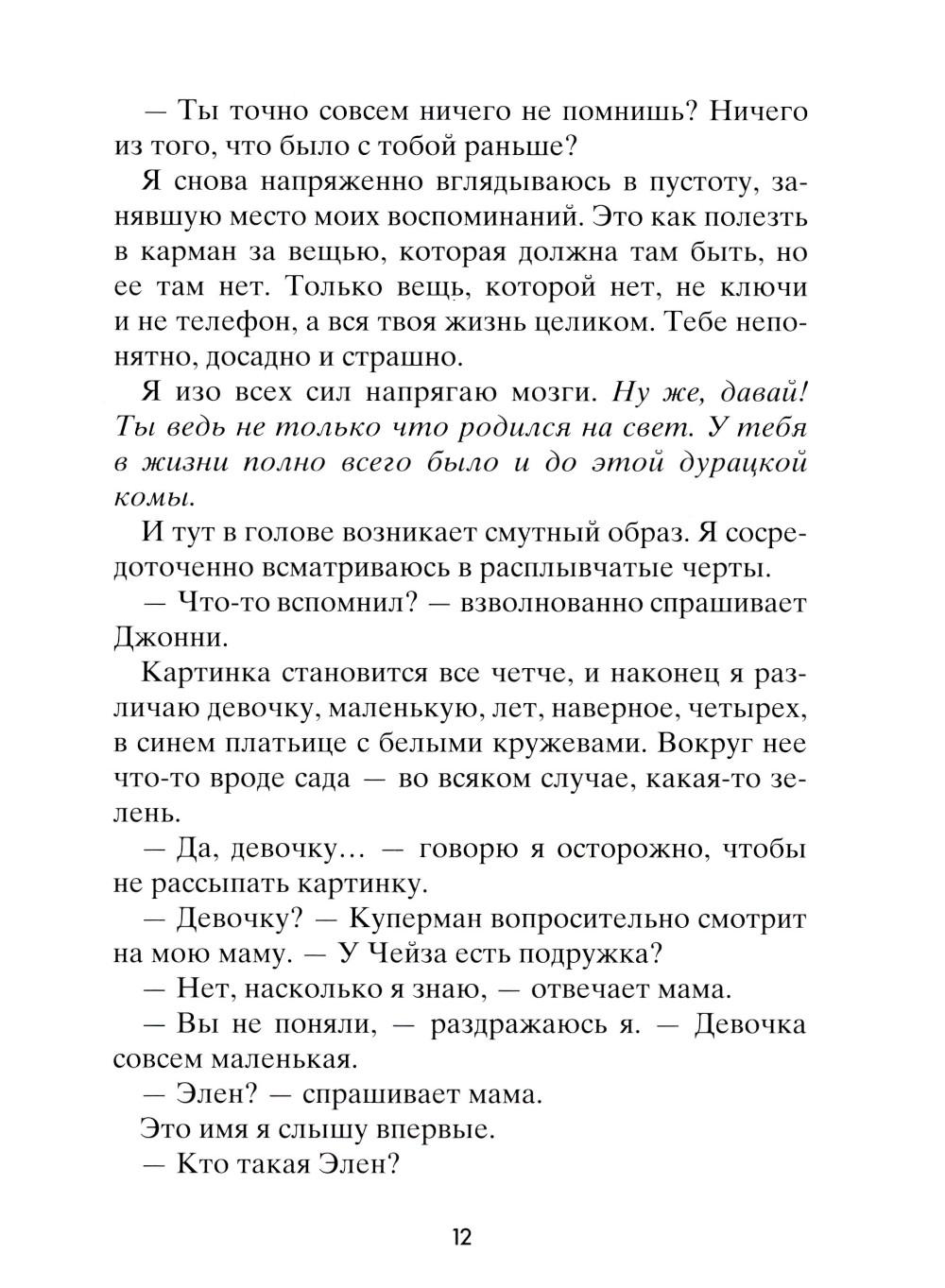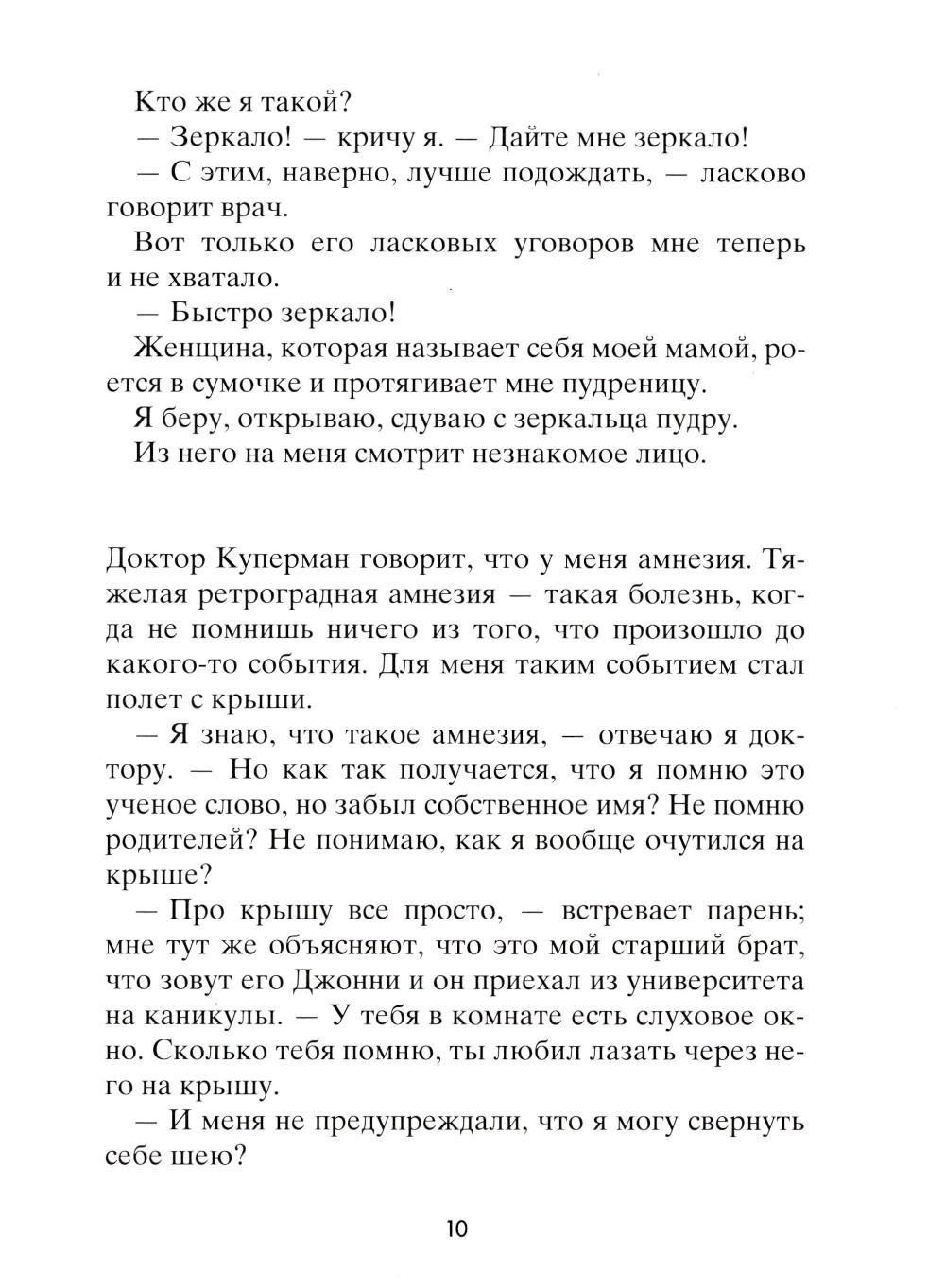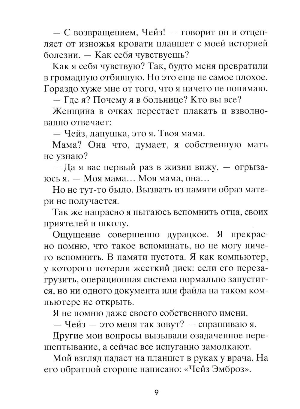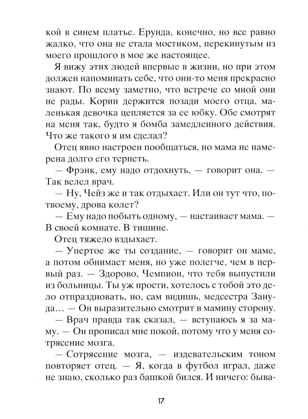 Чейз не помнит, зачем он полез на крышу, как и почему с нее упал. Просто в один прекрасный день он очнулся в больничной палате среди абсолютно незнакомых людей: мамы, брата, врача - и узнал от них, что его зовут Чейз Эмброз. Все, что произошло с ним за тринадцать лет жизни, словно корова языком слизала. Теперь ему предстоит узнать, что он за человек. Что любит, с кем дружит, как к нему относятся окружающие... И тут его ждет не самое приятное открытие: для одних школьников он герой, капитан суперуспешной футбольной команды, а для других - исчадие ада, ненавистный мучитель, бессовестный и жестокий. Но так ли важно, кем был Чейз Эмброз? Гораздо важнее понять, кто он сейчас и кем станет в будущем.| Издательство | Розовый жираф |