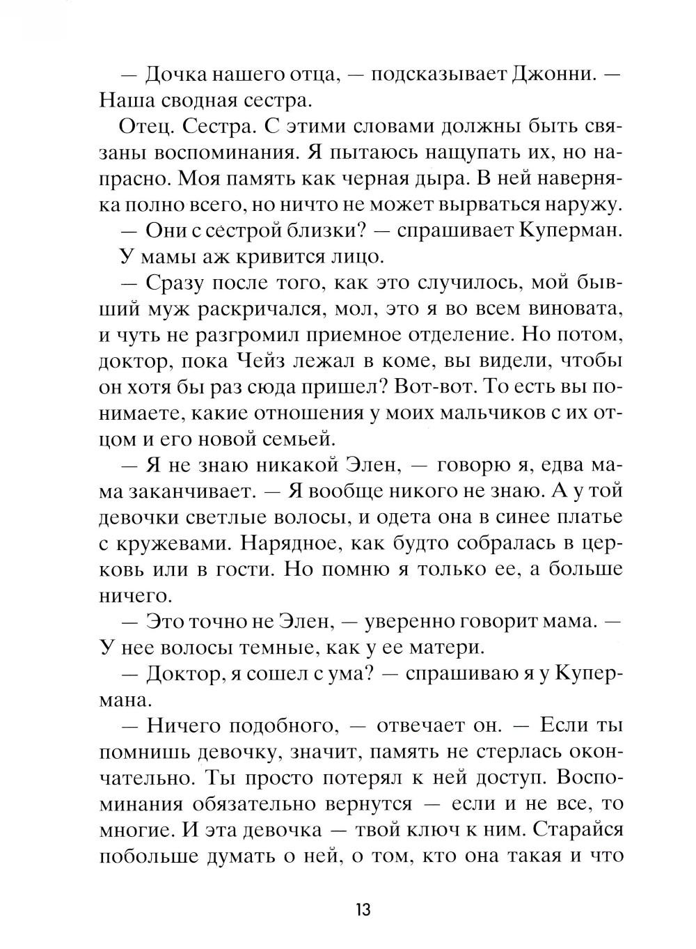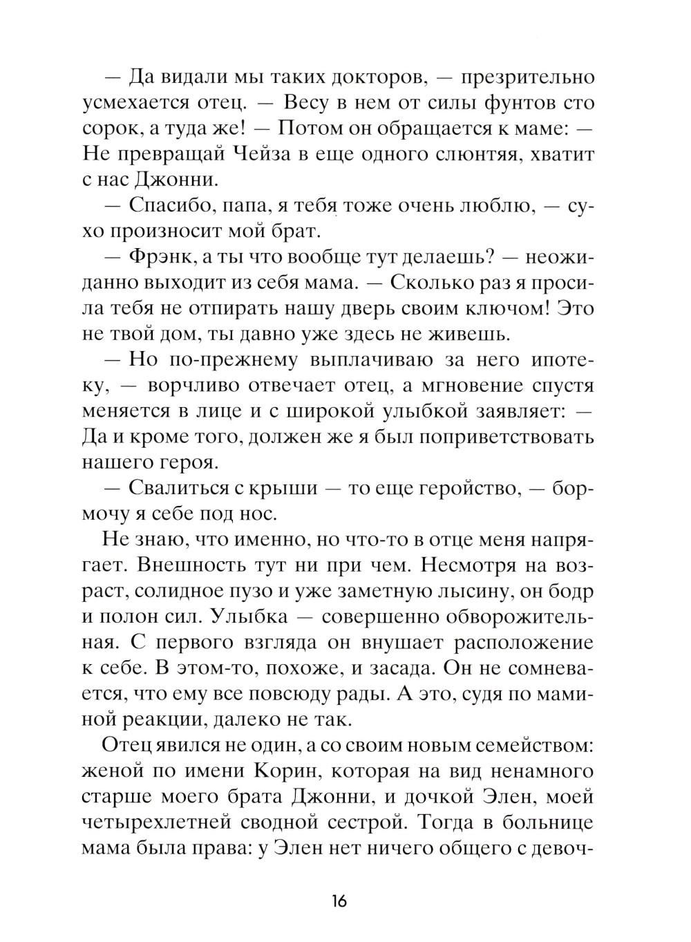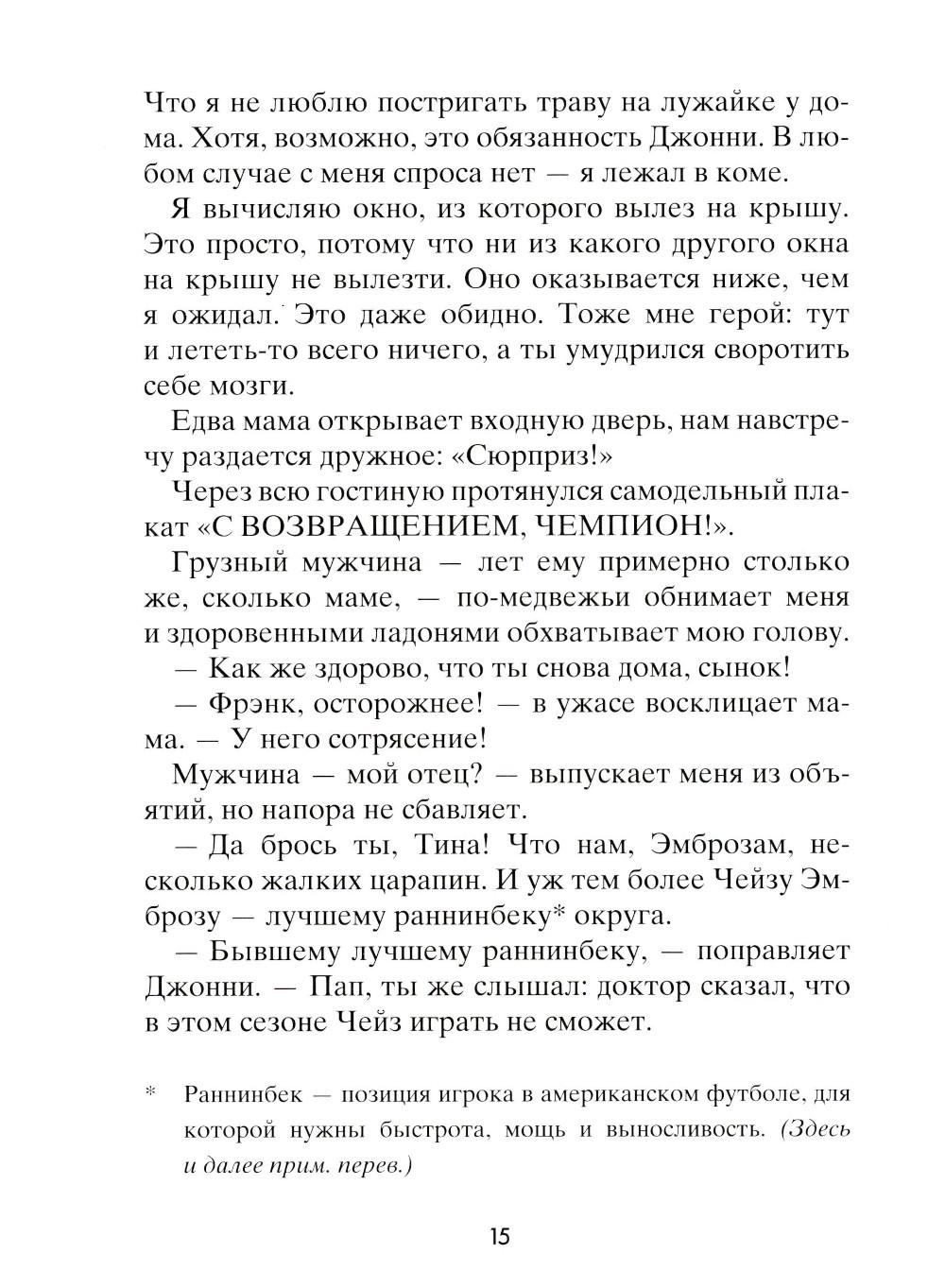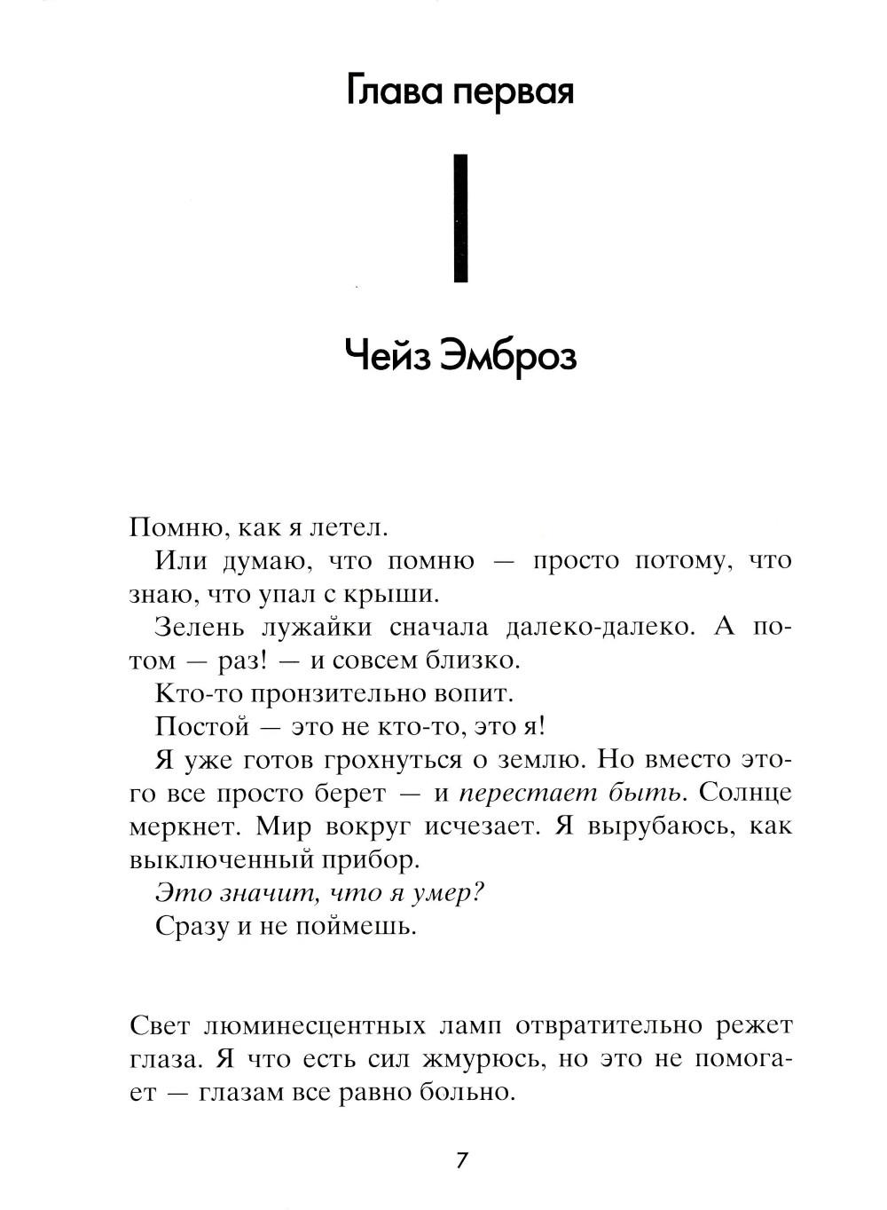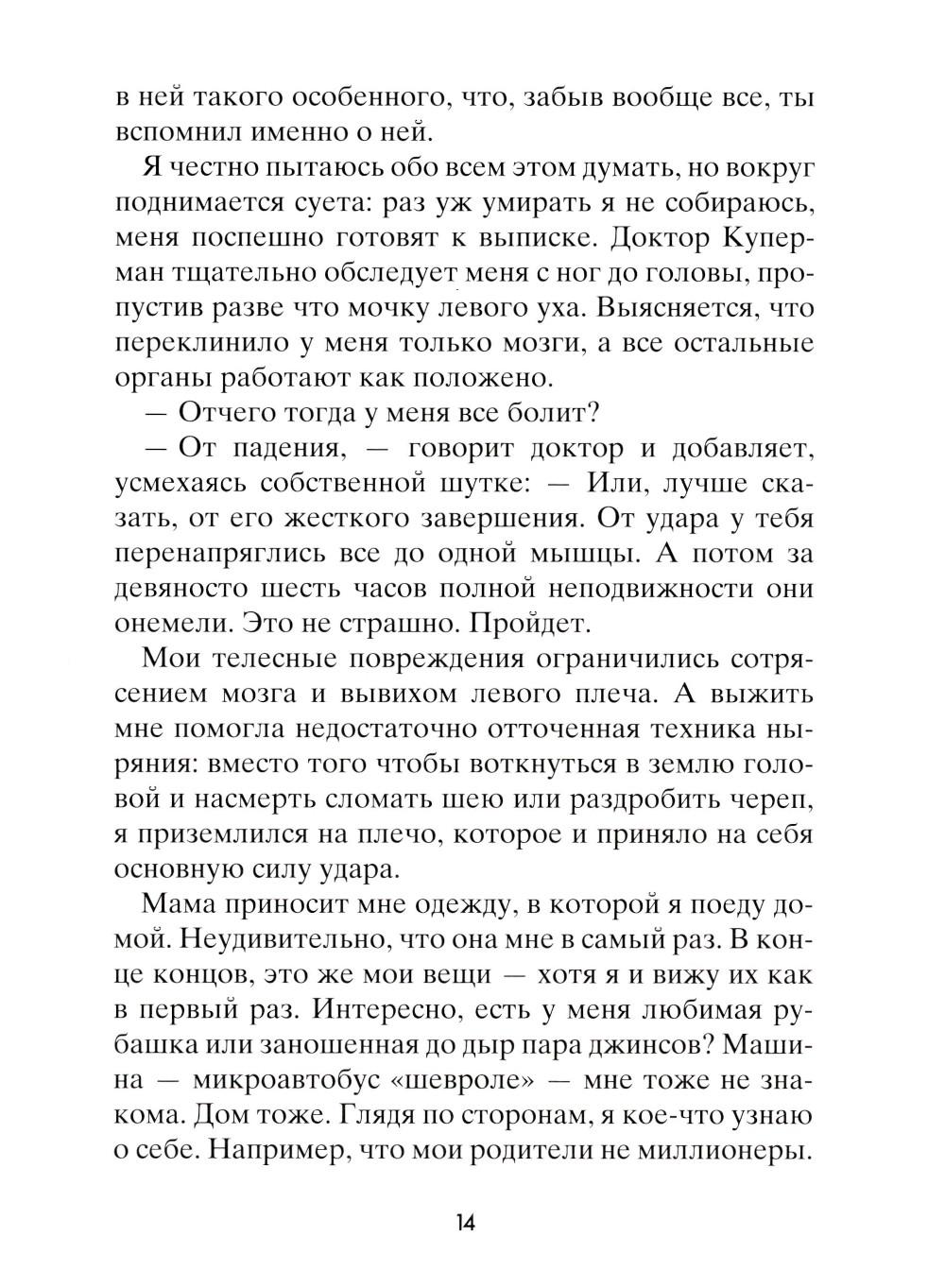 Чейз не помнит, зачем он полез на крышу, как и почему с нее упал. Просто в один прекрасный день он очнулся в больничной палате среди абсолютно незнакомых людей: мамы, брата, врача - и узнал от них, что его зовут Чейз Эмброз. Все, что произошло с ним за тринадцать лет жизни, словно корова языком слизала. Теперь ему предстоит узнать, что он за человек. Что любит, с кем дружит, как к нему относятся окружающие... И тут его ждет не самое приятное открытие: для одних школьников он герой, капитан суперуспешной футбольной команды, а для других - исчадие ада, ненавистный мучитель, бессовестный и жестокий. Но так ли важно, кем был Чейз Эмброз? Гораздо важнее понять, кто он сейчас и кем станет в будущем.| Издательство | Розовый жираф |