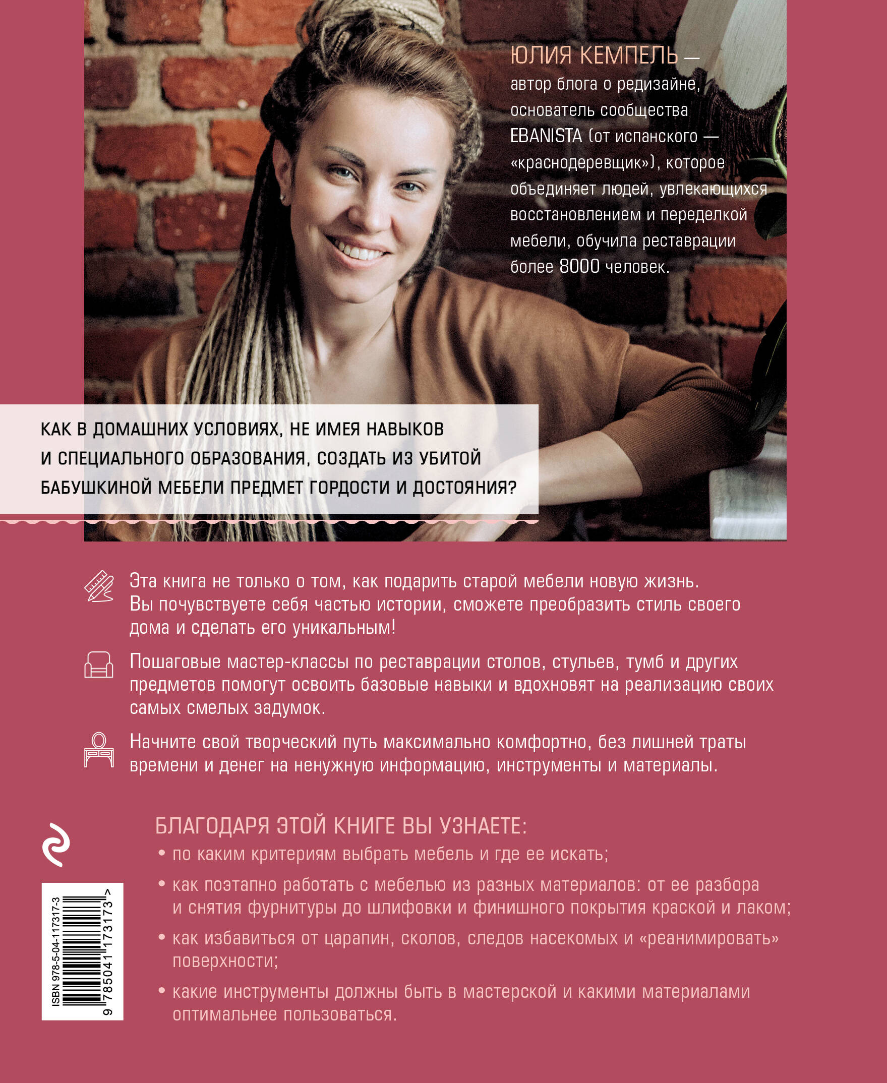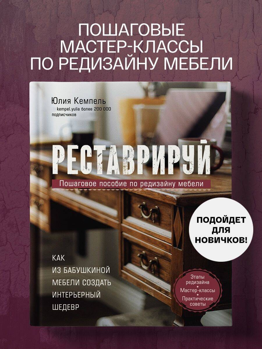 Редизайн мебели - это не только про «подарить старой мебели новую жизнь», это про «почувствовать себя частью истории и вершителем судеб», это про любовь внутри нас, про то, что вы хотите рассказать миру без лишних слов. В этой книге инстаграм-блогер @kempel.yulia на языке простого обывателя рассказывает о том, как можно в домашних условиях, не имея навыков и специального образования, создать из убитой бабушкиной мебели предмет гордости и достояния. Автор поможет сделать ваш творческий путь максимально комфортным, без лишней траты времени и денег на ненужную информацию, инструменты и материалы. Более 200 тысяч подписчиков активно используют рекомендации Юлии Кемпель и создают настоящие интерьерные шедевры! Вы узнаете, по каким критериям выбрать мебель и где ее искать, научитесь поэтапно работать с мебелью из разных материалов: от ее разбора и снятия фурнитуры до шлифовки и финишного покрытия краской и лаком. Пошаговые мастер-классы по редизайну столов, стульев, тумб и других предметов помогут освоить базовые навыки и вдохновят на реализацию своих самых смелых задумок!