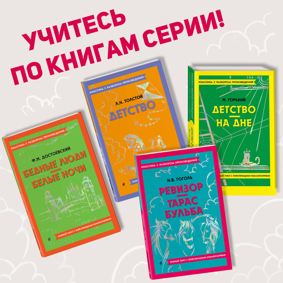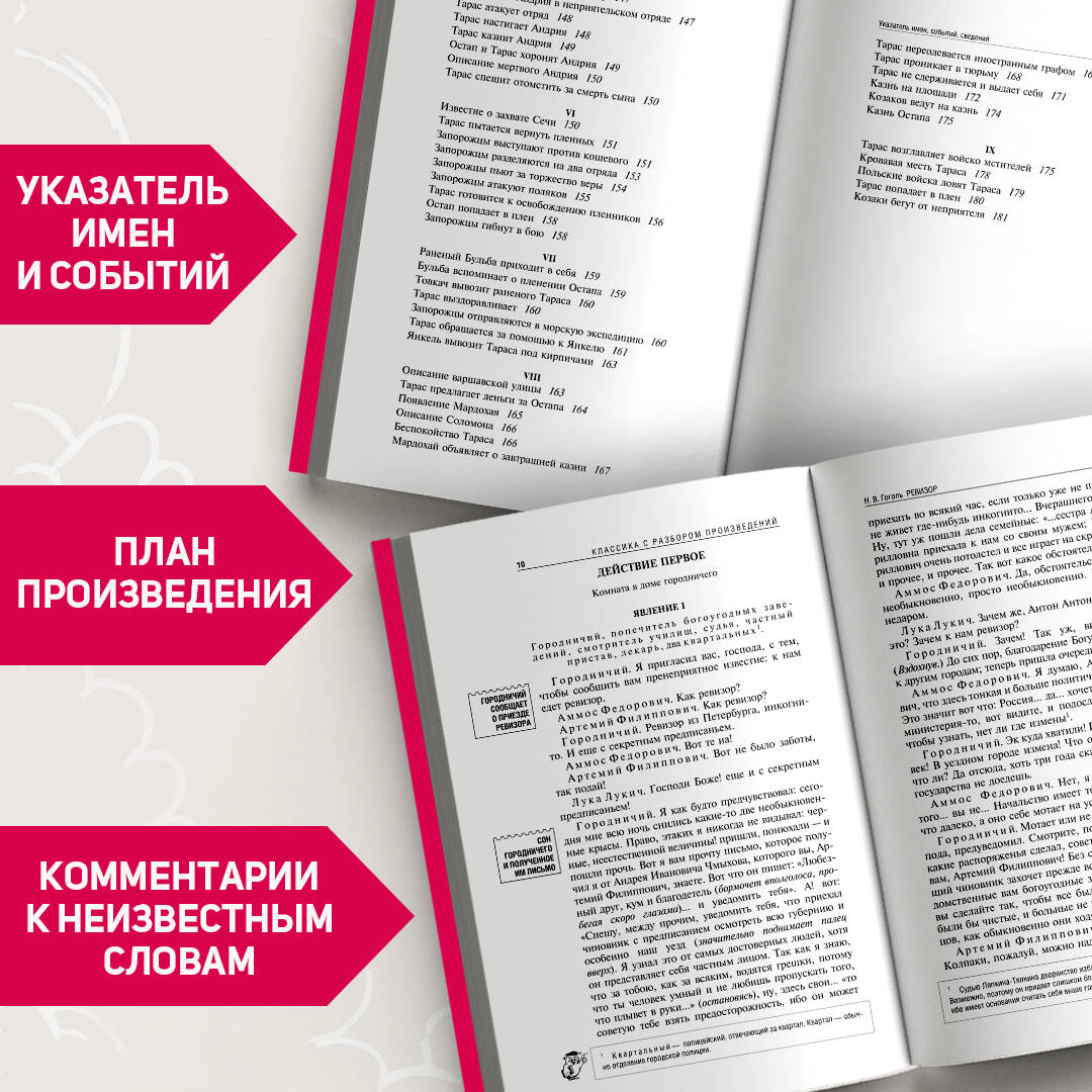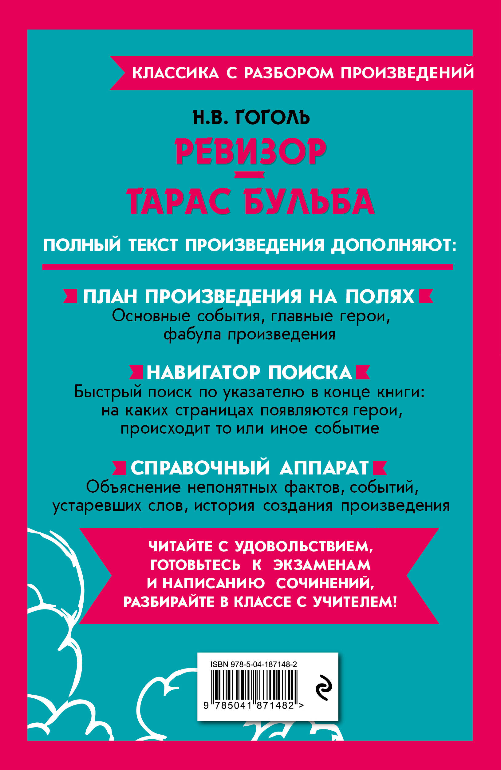 В сборник вошли легендарная пьеса «Ревизор» и повесть «Тарас Бульба», написанные выдающимся прозаиком и драматургом Н. В. Гоголем. Эти произведения русской литературы оголяют человеческие пороки и ставят вечные вопросы, поэтому до сих пор пользуются большой популярностью как среди школьников, так и среди представителей старшего поколения. Новое издание этих произведений в невероятном оформлении с голографической фольгой на обложке станет не только незаменимым помощником в подготовке к ЕГЭ, ОГЭ, урокам литературы, но и приятным подарком для всех ценителей классической литературы. В нем вы найдете уникальные справочные материалы: заметки на полях для быстрого поиска нужного фрагмента, развернутые комментарии, где объясняются устаревшие слова и непонятные факты, историю создания произведений, указатель имен и событий. Все это поможет не только быстро и легко подготовиться к экзаменам, но и узнать новые факты, которые можно было упустить на уроке. Комедия «Ревизор» рассказывает о жизни маленького провинциального городка и его обитателях, мирную жизнь которых однажды нарушила новость о приезде проверки из Петербурга. В персонажах пьесы автор заключил сатирическое изображение человеческих недостатков: трусости, лицемерия, алчности, показав, что проявление этих качеств никогда ни к чему хорошему не приводит. «Тарас Бульба» - историческая повесть, в которой описывается жизнь казацкого атамана Тараса Бульбы и его двух сыновей, Остапа и Андрея, во времена казацкого восстания 1637-1638 годов. Действие происходит на фоне эпических событий и ожесточенных битв, а само произведение затрагивает темы патриотизма, героизма и предательства. Собрание всех книг серии «Классика с разбором произведений» в стильных обложках станет невероятным украшением домашней библиотеки. Ее яркое оформление можно будет заслуженно назвать жемчужиной вашей коллекции.| Издательство | ООО "Издательство "Эксмо" |