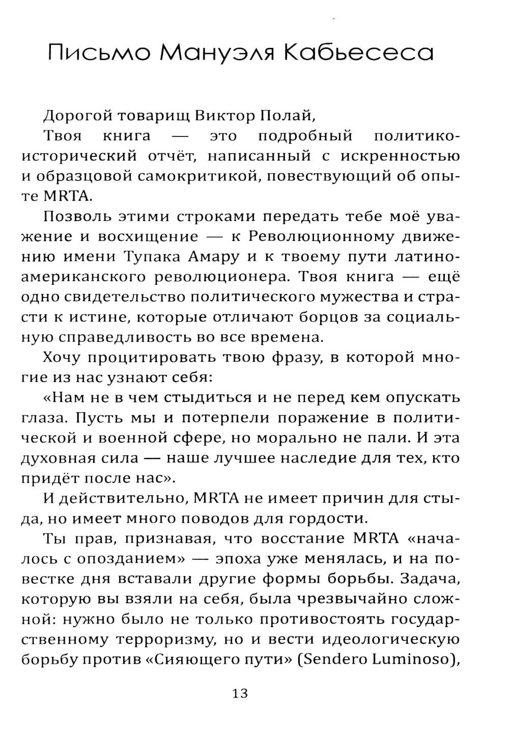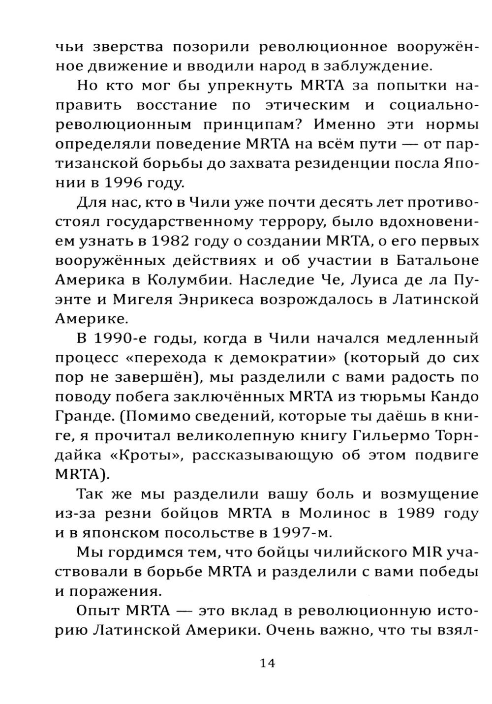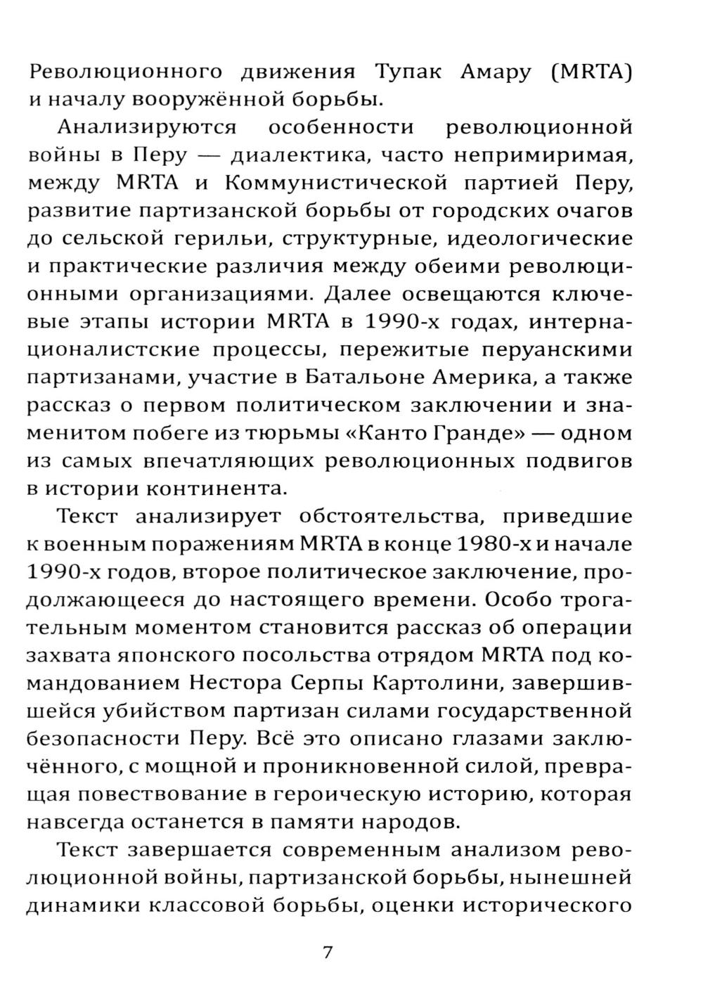Революционное движение Тупак Амару (MRTA) - одна из главных партизанских организаций Латинской Америки. На протяжении многих лет движение противостояло правому правительству и реакционным военным, которых поддерживали США. Организация запомнилась особо дерзкими вылазками и необычными операциями. Перу времён Гражданской войны вошло в историю как полигон для испытания новейших на тот момент вооружений и методик ведения войны. Там участвовали и американцы, и кубинцы, и даже японские ЧВК. Как следствие, конфликт приобрел очень самобытный и неповторимый характер. Обо всём этом можно прочитать в этой книге.| Издательство | Родина |