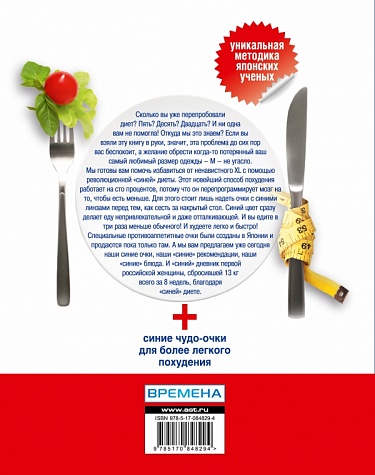 Сколько вы уже перепробовали диет? Пять? Десять? Двадцать? И ни одна вам не помогла! Откуда мы это знаем? Если вы взяли эту книгу в руки, значит, эта проблема до сих пор вас беспокоит, а желание обрести когда-то потерянный ваш самый любимый размер одежды - М - не угасло. Мы готовы вам помочь избавиться от ненавистного XL с помощью революционной «синей» диеты. Этот новейший способ похудения работает на сто процентов, потому что он перепрограммирует мозг на то, чтобы есть меньше. Для этого стоит лишь надеть очки с синими линзами перед тем, как сесть за накрытый стол. Синий цвет сразу делает еду непривлекательной и даже отталкивающей. И вы едите в три раза меньше обычного! И худеете легко и быстро! Специальные противоаппетитные очки были созданы в Японии и продаются пока только там. А мы вам предлагаем уже сегодня наши синие очки, наши «синие» рекомендации, наши «синие» блюда. И «синий» дневник первой российской женщины, сбросившей 13 кг всего за 8 недель, благодаря синей диете.