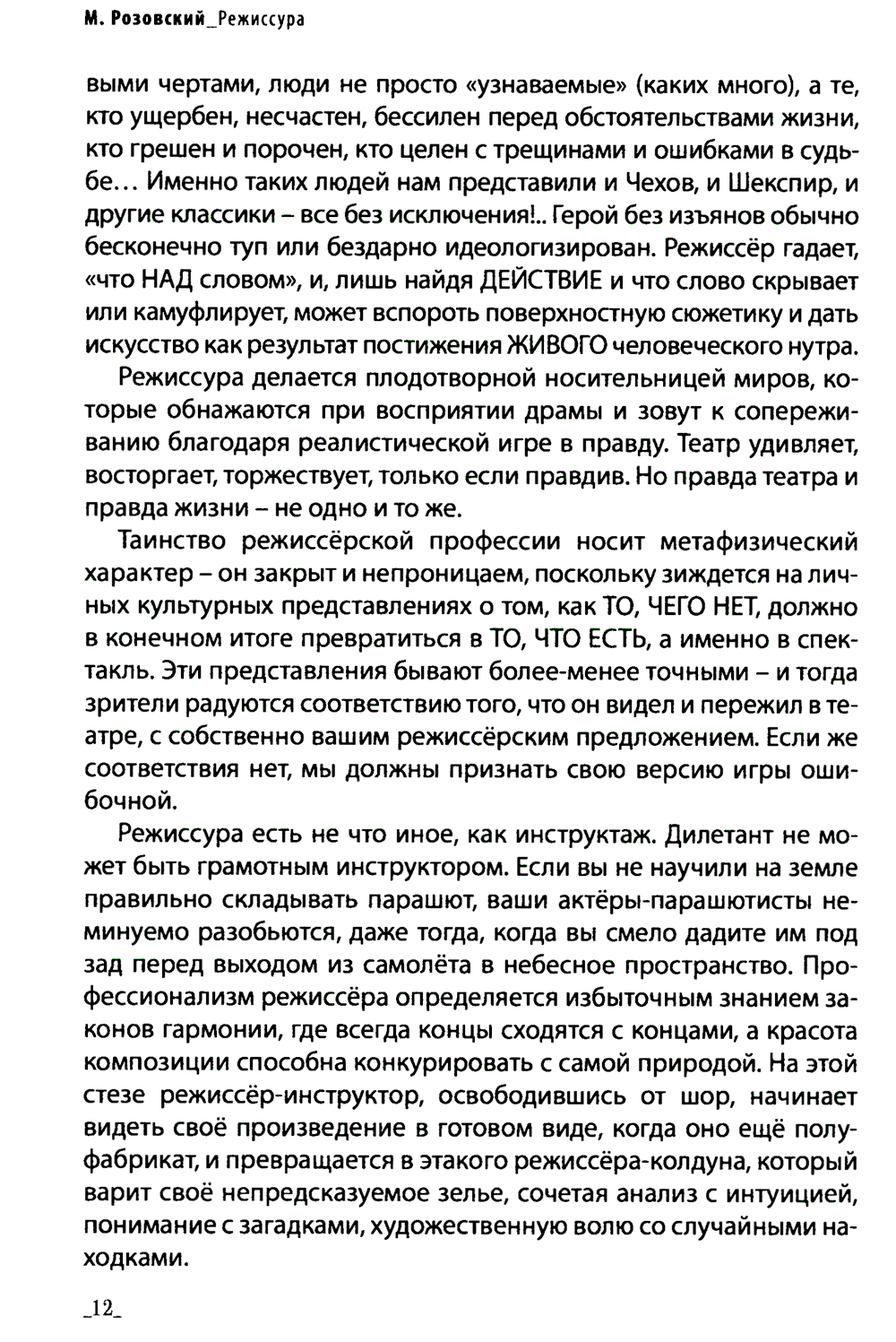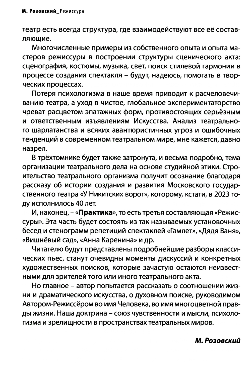 Трёхтомник профессора, народного артиста РФ Марка Розовского «РЕЖИССУРА. Школа. Метод. Практика» нельзя назвать в чистом виде учебным пособием, по которому можно во всех подробностях освоить эту сложнейшую профессию. Скорее, это личный опыт и размышления автора, создателя и художественного руководителя Московского государственного театра «У Никитских ворот», о путях постижения постановочного труда и актёрского искусства. Теория здесь будет соседствовать с практикой применения системы К.С. Станиславского, метода В.Э. Мейерхольда и других мастеров - без этой базы нет великого русского Театра, сочетающего глубинный психологизм, поиски смыслов и форм со стихией игры.| Издательство | ИПО "У Никитских ворот" |