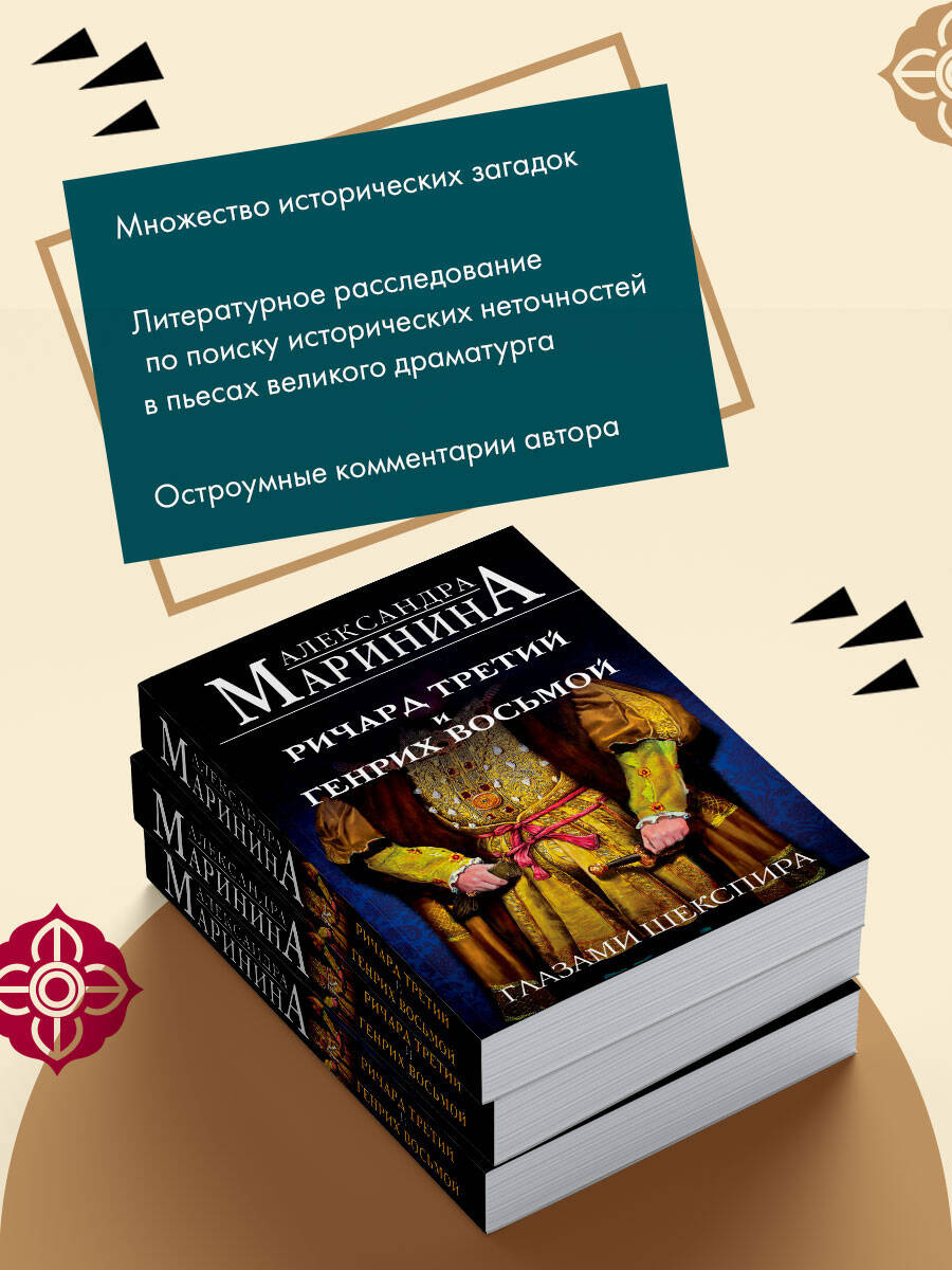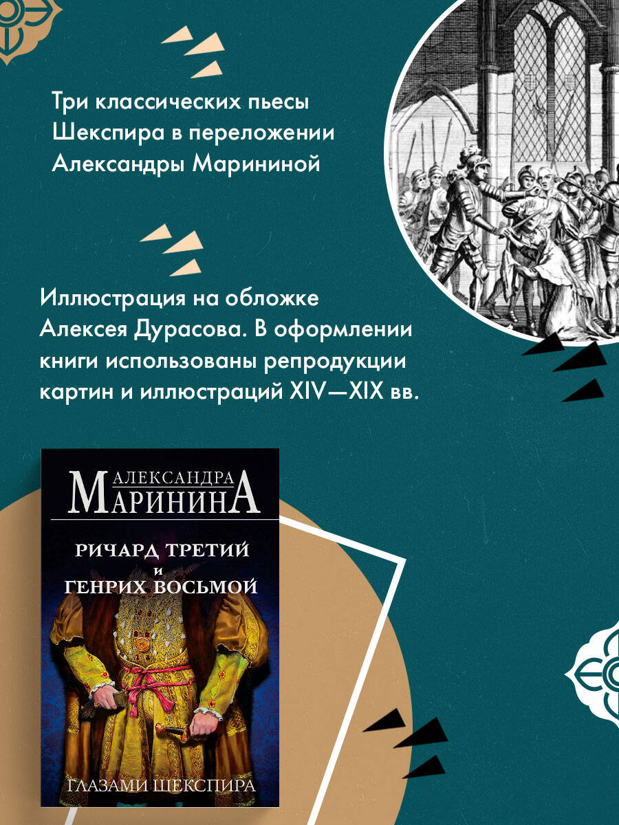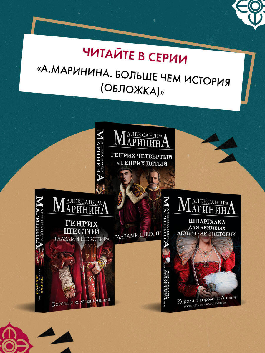 Расследование жизни и деяний двух самых опороченных и, возможно, наиболее предприимчивых королей Англии. Александра Маринина, изучив свидетельские показания самого Уильяма Шекспира, отвечает на вопрос, кому в памяти людской «повезло» больше: «детоубийце» Ричарду Третьему или «женоубийце» Генриху Восьмому? Малосимпатичный Ричард в тяжких кровавых трудах добыл себе трон, был постоянно занят войной и государственными хлопотами и в 32 года сгинул в Босуортской трясине. Его внучатый племянник, красавчик Генрих, родился принцем, воспитывался утонченными интеллектуалами и о царствовании не помышлял, потому что имел старшего брата. Но, став королем в 18 лет, до 55 лет развратничал, развлекался и ссорился с церковью. «Лед и пламень». Что может быть общего у этих двух людей - последнего рыцаря средневековой Англии и изнеженного покровителя британского Возрождения? Оказывается, многое… В новом историческом очерке Александра Маринина остроумно и увлекательно разбирает творчество гениального бытописца той эпохи - в фокусе внимания знаменитые трагедии Шекспира «Ричард Третий» и «Генрих Восьмой».| Издательство | ООО "Издательство "Эксмо" |