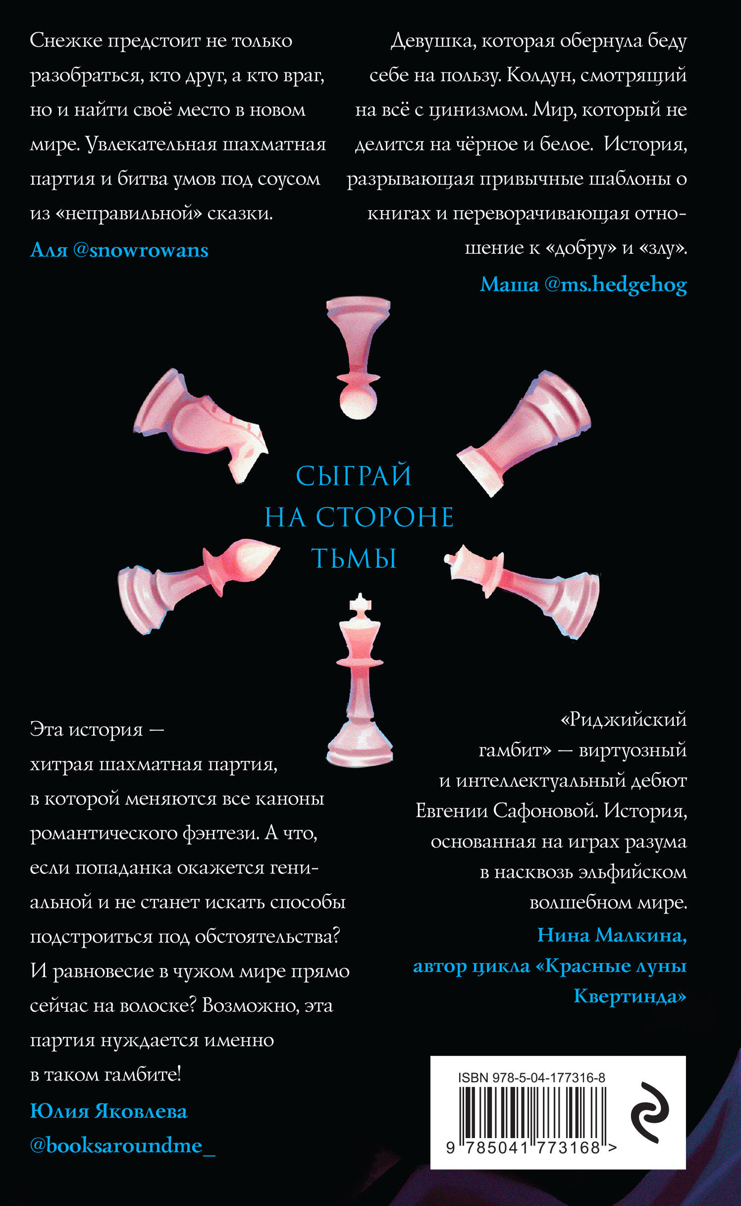 Шахматный гений, хакер, геймер, ботан и очкарик - это Снежка. Она колючая и серьёзная, недоверчивая и мстительная. Она не верит в сказки, но попадает в одну из них. Только вместо прекрасного принца, магического дара и звания Избранной ей достаётся участь спутницы романтической героини и куклы колдуна. А ещё мир на грани войны, рабский ошейник, тюрьма жестоких Тёмных и совсем не светлые Светлые. Снежка вступает в главную игру своей жизни, где ставка - выживание и свобода. Но сможет ли она выиграть в этой партии, располагая лишь собственным интеллектом? Ведь когда всё вокруг оборачивается не тем, чем кажется, это круто меняет правила. Как и симпатия к игроку по ту сторону доски... Первая книга дилогии «Риджийский гамбит» Евгении Сафоновой, автора цикла «Сага о Форбиденах» и дилогии «Некроманс». Магический мир оказывается совсем не таким, как в книгах, хотя здесь тоже идет своя игра, и ставка в ней - жизнь. Враг, которого хочется уважать, противник, которого стоит опасаться, - и человек, чье присутствие заставляет сердце биться быстрее. Слишком опасное сочетание, чтобы все сложилось просто. Яркая запоминающаяся героиня и неожиданный взгляд на привычный сюжет.История, опровергающая все каноны жанра и смеющаяся над клише. Издание дополнено иллюстрациями популярной художницы Полины Граф.| Издательство | ООО "Издательство "Эксмо" |