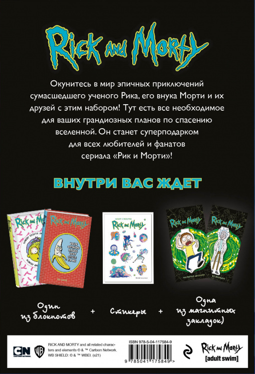 Комплект в коробе с лицензионной продукцией по вселенной с любимыми персонажами крутого мультсериала! Внутри вас ждут: красочный блокнот, набор улетных стикеров и фигурная магнитная закладка. Все это упаковано в удобный и красивый короб. Отличный подарок для поклонников «Рик и Морти»!| Издательство | Эксмо |