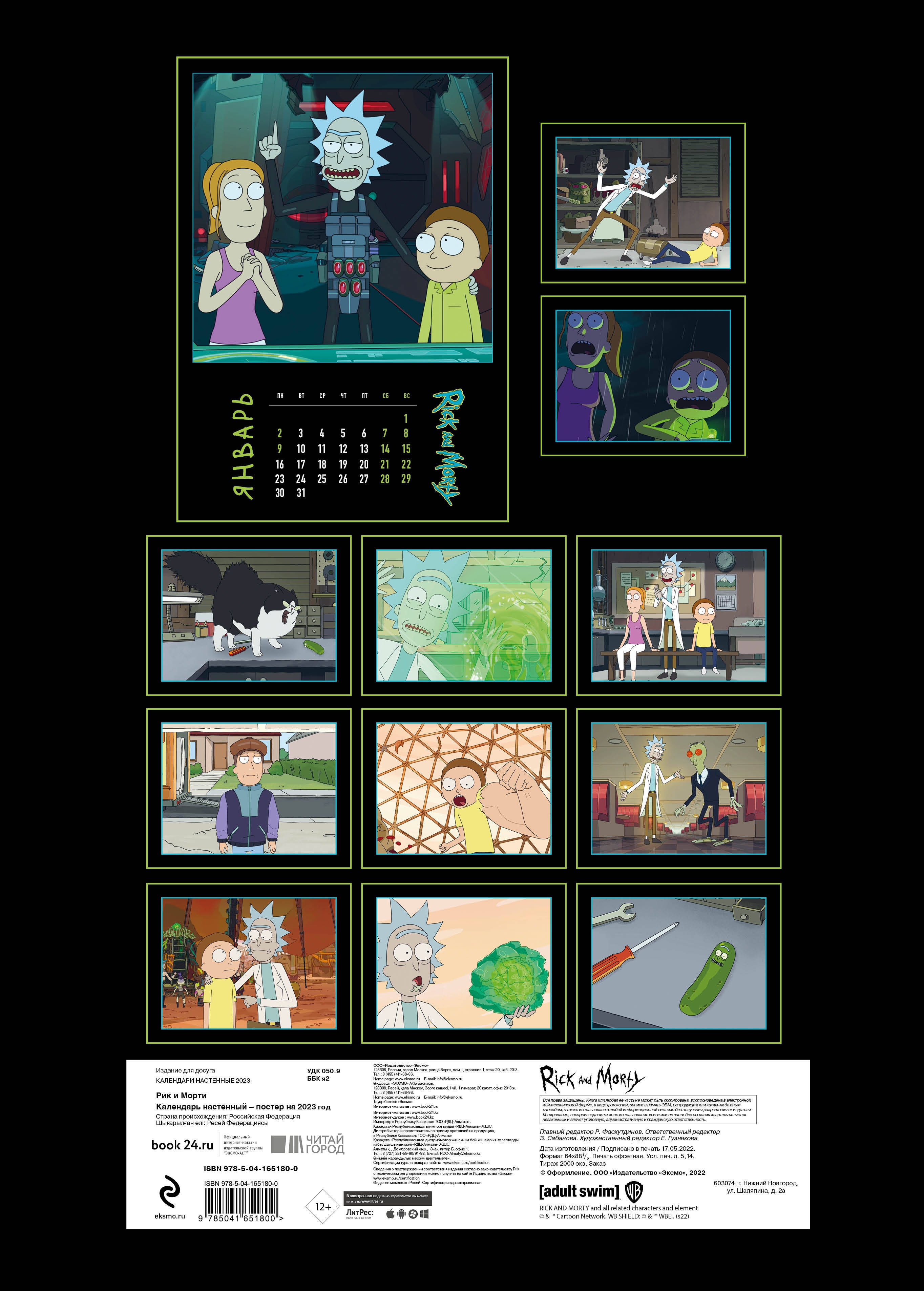 О серии: Наши настенные календари отличаются высоким качеством исполнения! Тщательно подобранные иллюстрации, напечатанные на глянцевой бумаге высочайшего качества, станут настоящим украшением дома, а в календарной сетке найдется место для ваших планов: большие клетки позволят делать записи и организовать свой год! В календаре также отмечены все государственные праздники. В серии настенных календарей издательства «ЭКСМО» каждый найдет тему по вкусу: великие художники, великолепные подборки с самыми знаменитыми произведениями искусства, легендарные кинематографические саги и игры, главные книжные авторы и бестселлеры, фотографии и иллюстрации любимых животных и многое-многое другое! О календаре: МЕГАФРАНШИЗА! Мультсериал с огромной фанатской аудиторией! Наконец-то в России! Проведи весь год с Риком и Морти! Отличное полиграфическое исполнение, большой постерный формат (315х440 мм) и удобная сетка, в которой отмечены все государственные праздники, - все это будет дарить тебе такие незабываемые эмоции каждый день, что ты не заметишь, как пролетит целый год! НЕ ЖДИ РИКА И МОРТИ - СПАСИ СВОЮ ВСЕЛЕННУЮ САМ! Технические параметры: Тип календаря - настенный перекидной Год - 2023 Календарная сетка - с разбивкой по месяцам Вид скрепления - скрепка Ширина - 31,5 см Высота - 44 см Внутренний блок - мелованная бумага 200 г/м2 Подложка - плотный гофрокартон для поддержания формы Индивидуальная упаковка в плотный целлофановый пакет| Издательство | Эксмо |