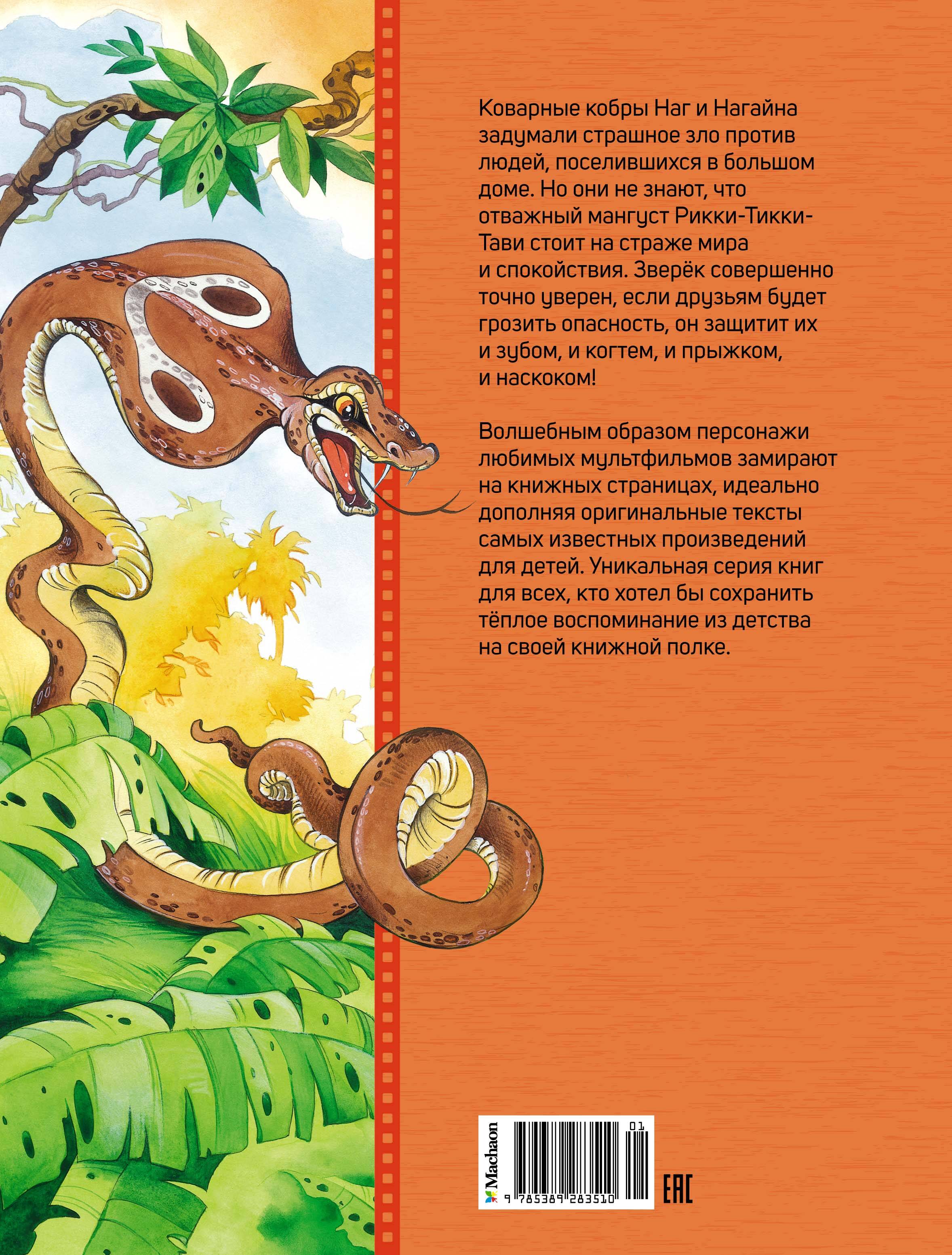 Коварные кобры Наг и Нагайна задумали страшное зло против людей, поселившихся в большом доме. Но они не знают, что отважный мангуст Рикки-Тикки-Тави стоит на страже мира и спокойствия. Зверёк совершенно точно уверен, если друзьям будет грозить опасность, он защитит их и зубом, и когтем, и прыжком, и наскоком! Волшебным образом персонажи любимых мультфильмов замирают на книжных страницах, идеально дополняя оригинальные тексты самых известных произведений для детей. Уникальная серия книг для всех, кто хотел бы сохранить тёплое воспоминание из детства на своей книжной полке. Эта серия - прекрасная классика для детей, которая идеально подойдет как для внеклассного чтения, так и в качестве подарка на окончание учебного года. Все книги выходят с красивыми цветными иллюстрациями на белой плотной бумаге.| Издательство | Издательство АЗБУКА ООО |