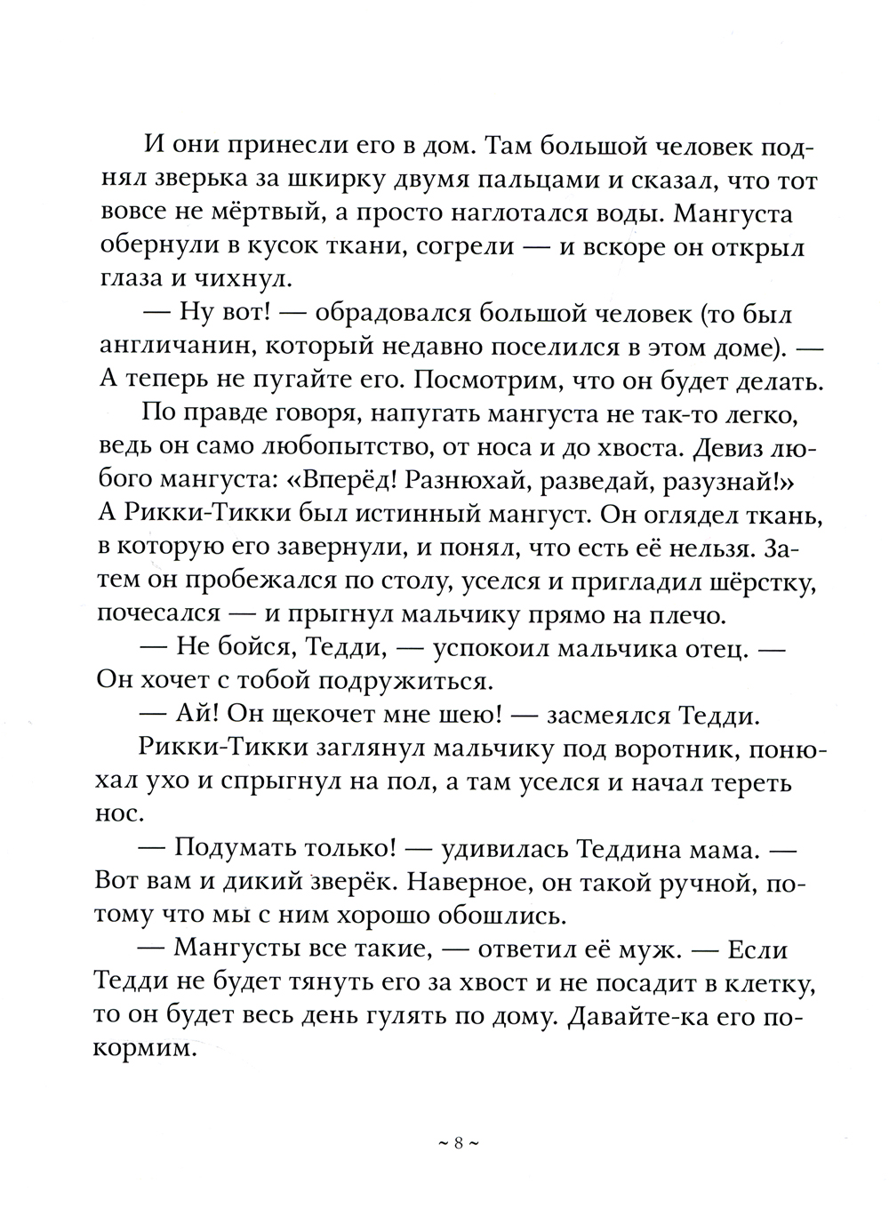 Сказка о великой битве, в которой молодой мангуст в одиночку сражался с двумя огромными кобрами, вот уже свыше ста лет восхищает читателей по всему миру. В этом издании она предстаёт в новом переводе и с новыми современными иллюстрациями.| Издательство | Городец |