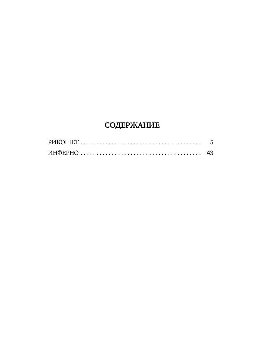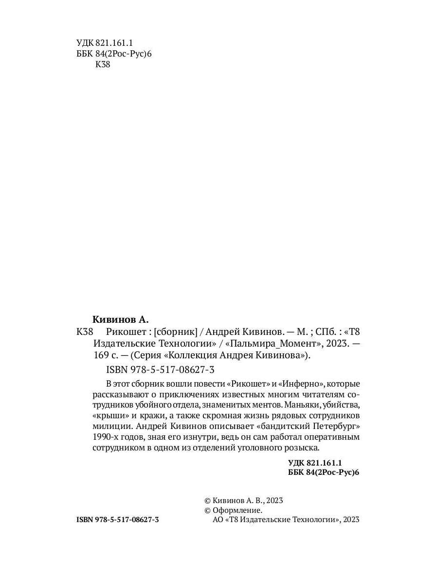 В этот сборник вошли повести "Рикошет" и "Инферно", которые рассказывают о приключениях известных многим читателям сотрудников убойного отдела, знаменитых ментов. Маньяки, убийства, "крыши" и кражи, а также скромная жизнь рядовых сотрудников милиции. Андрей Кивинов описывает "бандитский Петербург" 1990-х годов, зная его изнутри, ведь он сам работал оперативным сотрудником в одном из отделений уголовного розыска.