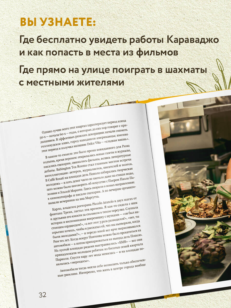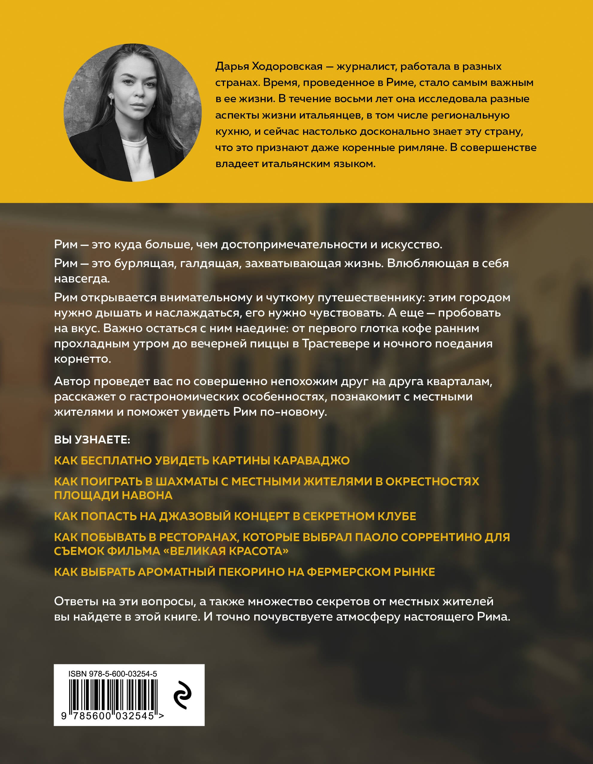 Рим - это куда больше, чем достопримечательности и искусство. Рим - это бурлящая, галдящая, захватывающая жизнь. Влюбляющая в себя навсегда. Рим открывается внимательному и чуткому путешественнику: этим городом нужно дышать и наслаждаться, его нужно чувствовать. А еще - пробовать на вкус. Важно остаться с ним наедине: от первого глотка кофе ранним прохладным утром до вечерней пиццы в Трастевере и ночного поедания корнетто. Автор проведет вас по совершенно не похожим друг на друга кварталам, расскажет о гастрономических особенностях, познакомит с местными жителями и поможет увидеть Рим по-новому. - Как бесплатно увидеть картины Караваджо. - Как поиграть в шахматы с местными жителями в окрестностях площади Навона. - Как попасть на джазовый концерт в секретном клубе. - Как побывать в ресторанах, которые выбрал Паоло Соррентино для съемок фильма «Великая красота». - Как выбрать ароматный пекорино на фермерском рынке. Ответы на эти вопросы, а так же множество секретов от местных жителей, вы найдете в этой книге. И точно почувствуете атмосферу настоящего Рима.| Издательство | Эксмо |