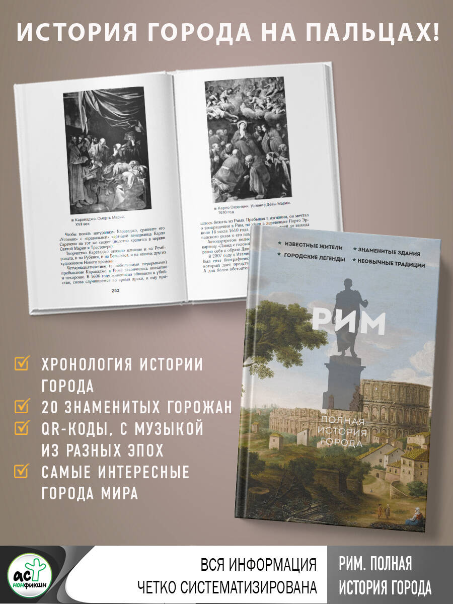 Вечный город! "Вечным" его называли еще в I веке до нашей эры, когда ему было около семисот лет. Столица Италии неумолимо приближается к празднованию своего 2800-летия, которое состоится в апреле 2047 года. В наше стремительное время существуют обзорные экскурсии "Весь Рим за один день". Но провести в Риме всего день и что-то понять невозможно - все равно, что выучить за день весь курс высшей математики. Не обольщайтесь и не будете разочарованы. Рим открывается не сразу и открывается только сведущим. Открывается и затягивает. Как писал Стендаль: "Можно соскучиться на втором месяце пребывания в Риме, но никак не на шестом, а если вы пробудете здесь год, то вас посетит мысль остаться здесь навсегда". Серия "История города на пальцах" посвящена самым знаменитым городам мира. На страницах каждой книги собраны самые важные и неожиданные факты об истории, культуре, о повседневной жизни горожан в разные эпохи, о музыке, звучащей сквозь века. Вся информация четко систематизирована. Забавные и интересные факты легко запомнить и пересказать друзьям. Книга пригодится и путешественникам, и тем, кто хочет лучше знать свою историю. В каждой книге вы найдете: • Хронологию истории города • 20 знаменитых горожан • QR-коды, с музыкой из разных эпох.| Издательство | Издательство "АСТ" |