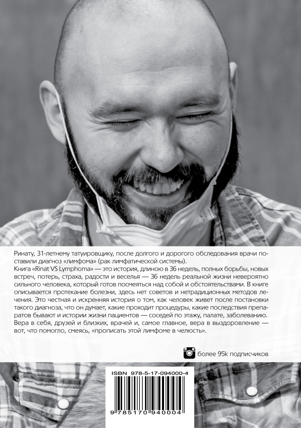 Книга «Rinat VS Lymphoma» - это история, длиною в 36 недель, полных борьбы, новых встреч, потерь, страха, радости и веселья - 36 недель реальной жизни невероятно сильного человека, который готов посмеяться над собой и обстоятельствами. В книге описывается протекание болезни, здесь нет советов и нетрадиционных методов лечения. Это честная и искренняя история о том, как человек живет после постановки такого диагноза, что он думает, какие проходит процедуры, какие последствия препаратов бывают и истории жизни пациентов-соседей по этажу, палате, заболеванию.