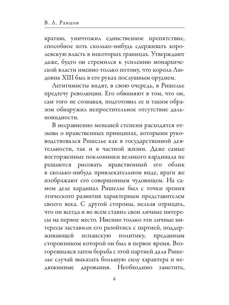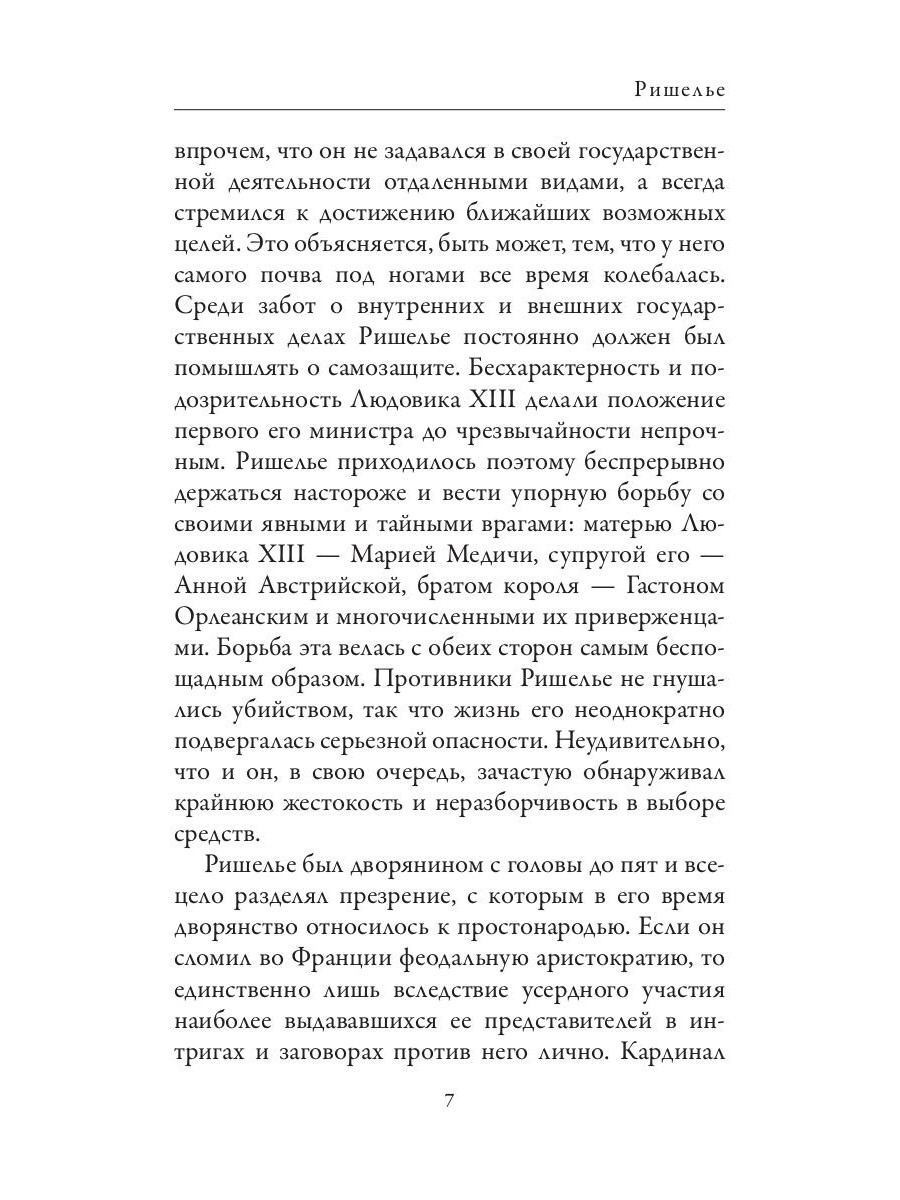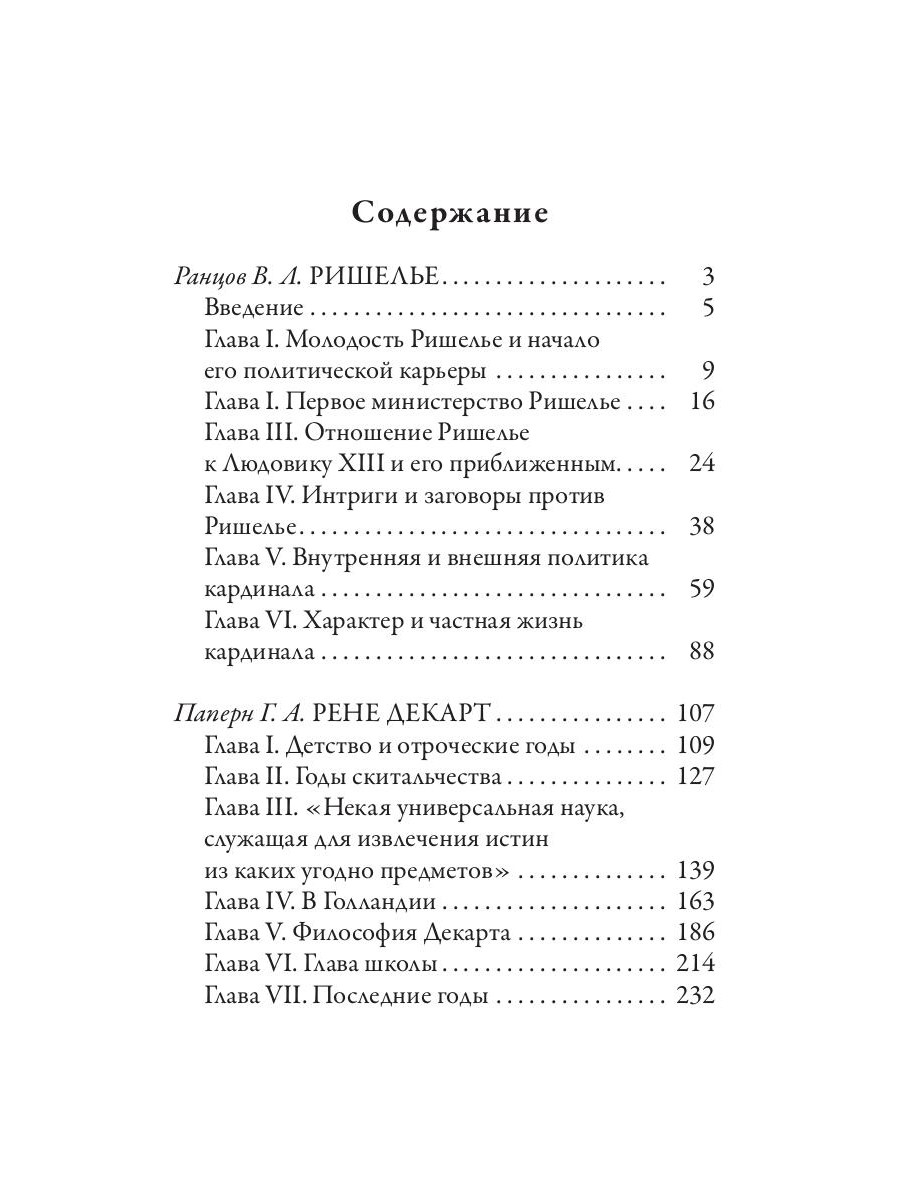 Ришелье. Исторические деятели, на долю которых выпадает эпоха смены порядков, без сомнения, не могут надеяться на справедливую оценку со стороны современников. Поэтому неудивительно, что кардинал Ришелье был при жизни и в первое время после смерти объектом то величайших похвал, то самых жестоких порицаний. Протестантские писатели не признают в нем ни талантов, ни даже способностей, умышленно закрывают глаза на услуги, оказанные им Франции. Католикам Ришелье представляется, в свою очередь, гениальнейшим государственным деятелем, одаренным политической мудростью, беспримерной в летописях истории. Рене Декарт. Математик, философ, физиолог, механик и физик, чьи идеи и открытия сыграли большую роль в развитии сразу нескольких научных отраслей. Он разработал алгебраическую символику, которую мы используем и по сей день, стал «отцом» аналитической геометрии, заложил основы для становления рефлексологии, создал механицизм в физике и это далеко не все его достижения. Интересна и взаимосвязь реакции кардинала Ришелье на поиски, в том числе духовные, великого мыслителя.| Издательство | Рипол Классик |