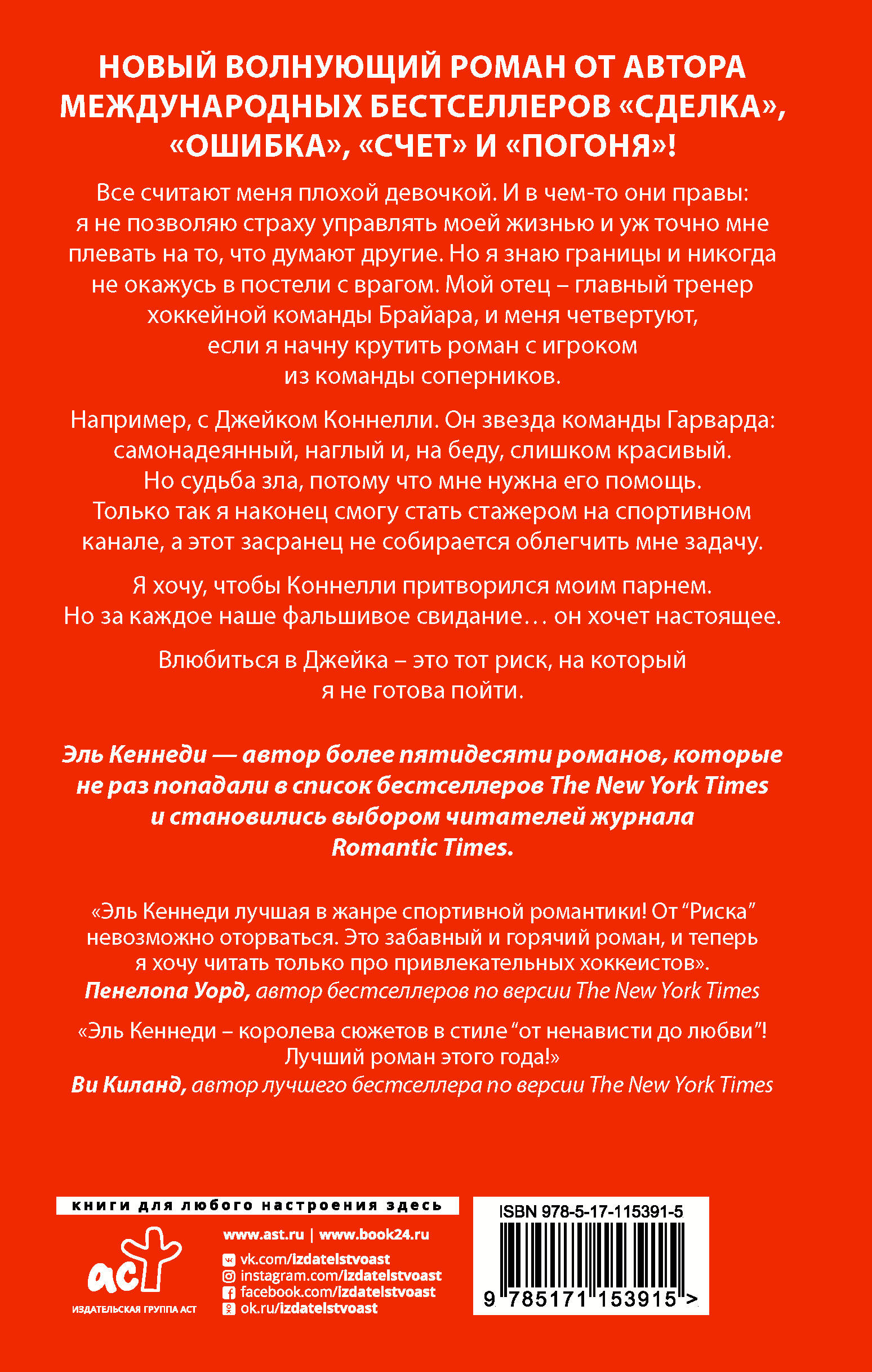 Все считают меня плохой девочкой. И в чем-то они правы: я не позволяю страху управлять моей жизнью и уж точно мне плевать на то, что думают другие. Но я знаю границы и никог- да не окажусь в постели с врагом. Мой отец - главный тренер хоккейной команды Брайара, и меня четвертуют, если я начну крутить роман с игроком из команды соперников. Например, с Джейком Коннелли. Он звезда команды Гар- варда: самонадеянный, наглый и, на беду, слишком красивый. Но судьба зла, потому что мне нужна его помощь. Только так я наконец смогу стать стажёром на спортивном канале, а этот засранец не собирается облегчить мне задачу. Я хочу, чтобы Коннелли притворился моим парнем. Но за каждое наше фальшивое свидание… он хочет насто- ящее. Влюбиться в Джейка - это тот риск, на который я не гото- ва пойти.| Издательство | Издательство "АСТ" |