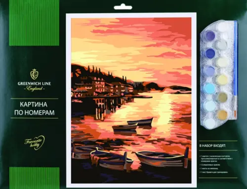 В наборе: картон с нанесенным контуром, акриловые краски в пронумерованных баночках по 3 мл - 12 цветов, кисти 2 штуки, лист для тренировки с рекомендациями по работе.